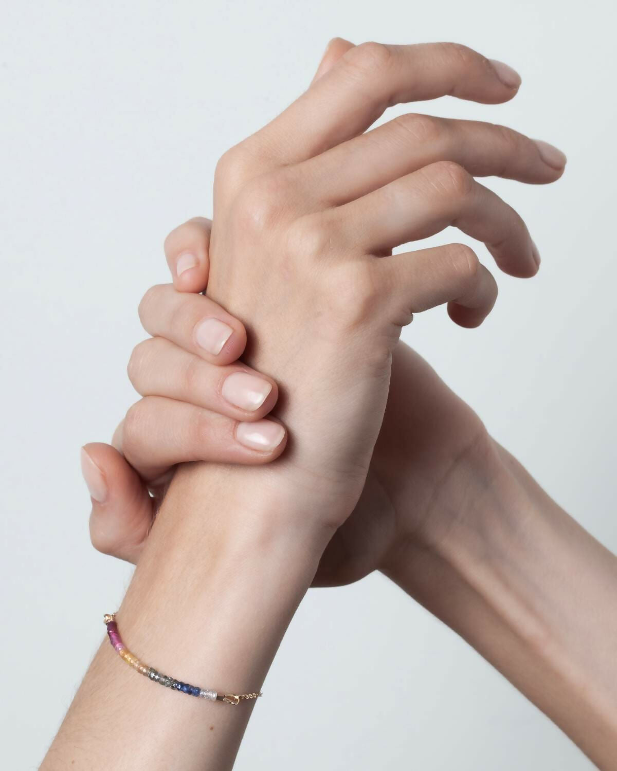 Die Edelsteine für das Armband werden in Atelier Paulin's Pariser Atelier ausgewählt und von Hand zusammengesetzt.