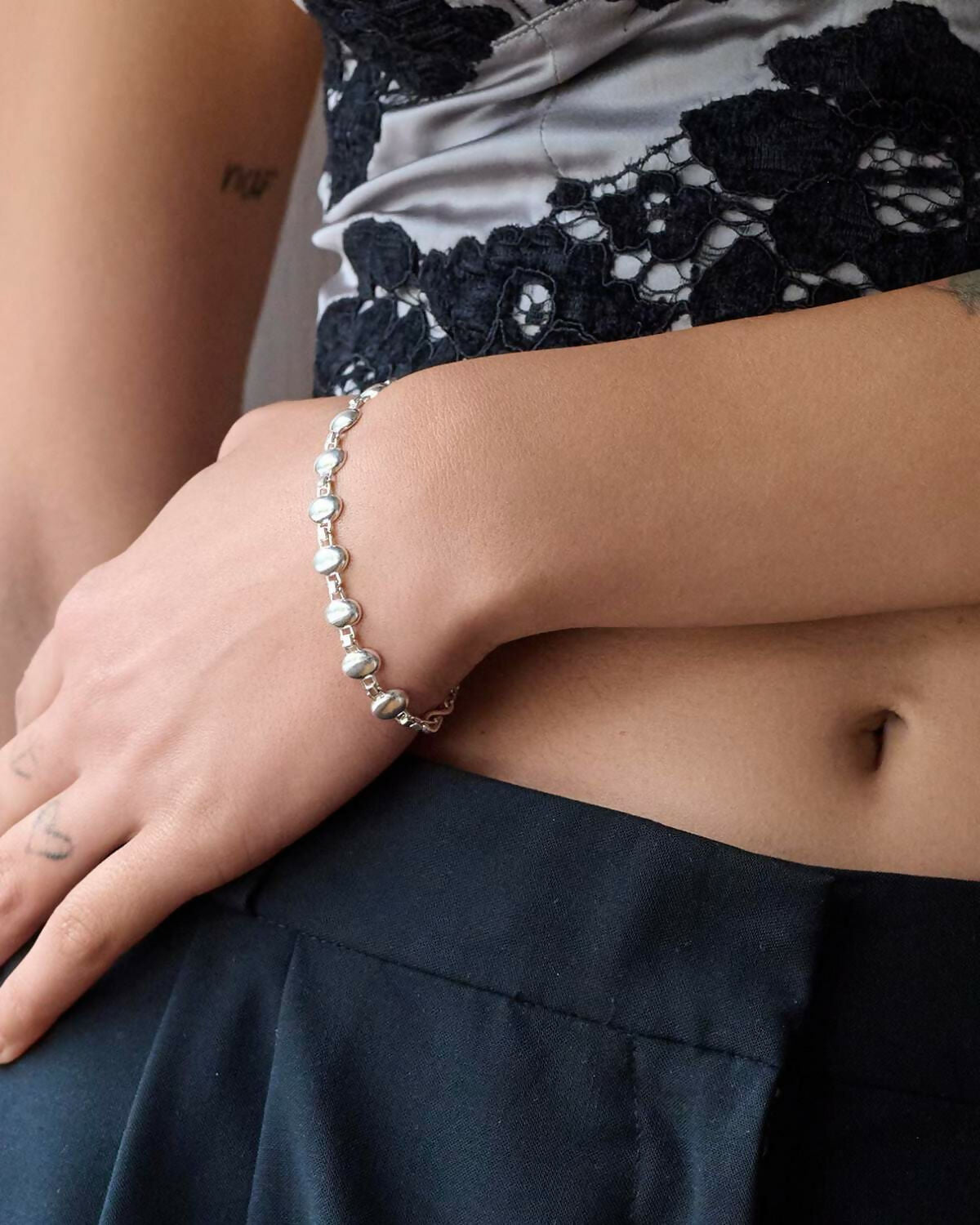 Ein Armband aus kleinen ovalen Anhängern und einer individuell gestalteten Kette. Das schöne Schmuckstück ist perfekt für den täglichen Gebrauch und festliche Anlässe und aus 925er Sterlingsilber gefertigt.