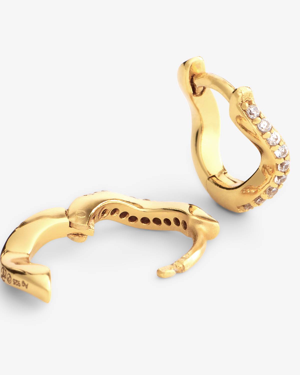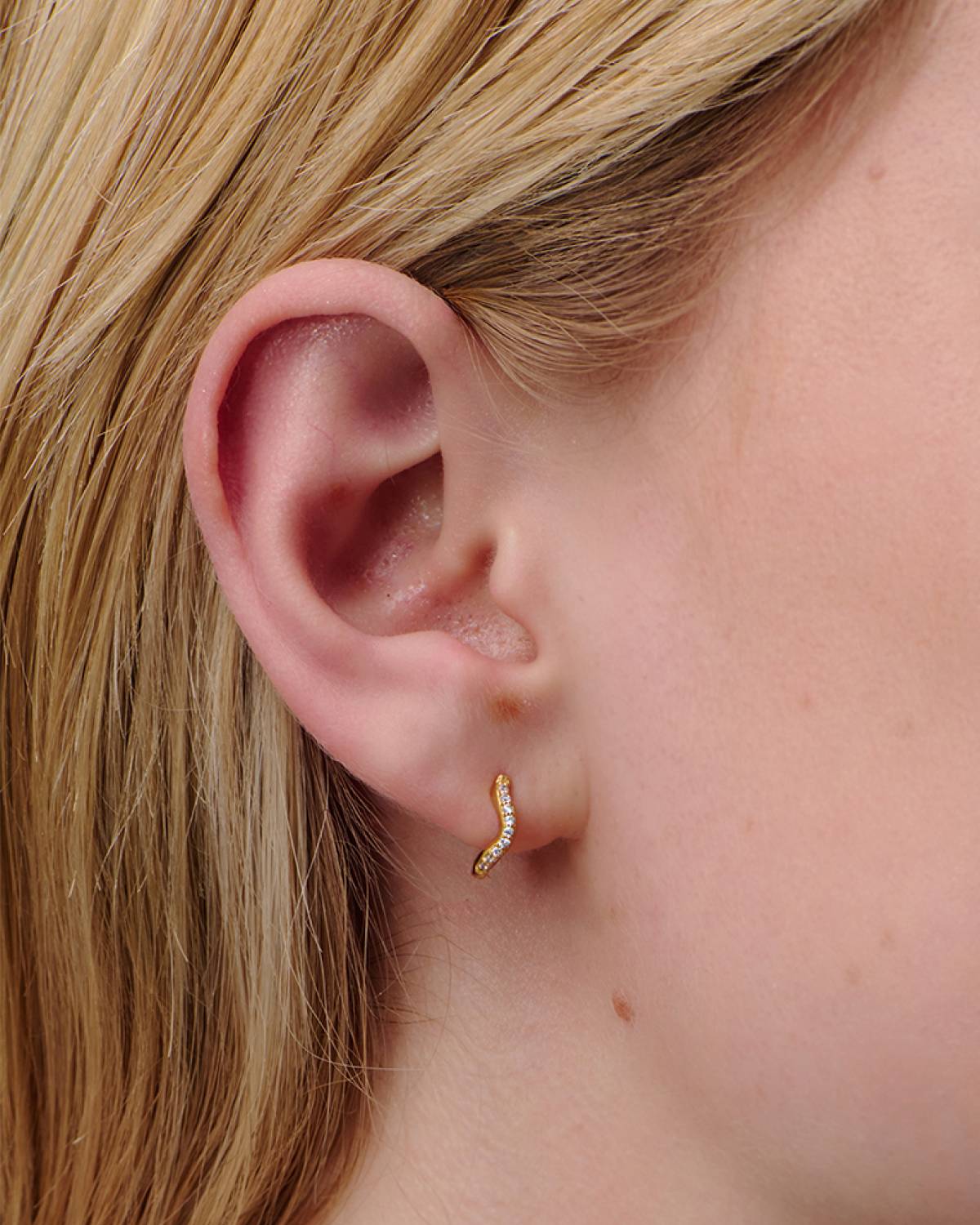 Meet Ellie Small – die Creolen mit Twist! 18kt vergoldet und mit White Zirconia besetzt, glänzen sie in einem sanft geschwungenen Design, das sofort auffällt. Kompakt und doch raffiniert, sind sie die perfekten Alltags-Begleiter mit Trend-Faktor. Ob solo getragen oder kombiniert: Ellie bringt Style, Fun & Sparkle in jedes Outfit.
