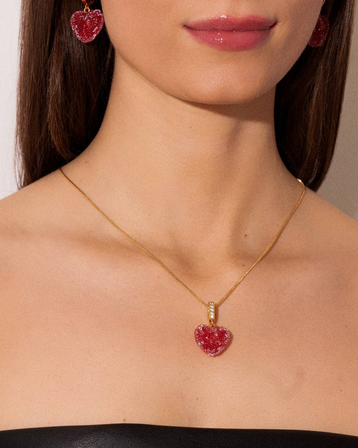 Der Jelly Heart Rouge Pavé Pendant von Crystal Haze bringt verspielten Luxus auf den Punkt. Das tiefrote, kristallartige Herz fängt das Licht wie geschmolzener Zucker, während der mit funkelnden Zirkonias besetzte Bügel im 18kt Gold Plating einen Hauch Glamour hinzufügt. Ein charmanter Mix aus Pop-Attitüde und edlem Finish – für einen Look, der sofort Laune macht.