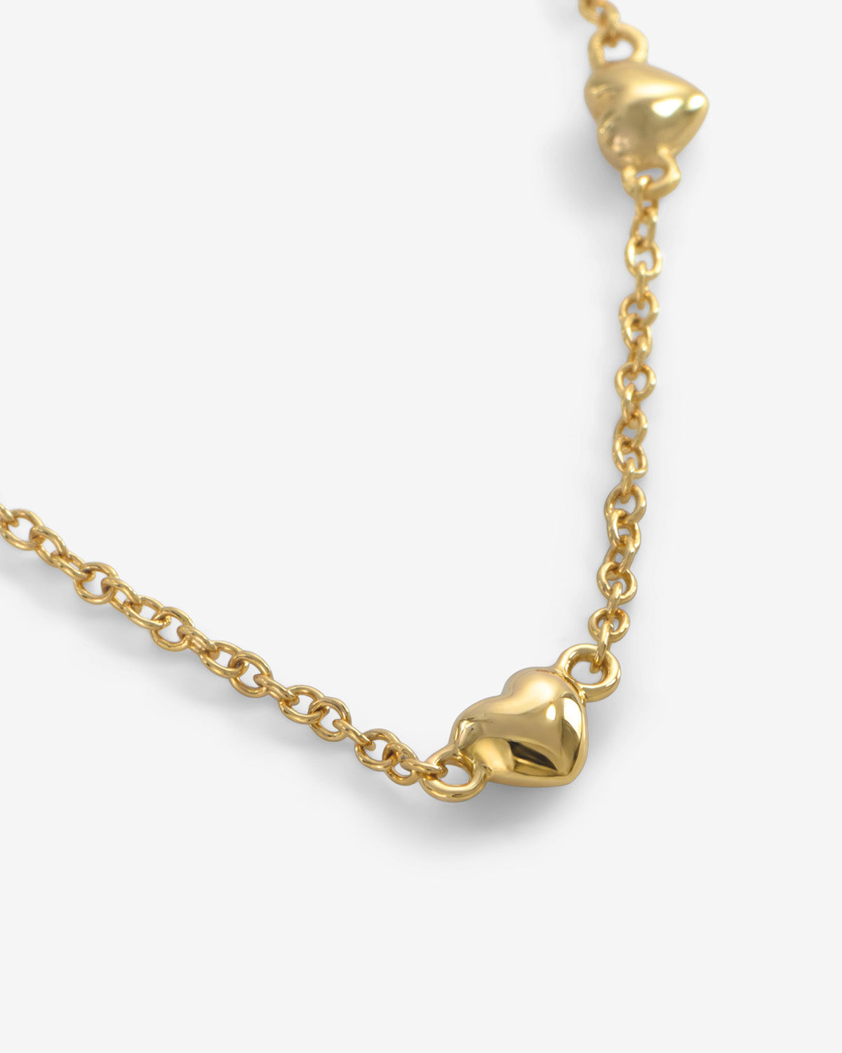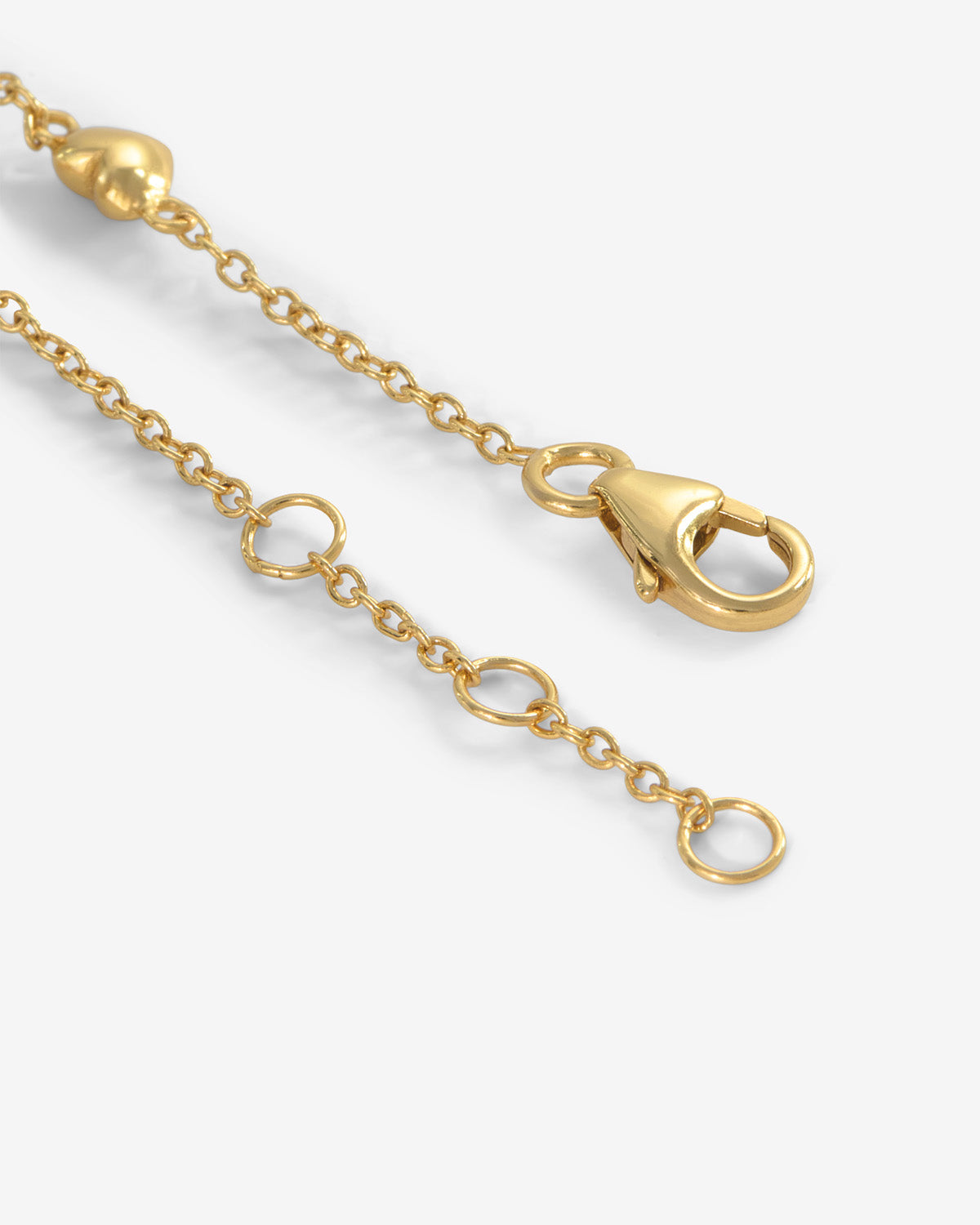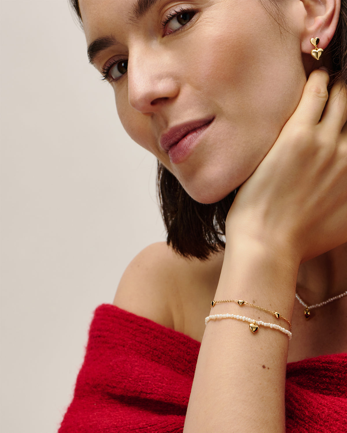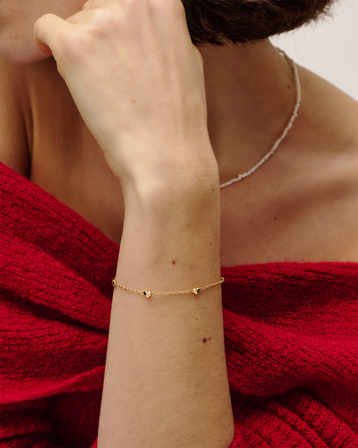Das Mini Love Path Armband besteht aus einer feinen Kette, entlang der sich kleine Herzdetails gleichmäßig aneinanderreihen. Die 18kt Vergoldung verleiht dem Design eine warme Ausstrahlung, während die filigrane Form leicht und beweglich bleibt. Sanft ums Handgelenk gelegt, wirkt das Armband dezent, aber bewusst gewählt – ein verspielter Akzent für minimalistische Momente.