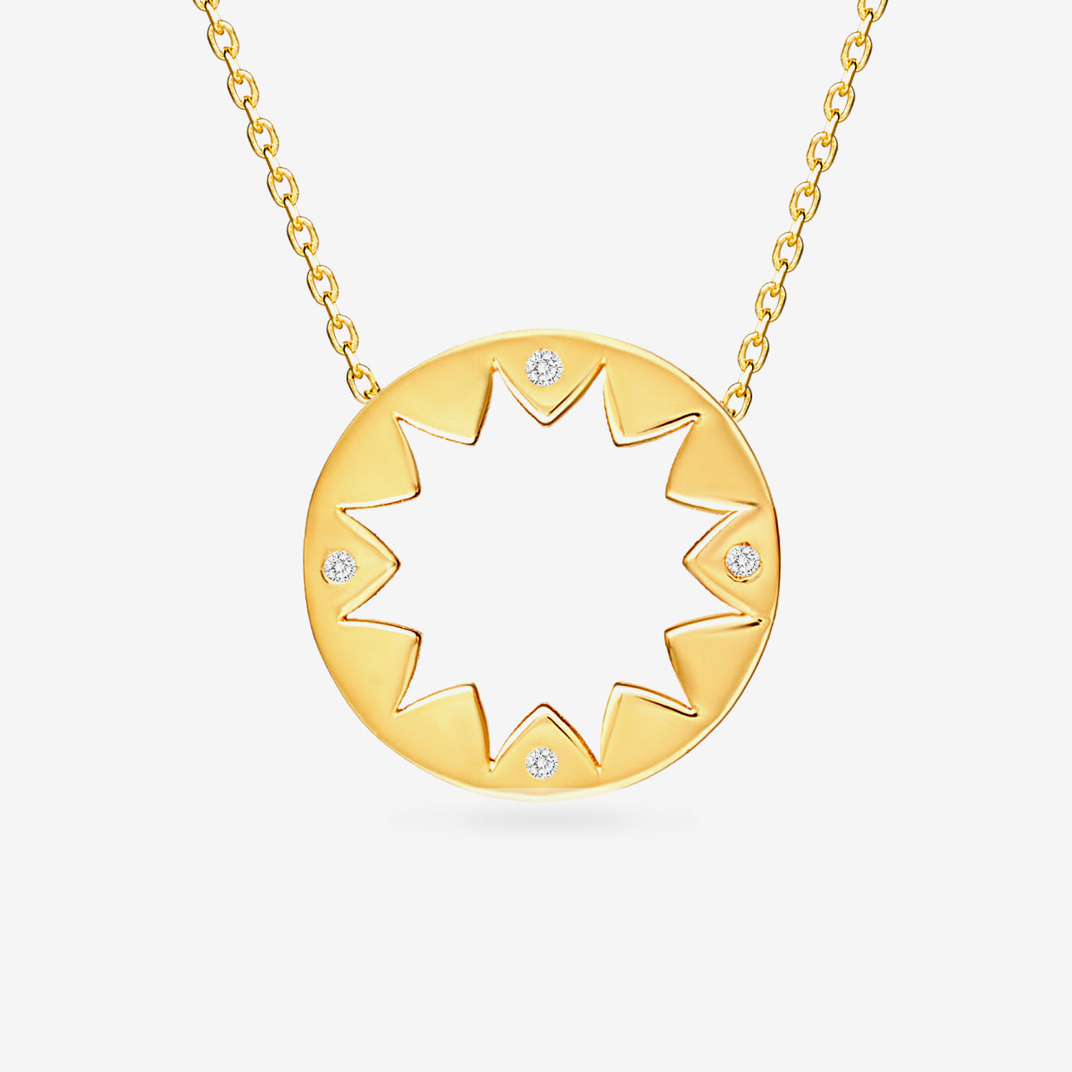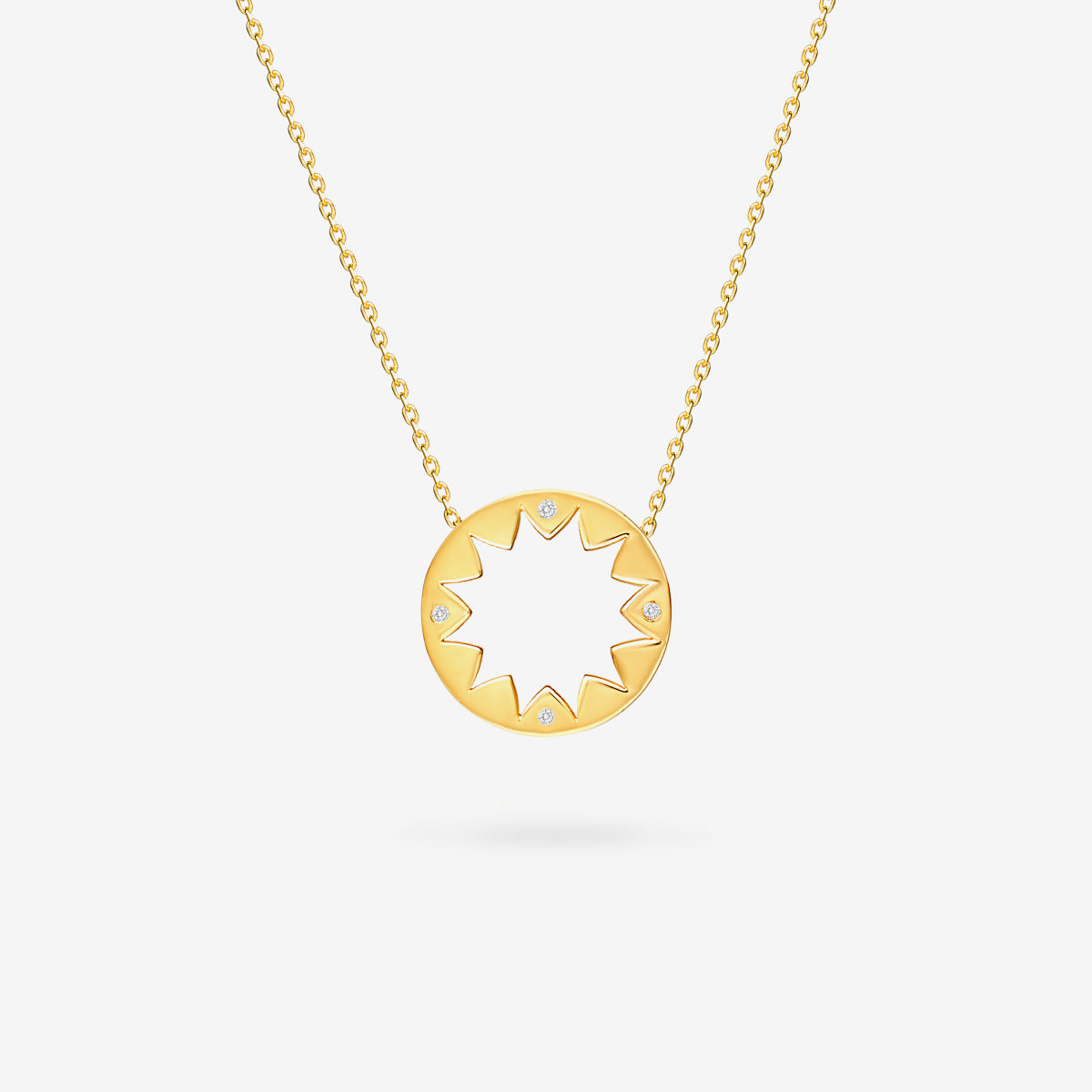 Die 585 Gold Diamant Halskette ist an mediterranen Sommertagen inspiriert und für die Sonnenanbeterin entworfen. Diese Halskette mit dem Sonnen Diamant Anhänger schmiegt sich elegant und leicht ans Dekollete. Das Highlight sind die vier funkelnden Diamanten, die die Himmelsrichtungen weisen. Eine handgefertigte Halskette, die für sich alleine strahlt, aber auch mit unseren Basic Halsketten für einen Layer Look kombiniert werden kann. Ein wunderschönes Goldschmuck Geschenk, das die Trägerin zum Strahlen bringt!