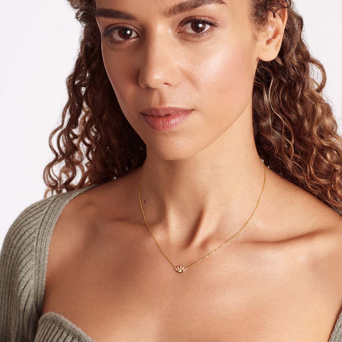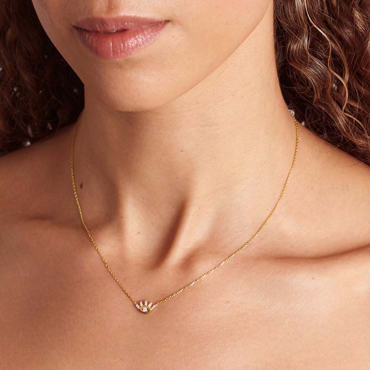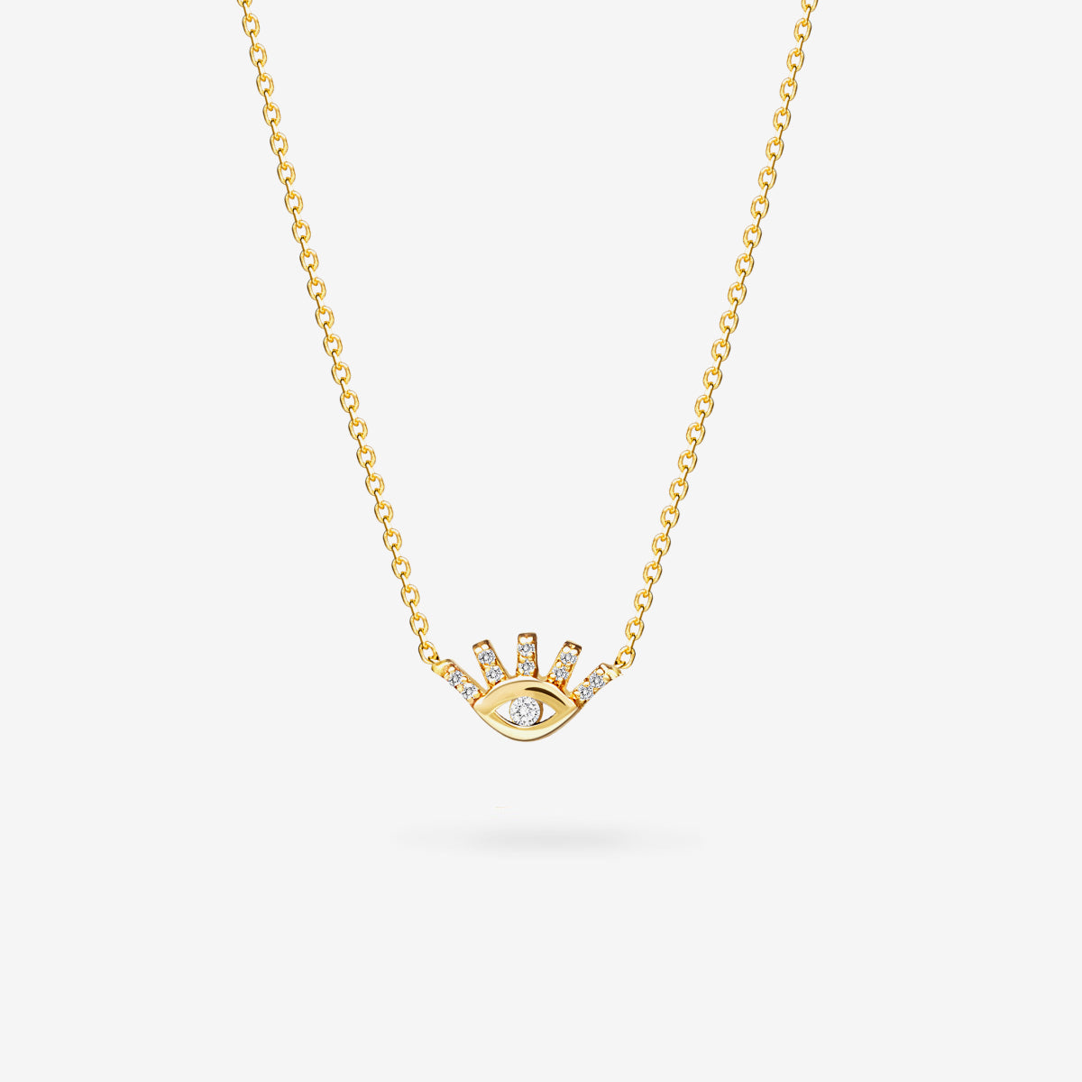 585 Gold Halskette mit Diamanten. Die Halskette mit einem zierlichen Nazar Augen-Anhänger ist mit einem Diamanten in der Mitte besetzt und ein echter Blickfang. Der Diamant Anhänger besteht aus weiteren 11 kleinen Brillanten, die das das Licht einfangen und jedes Outfit mit einem geheimnisvollen Glitzern veredeln. Trage die Evil Eye Kette allein oder kombiniere sie mit einer längeren Kette. Ein perfektes Diamant Geschenk, das als Talisman auch Schutz bietet.