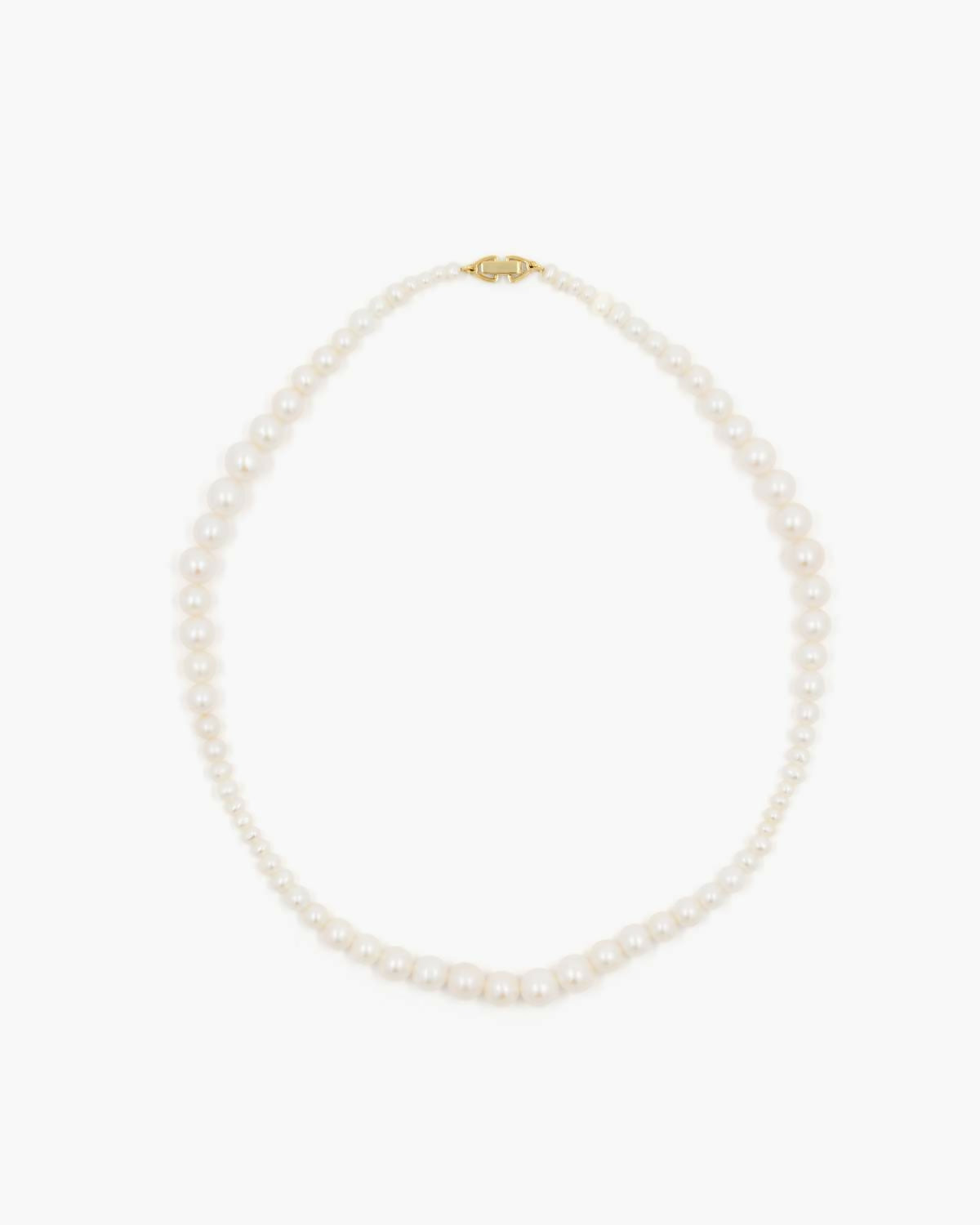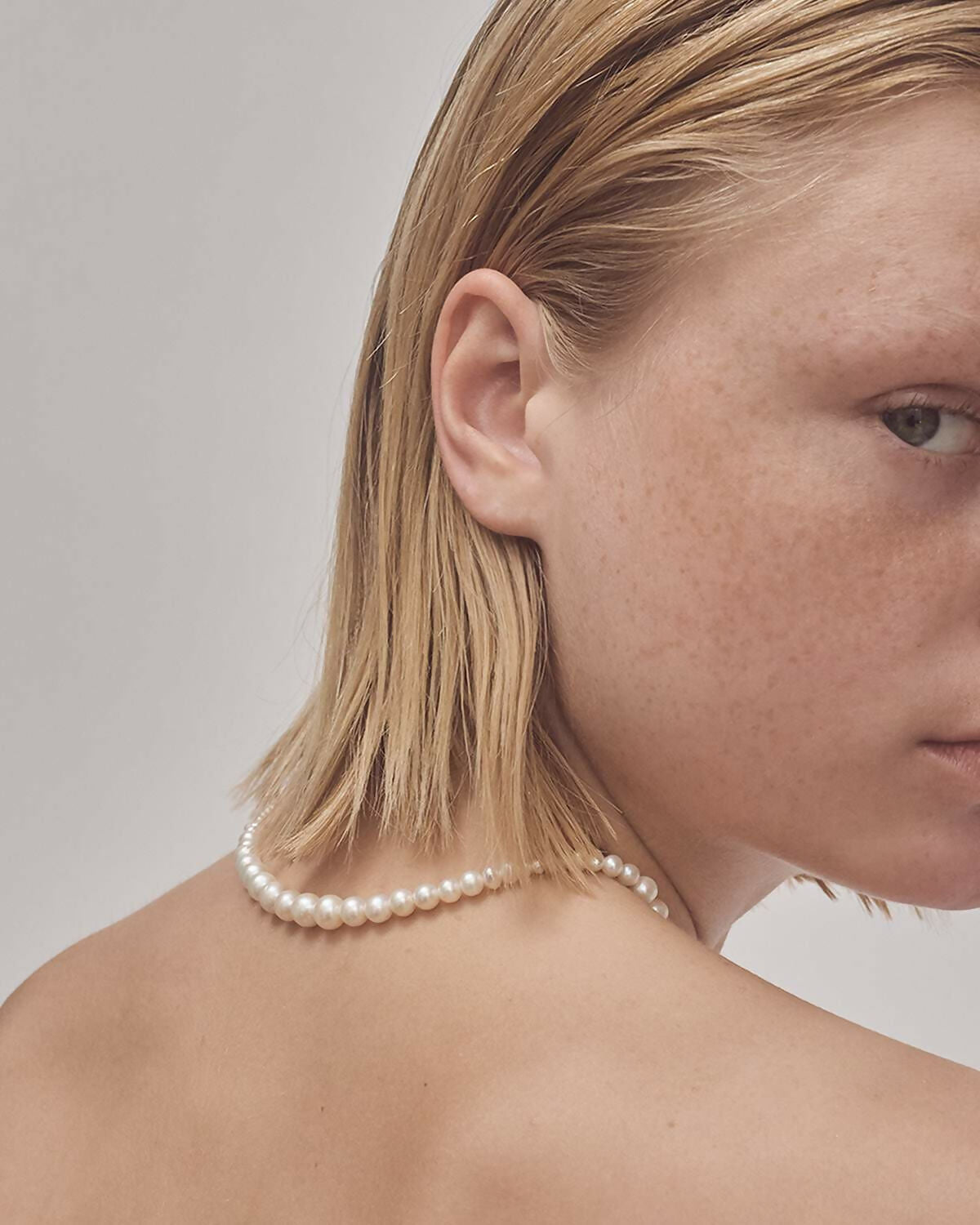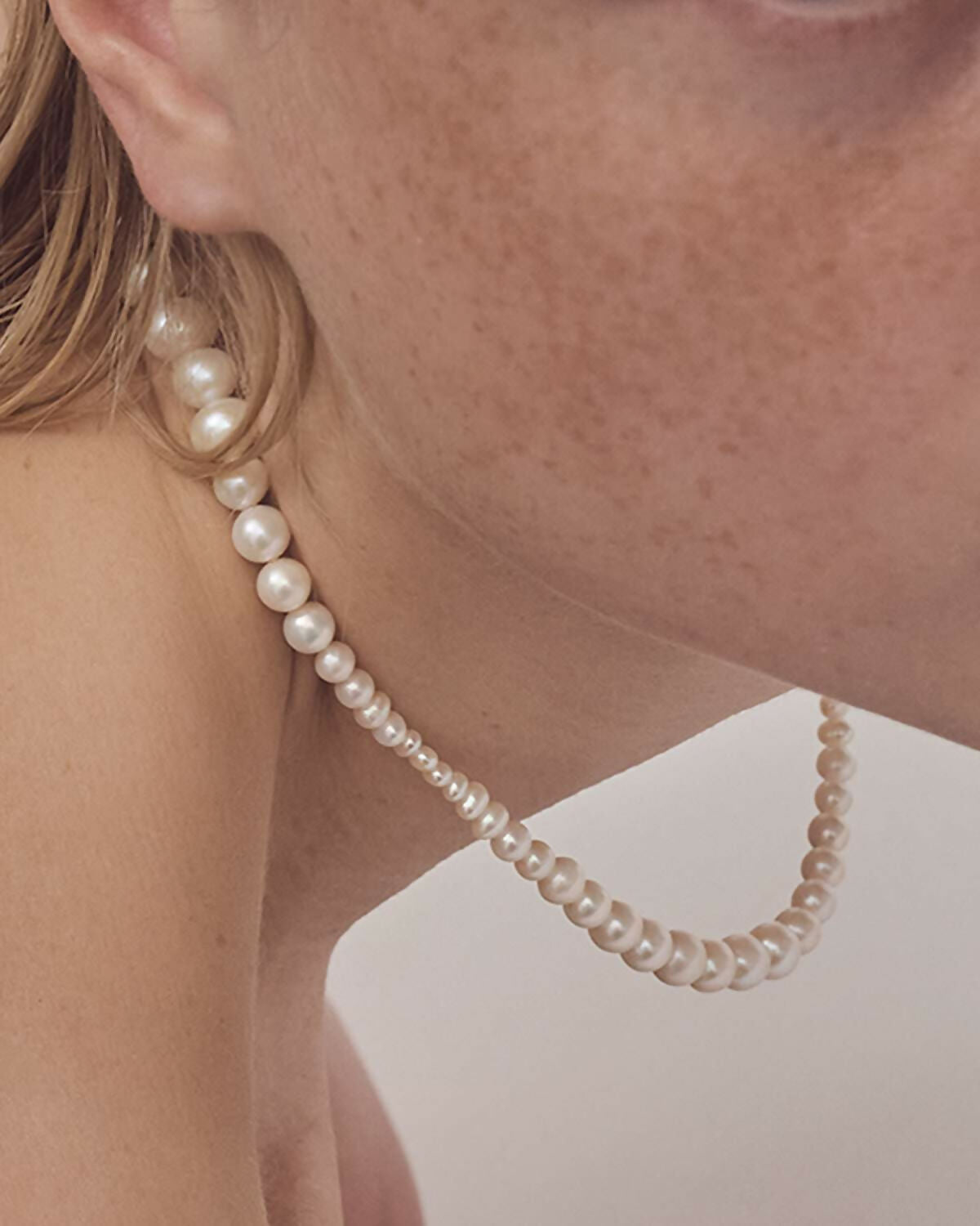 Diese alternative Variante der klassischen Perlenkette, hat wechselnde Größen von Süßwasserperlen, die den Hals schmücken, und ist ein echtes Must-Have.