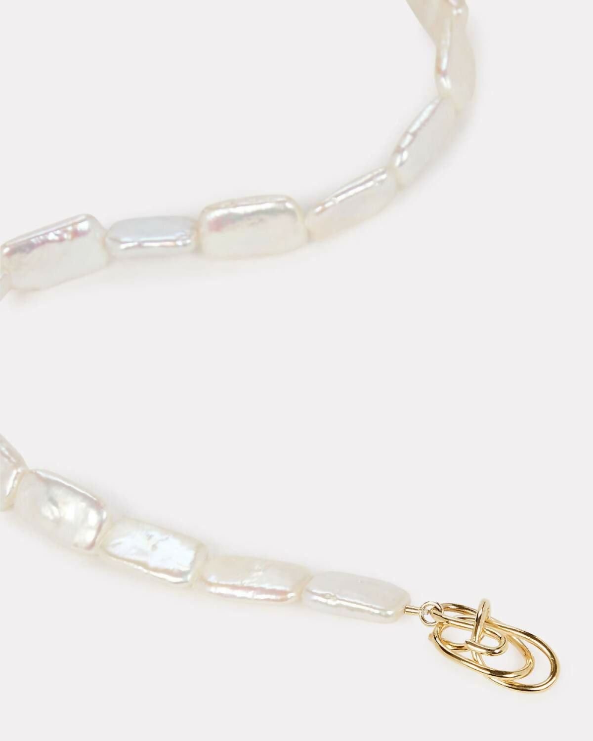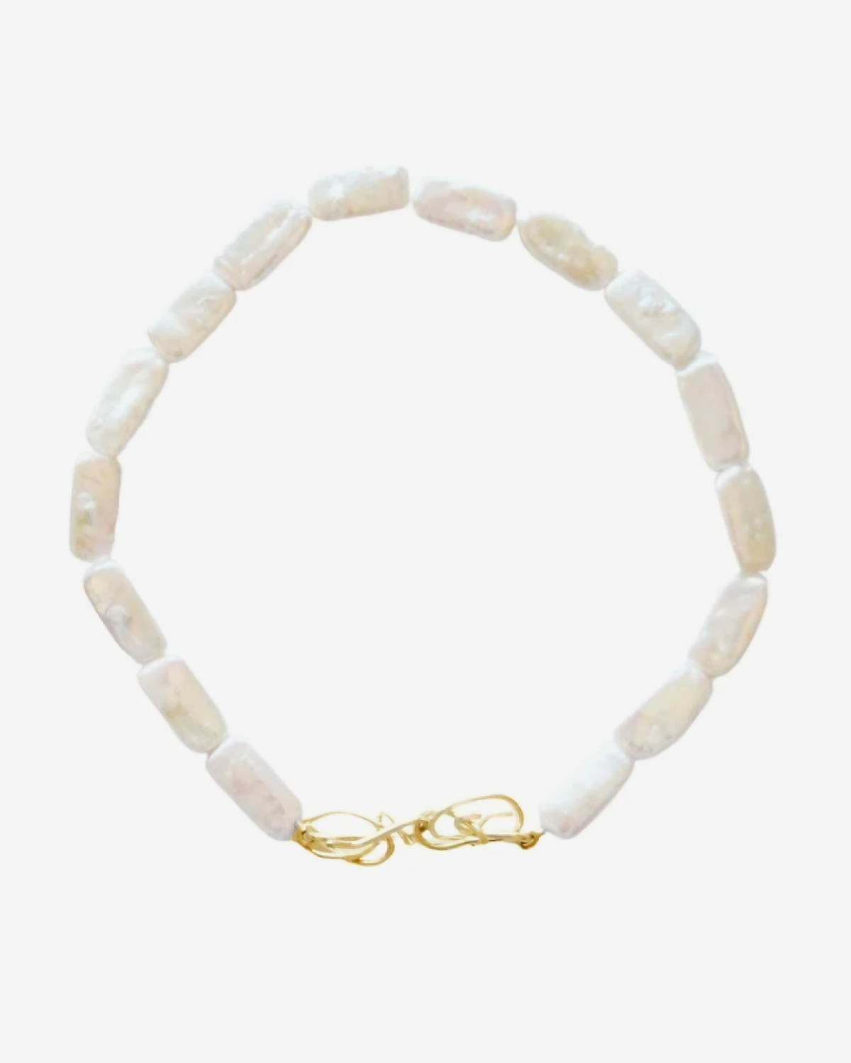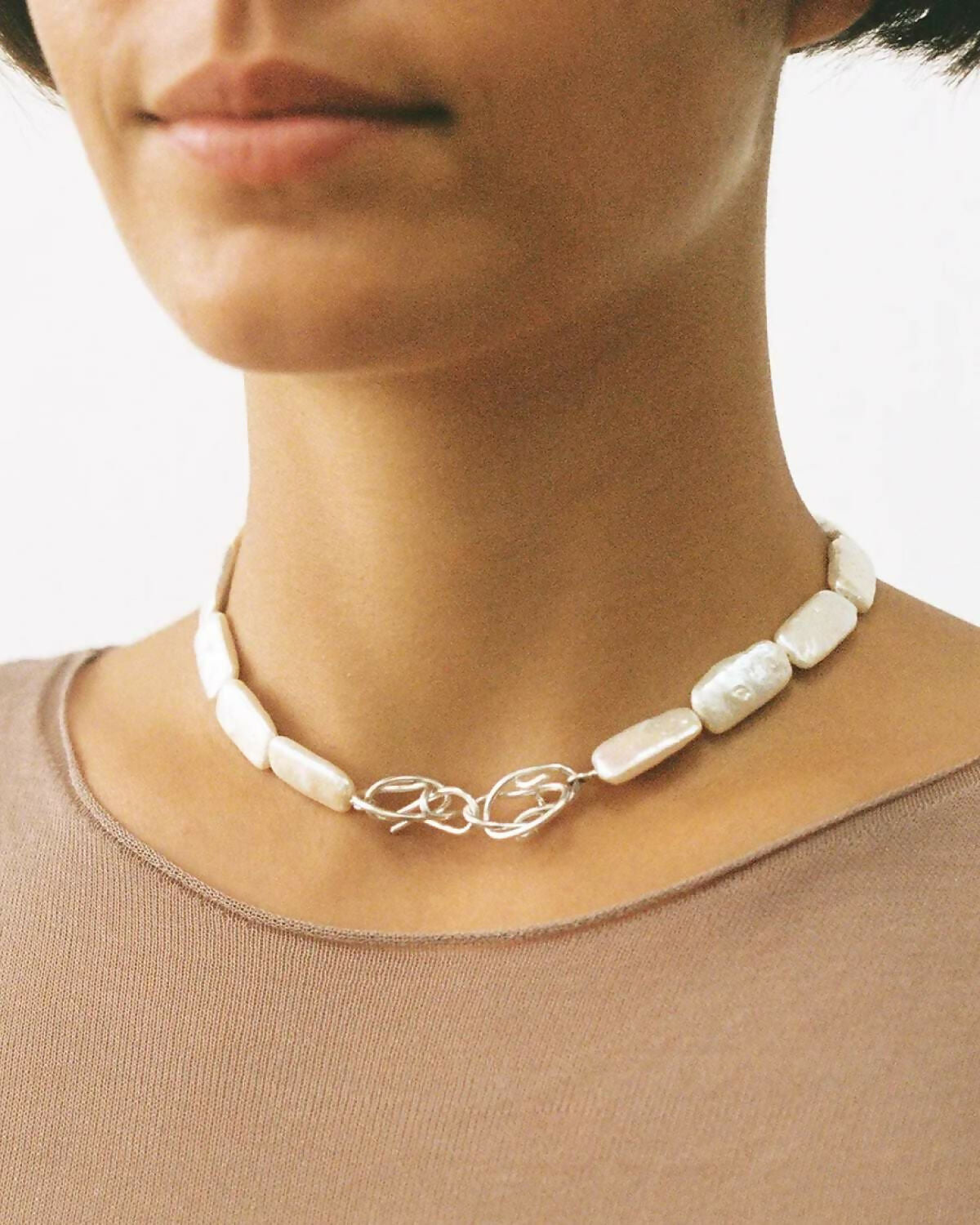 Ein Klassiker! Diese barocke Perlenkette passt perfekt um den Hals. Der Verschluss der Kette besteht aus überlappenden plattierten Sterlingsilberfäden und ist äußerst fein bearbeitet und zieht die Aufmerksamkeit auf sich. Trage diesen Choker vorne oder hinten.