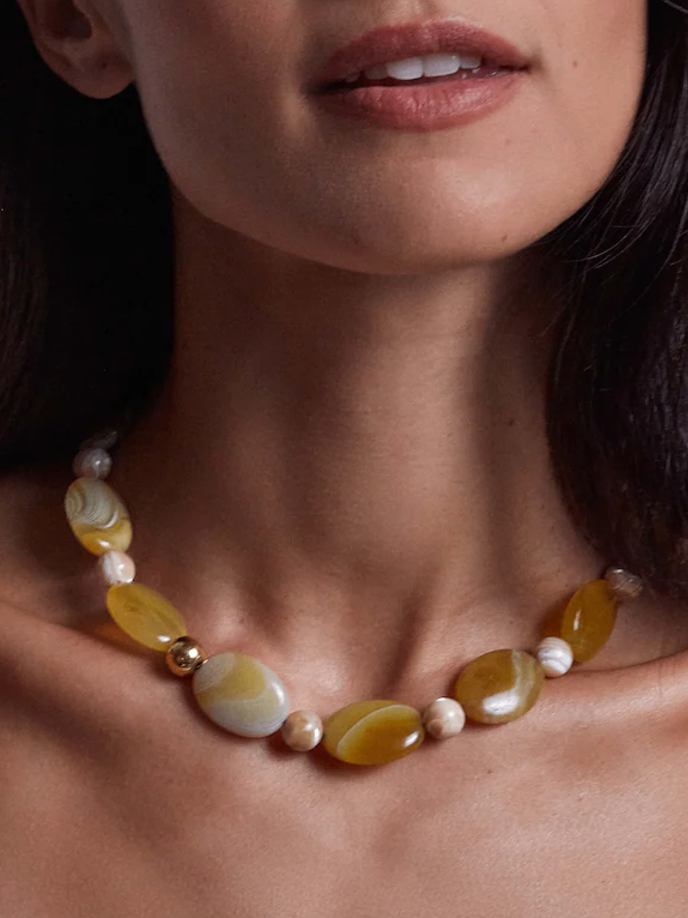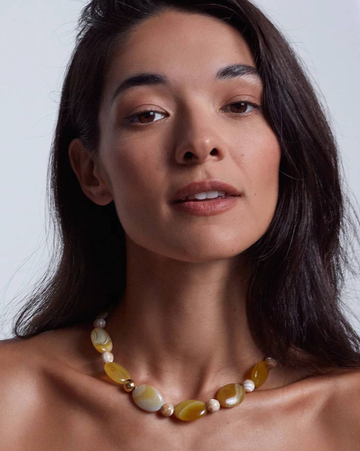 Ein Hauch von Wüstenzauber trifft auf luxuriöse Eleganz: Die Desert Dreamer Butterscotch Halskette von Anni Lu vereint sonnig-gelbe Jade, schimmernde Mother of Pearl und edle Süßwasserperlen zu einem traumhaften Farbspiel. Veredelt mit 18kt vergoldeten Details wird sie zum perfekten Highlight für alle, die Wärme, Leichtigkeit und einen trendbewussten Twist lieben.