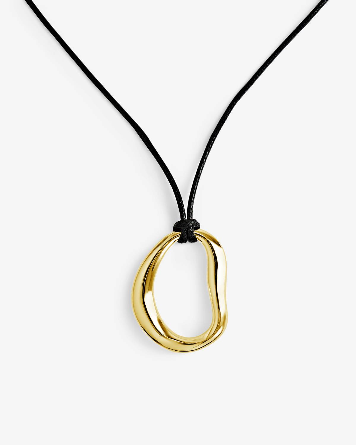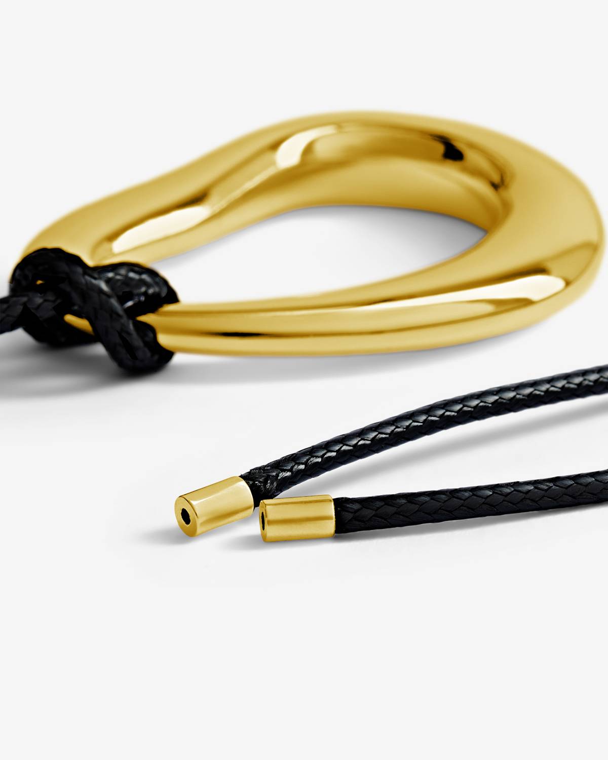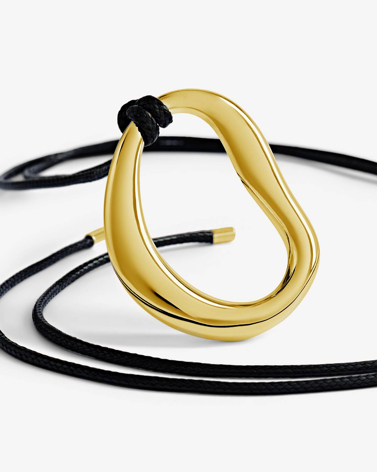 Wie flüssiges Gold geformt zu einem sanften Schwung: Die Nectar Fluid Kette von Pompidou spielt mit Bewegung und Leichtigkeit. Der organisch geformte Anhänger erinnert an einen goldenen Tropfen, der im Moment des Fallens eingefangen wurde – glänzend, sinnlich und modern. Das 18 kt Vergoldung verleiht dem Design eine warme Tiefe, während das schwarze Band einen spannenden Kontrast setzt.