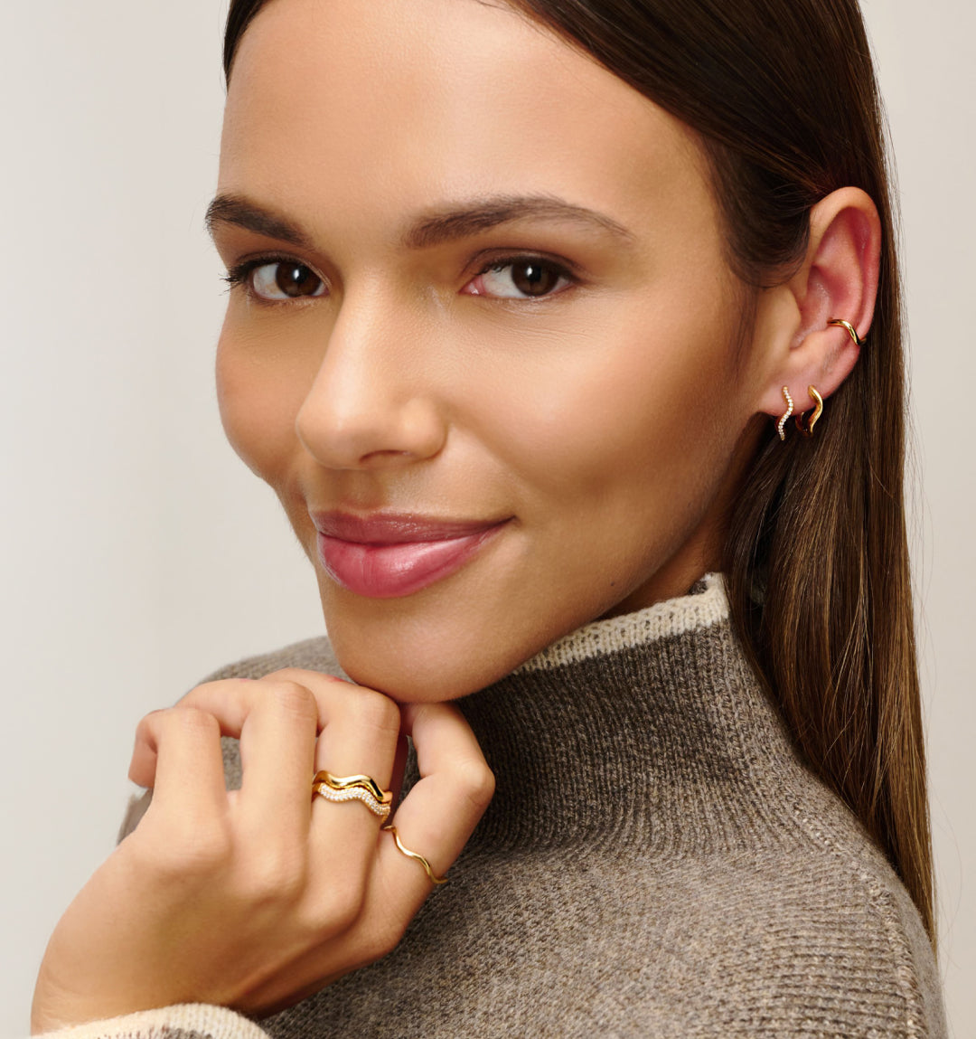 Die Ohh Wave Collection feiert die Schönheit der Bewegung. Sanfte Wellen, goldene Kurven und funkelnde Steine verschmelzen zu zeitlosem Glamour – perfekt für alle, die Leichtigkeit und Eleganz tragen wollen.