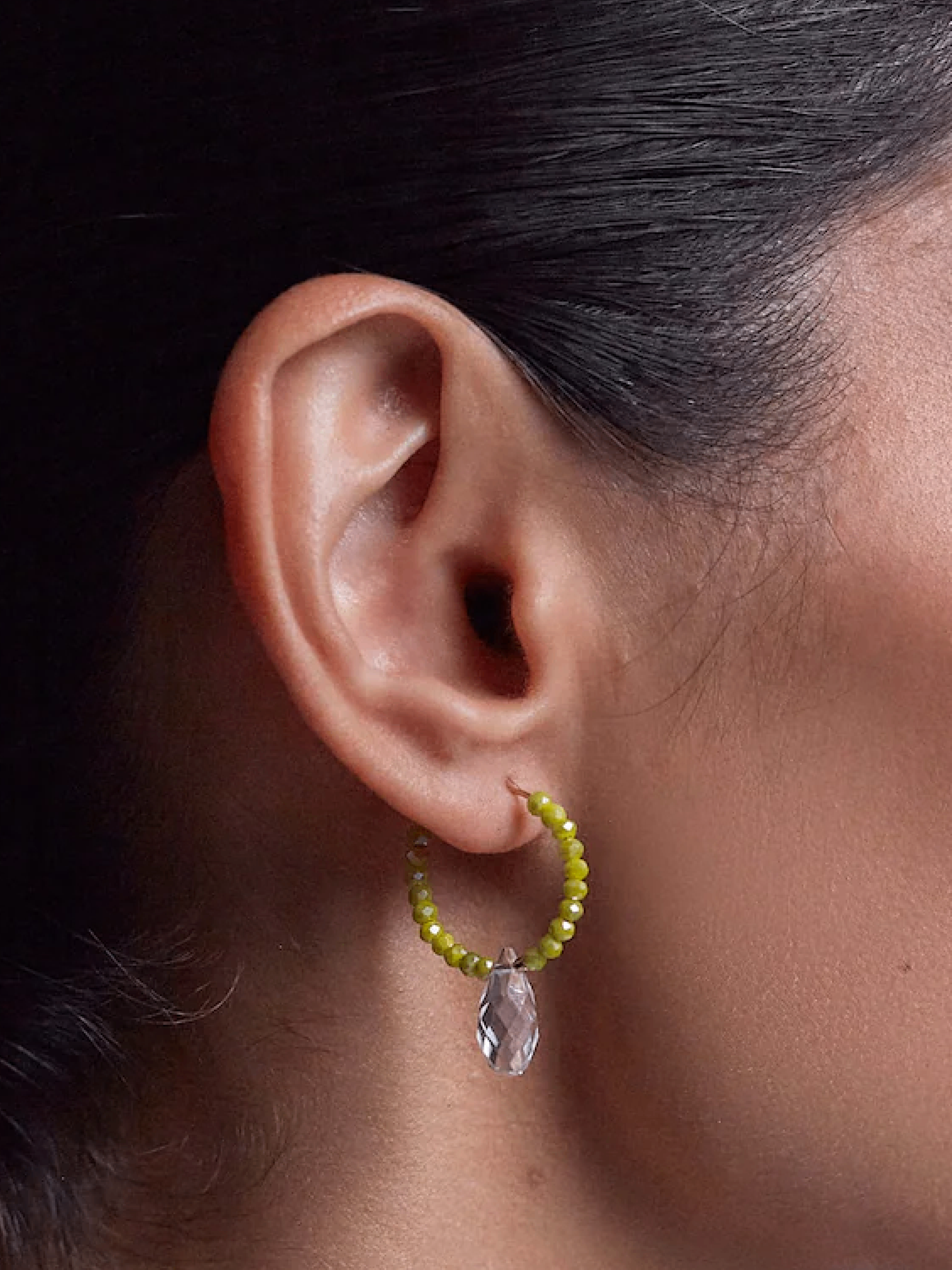 Die Cosmic Cactus Pale Olive Creolen sind ein harmonisches Zusammenspiel aus Farbe und Glanz. Zarte Glasperlen in frischem Grün umrahmen einen klaren Kristall, während 18kt Vergoldung das luxuriöse Finish setzt. Das Ergebnis: ein Schmuckstück, das stilvoll auffällt und jedem Outfit eine moderne Note verleiht.