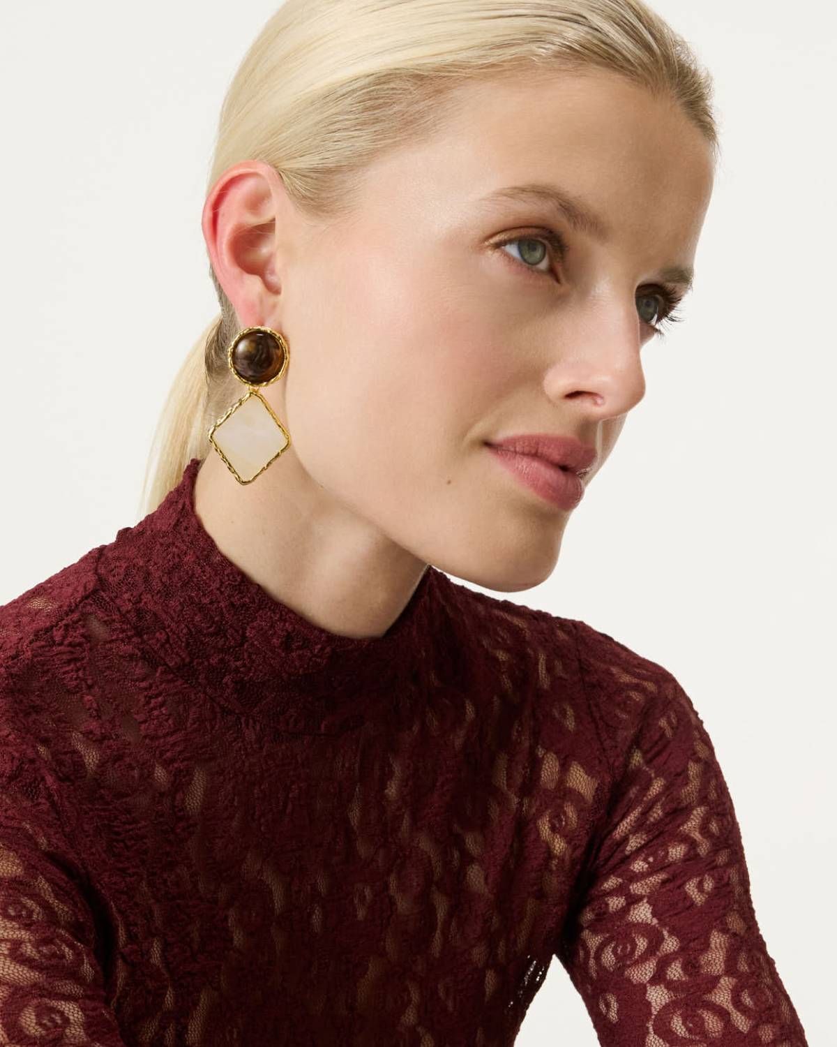 Statement mit Twist: Die Vintage Geometric Earrings kombinieren dunkle, runde Elemente mit hellen, quadratischen Akzenten. Dazu kommt der goldene Rahmen, der den Look strahlend macht. Ein Design, das sich nicht entscheiden muss – mal edgy, mal soft, und genau deswegen so spannend.