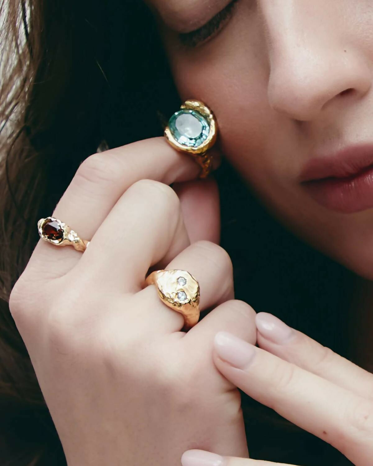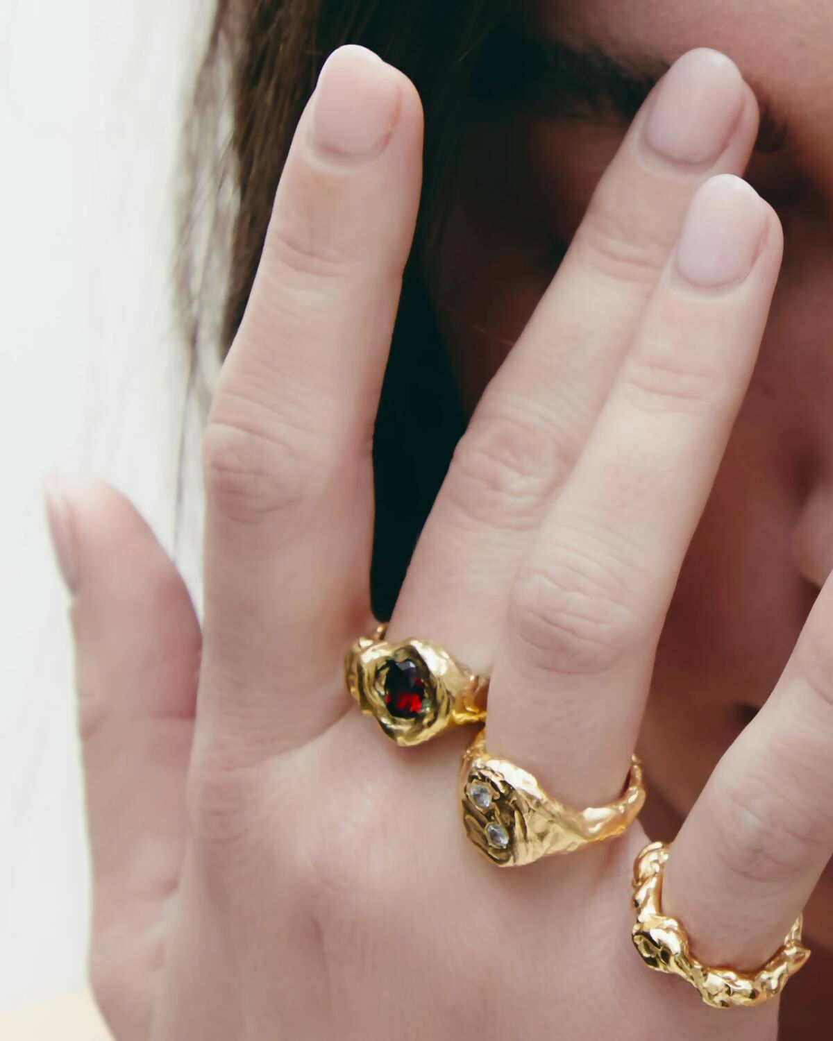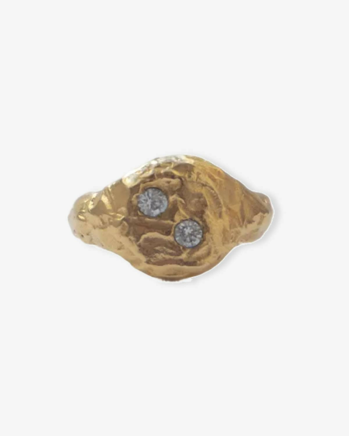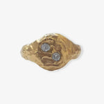 Ring made of recycled 925 sterling silver plated in 18k gold and two stones. Organic-shaped signet ring featuring two bright stones placed diagonally on the surface. The soft irregularities of its silhouette come from the manual shaping process. Handmade in Barcelona, following the legacy of traditional jewelry, reinterpreted from a contemporary perspective. Each piece is handmade, which may result in small variations or natural imperfections that are part of its artisanal character.