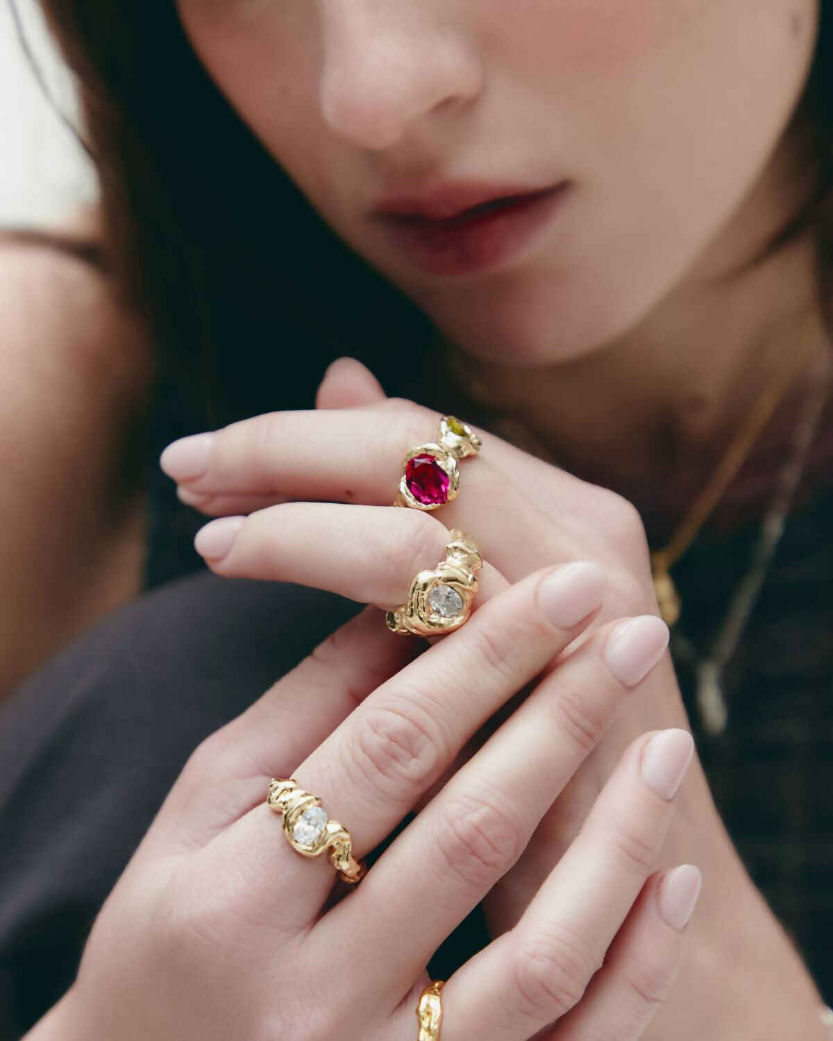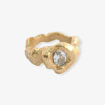 Ring made of 925 recycled silver plated in 18k gold with a stone embedded within the metal. Its enveloping form conveys protection and shelter, like a refuge. Handmade in Barcelona, following the legacy of traditional jewelry, reinterpreted from a contemporary perspective. Each piece is handmade, which may result in small variations or natural imperfections that are part of its artisanal character.