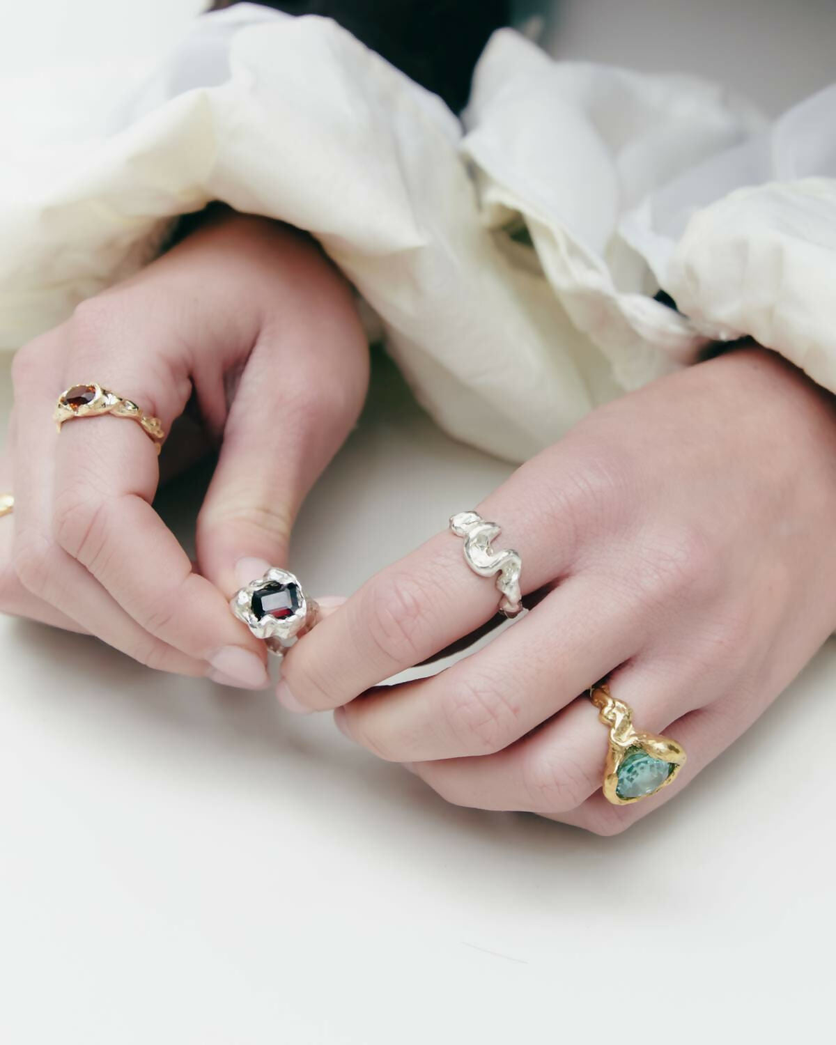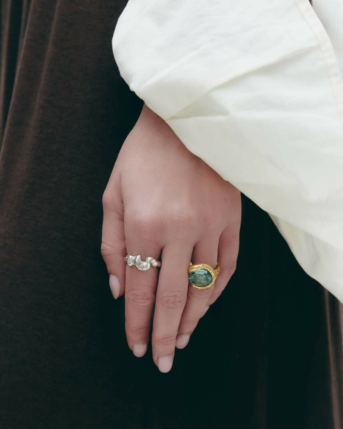 Ring made of 925 recycled silver with an organic surface and irregular relief. Its sculptural form flows in a continuous curve, emphasizing the movement and balance of the hand-shaped gesture. Handmade in Barcelona. Each piece may present slight variations due to its artisanal nature.