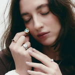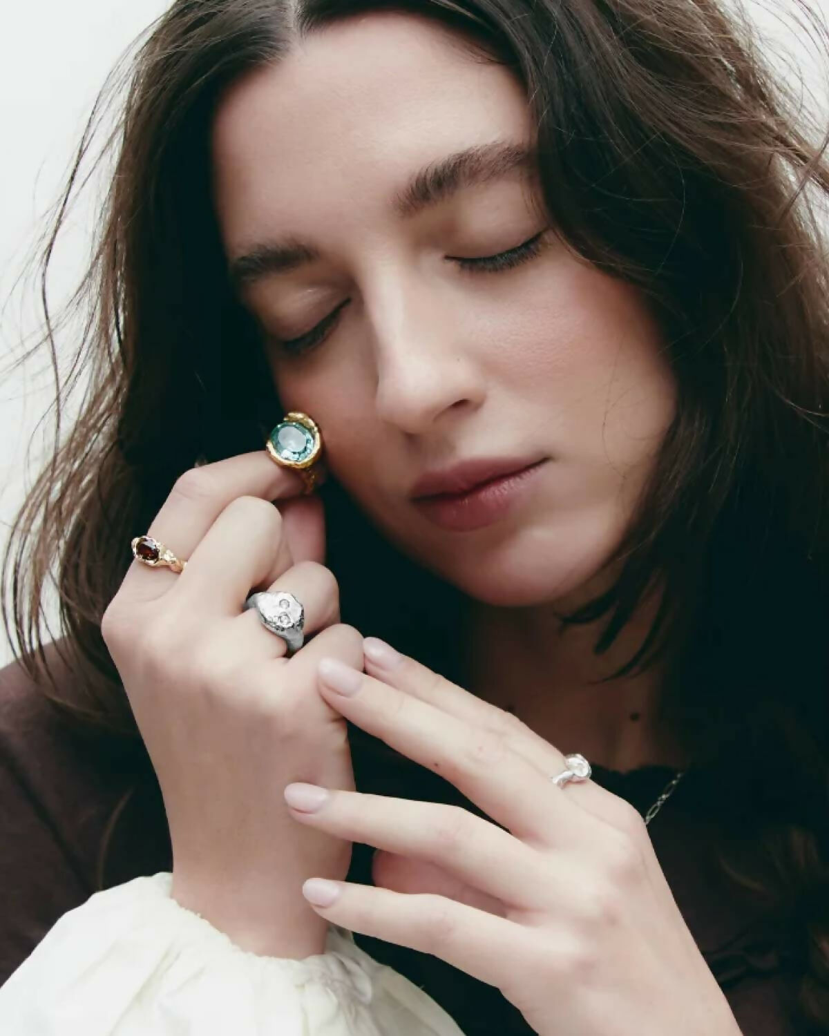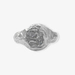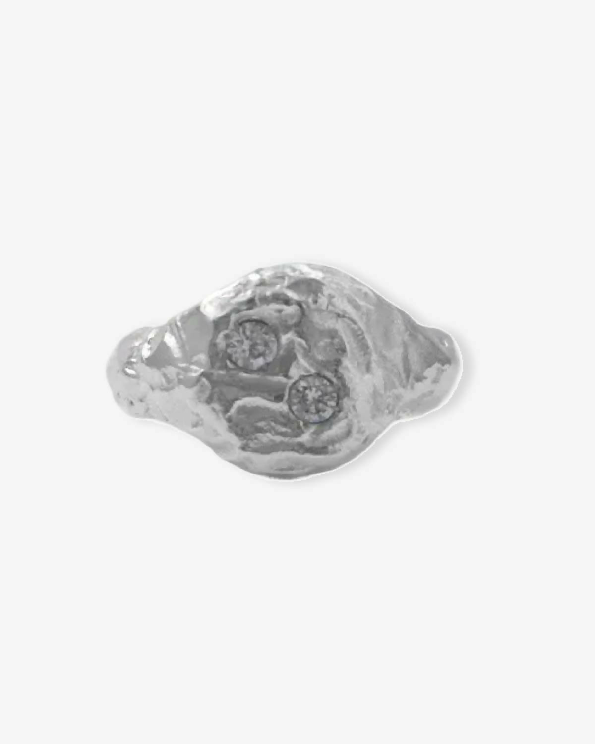 Ring made of 925 recycled silver and two stones. Organic-shaped signet ring with two bright stones set diagonally. The hand–shaped process leaves a smooth, slightly irregular surface, characteristic of the collection. Handmade in Barcelona, following the  legacy of traditional jewelry, reinterpreted from a contemporary perspective. Each piece is handmade, which may result in small variations or natural imperfections that are part of its artisanal character.