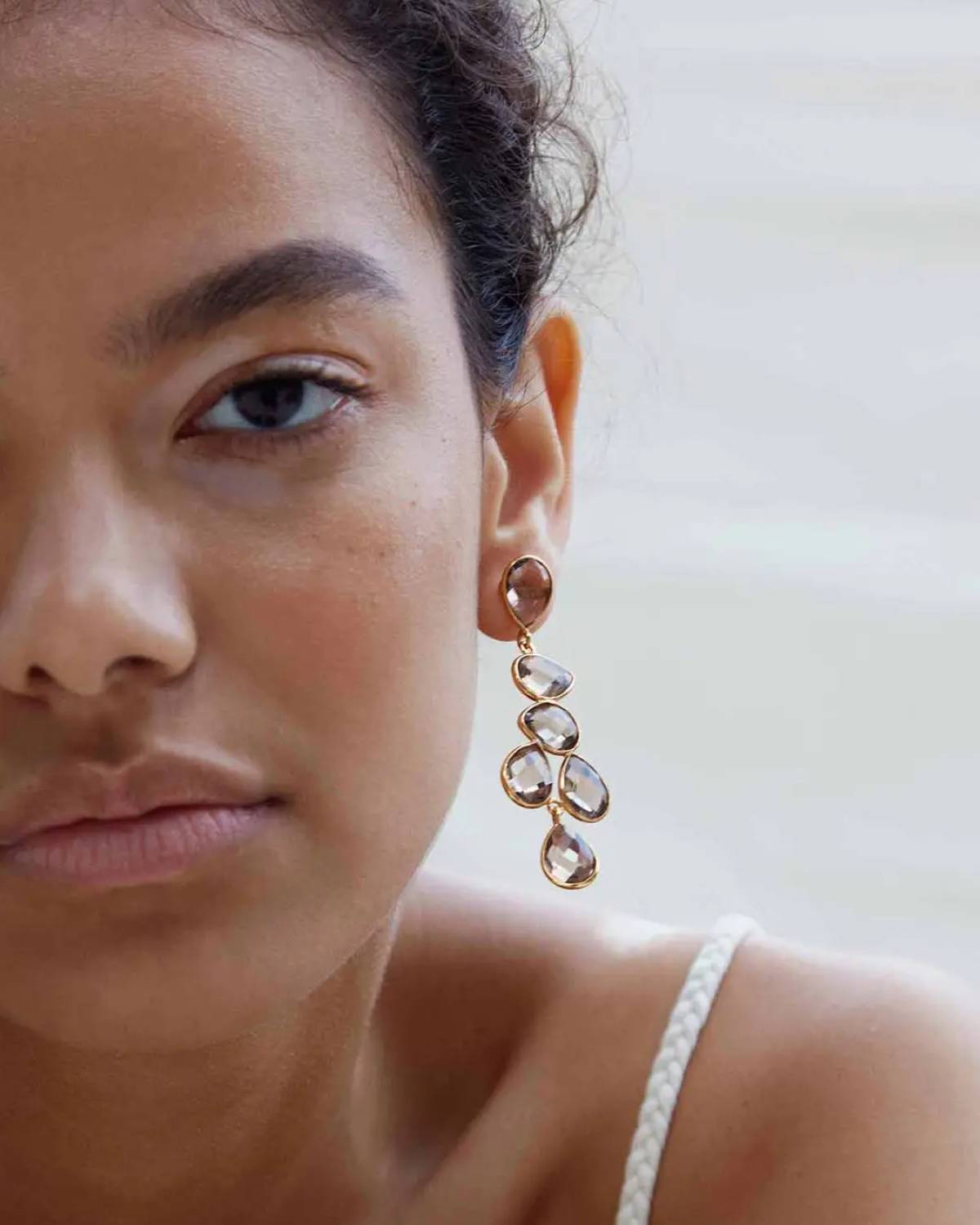 Die Sheena Earrings von Shyla London funkeln mit zarten Tropfen in schimmerndem Champagner-Ton, eingefasst in 22kt vergoldetes Gold. Leicht, edel und doch auffällig – diese Ohrringe bringen Glamour und Party-Vibes in jeden Look.