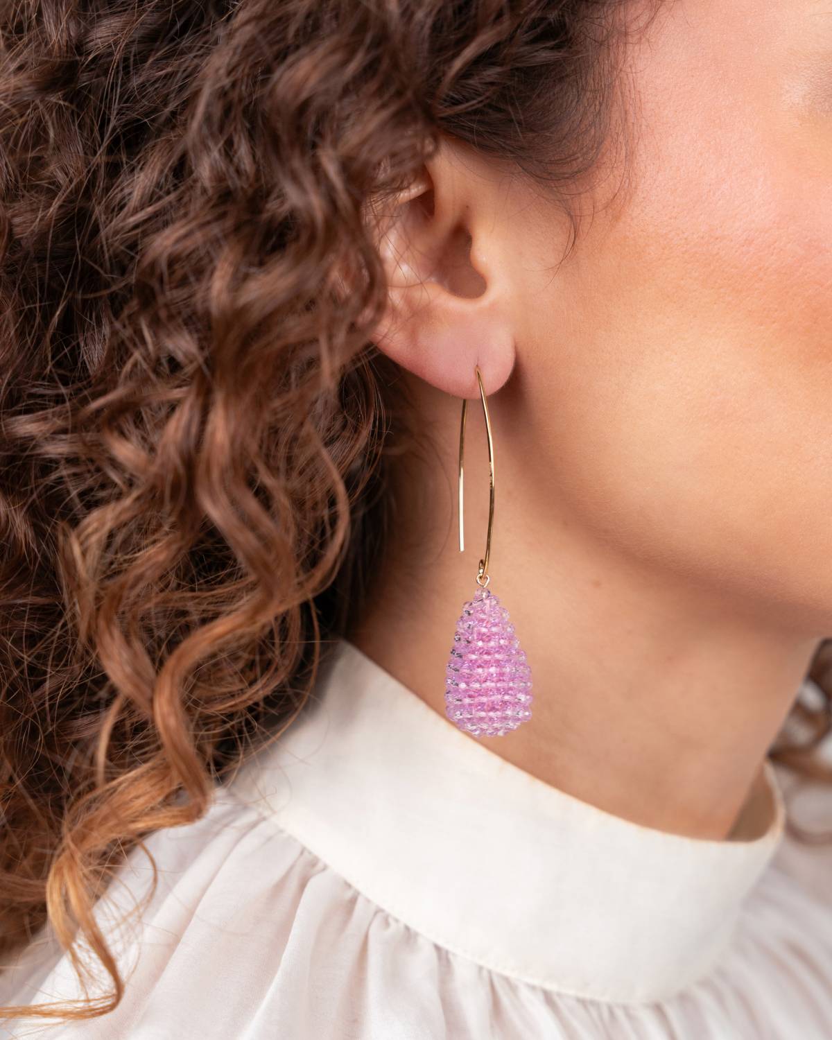 Die Amy CE GB Cone S Bubble Pink Ohrhänger in 18kt Vergoldung bringen gute Laune in einer cleanen Statement-Form: Unter dem matt schimmernden Stud hängt ein kompakter Cone-Anhänger, besetzt mit vielen kleinen Bubble-Pink Sequins, die bei Bewegung lebendig funkeln. Der Look wirkt strukturiert, modern und wunderbar leicht, ohne überladen zu sein.