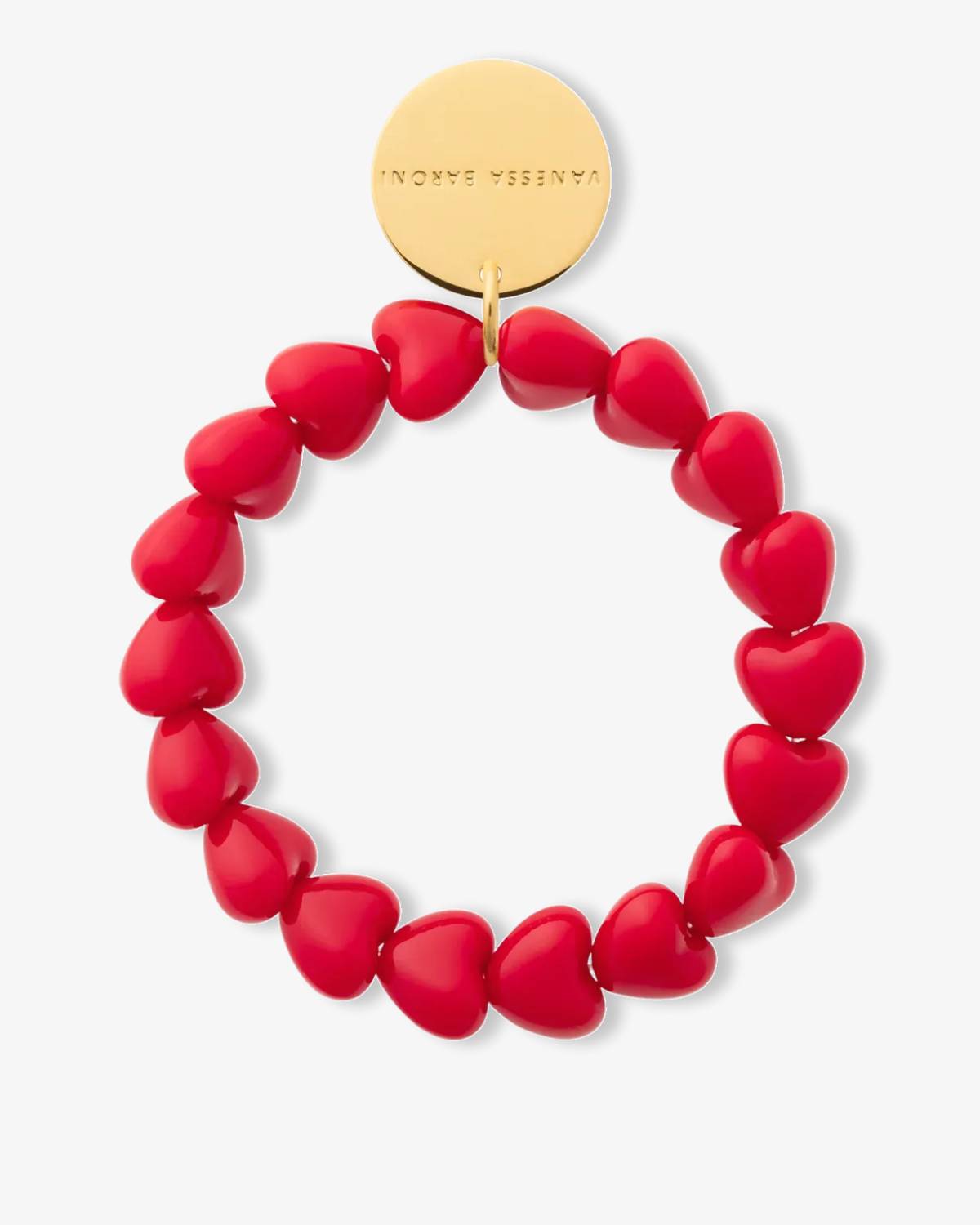 Das Vanessa Baroni Hearts Bracelet Scarlet Red setzt ein klares Statement mit gleichmäßig geformten Herz-Elementen in intensivem Rot. Die glänzende Oberfläche sorgt für einen starken visuellen Effekt, während der gelb vergoldete Logo-Anhänger einen eleganten Kontrast bildet. Das Armband ist hochwertig verarbeitet und bringt Farbe in moderne Schmuckkombinationen.