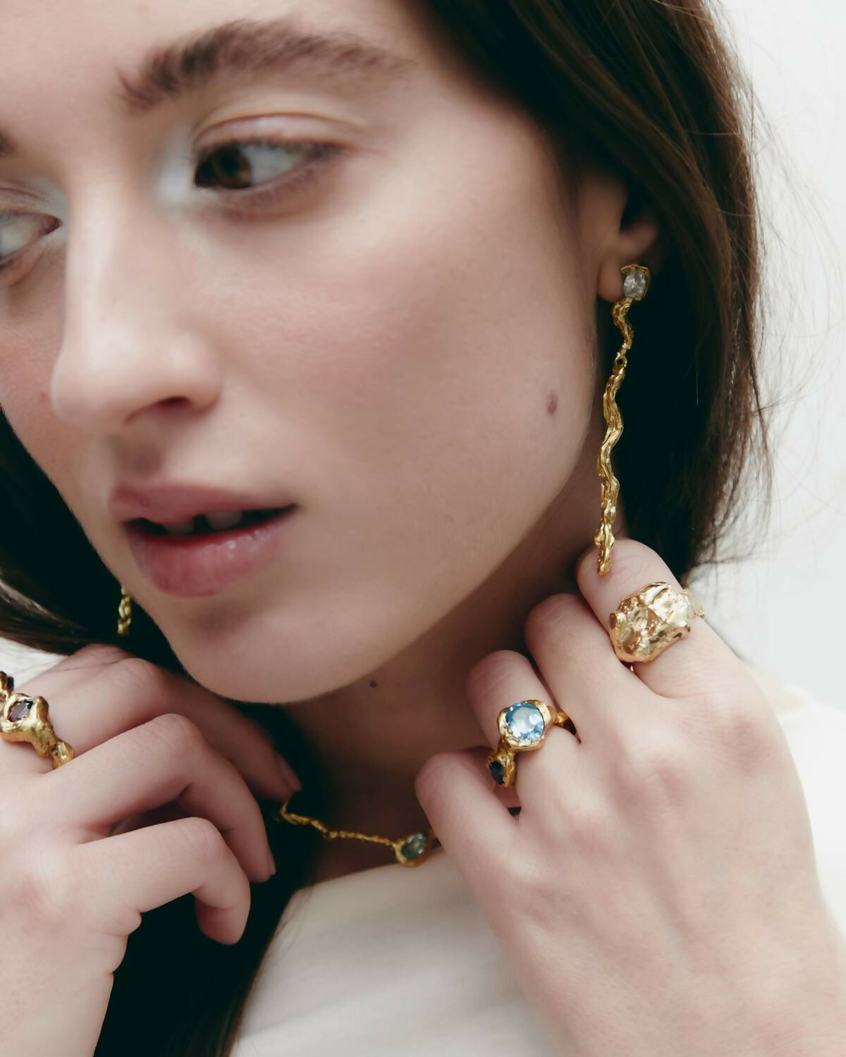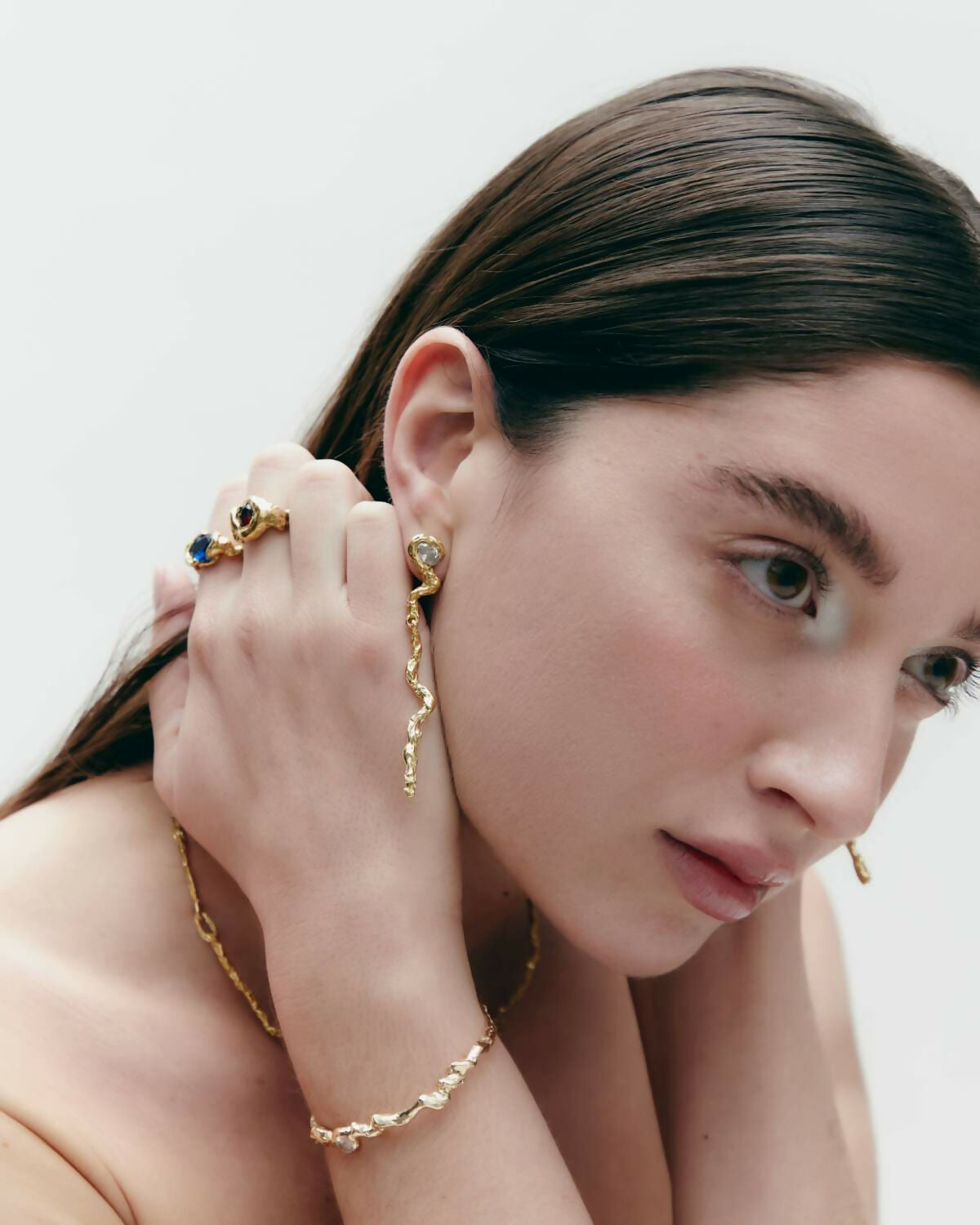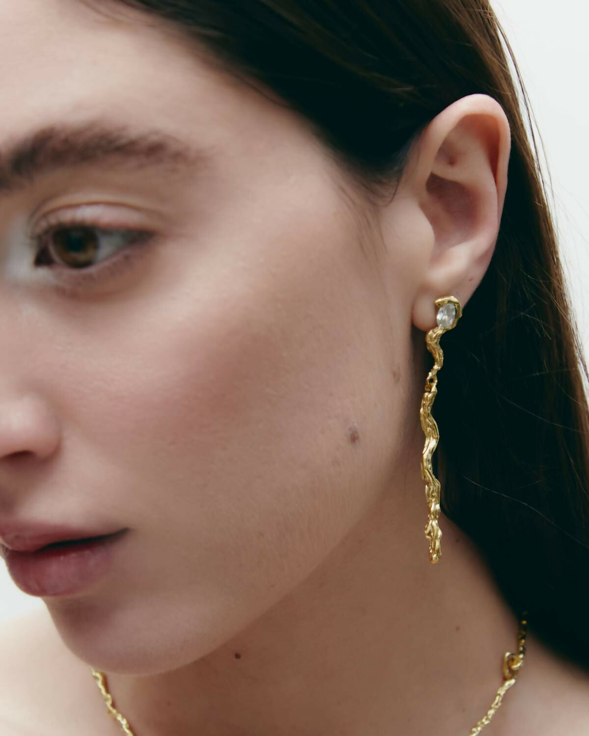 Earring made of 925 recycled silver silver plated in 18k gold composed of two bodies: the upper part holds a stone with a subtle gesture, while the lower one extends into a flowing silver line that adds movement and visual balance. Part of the mismatch series, allowing different pieces from the collection to be combined into unique compositions. Handmade in Barcelona, following the legacy of traditional jewelry, reinterpreted from a contemporary perspective. Each piece is handmade, which may result in small variations or natural imperfections that are part of its artisanal character
