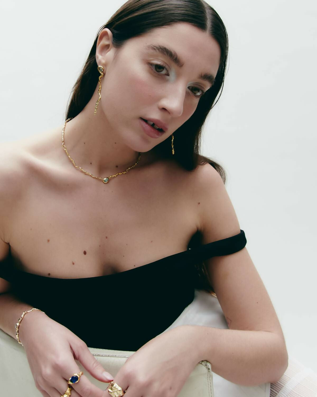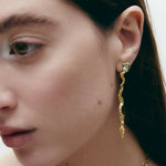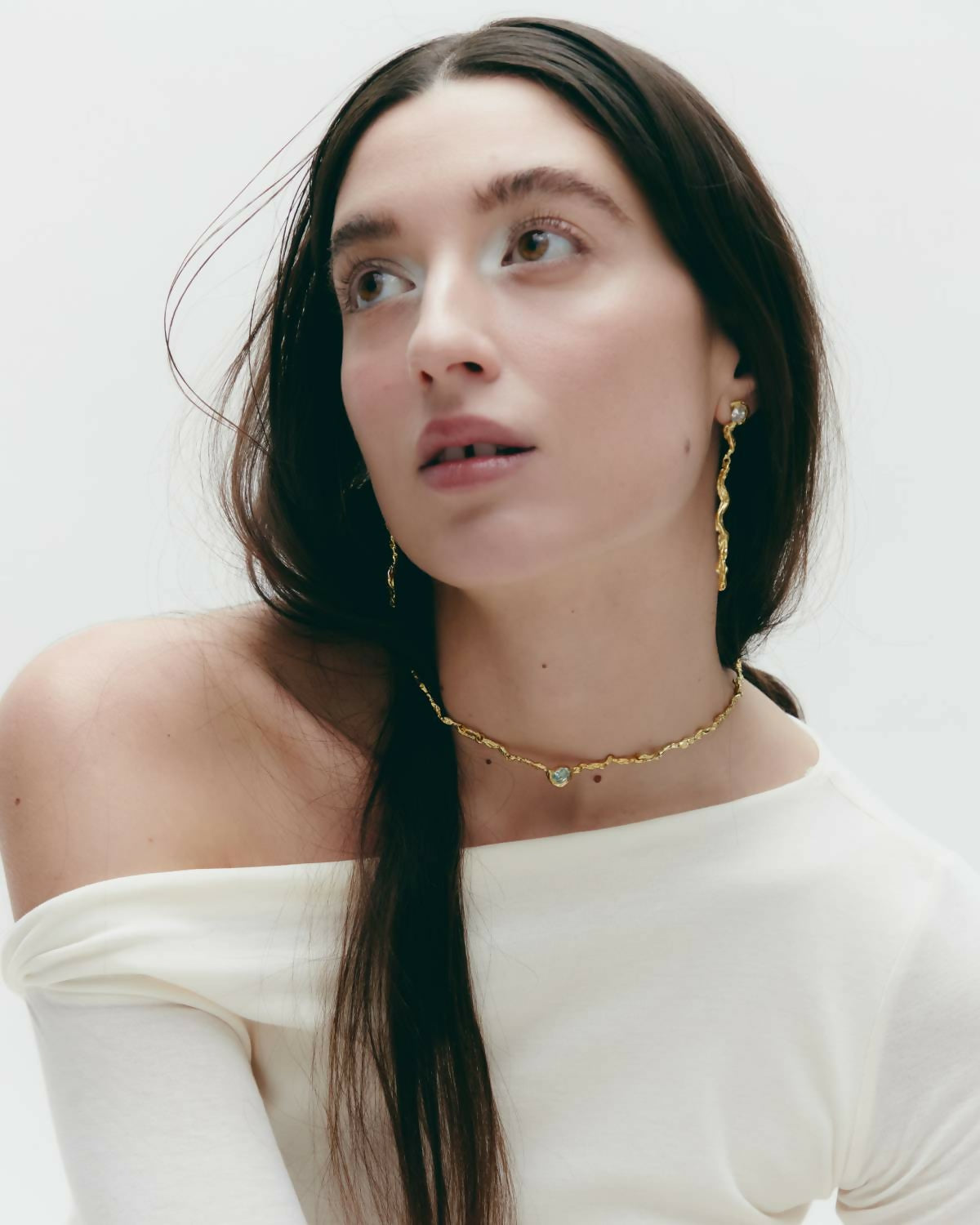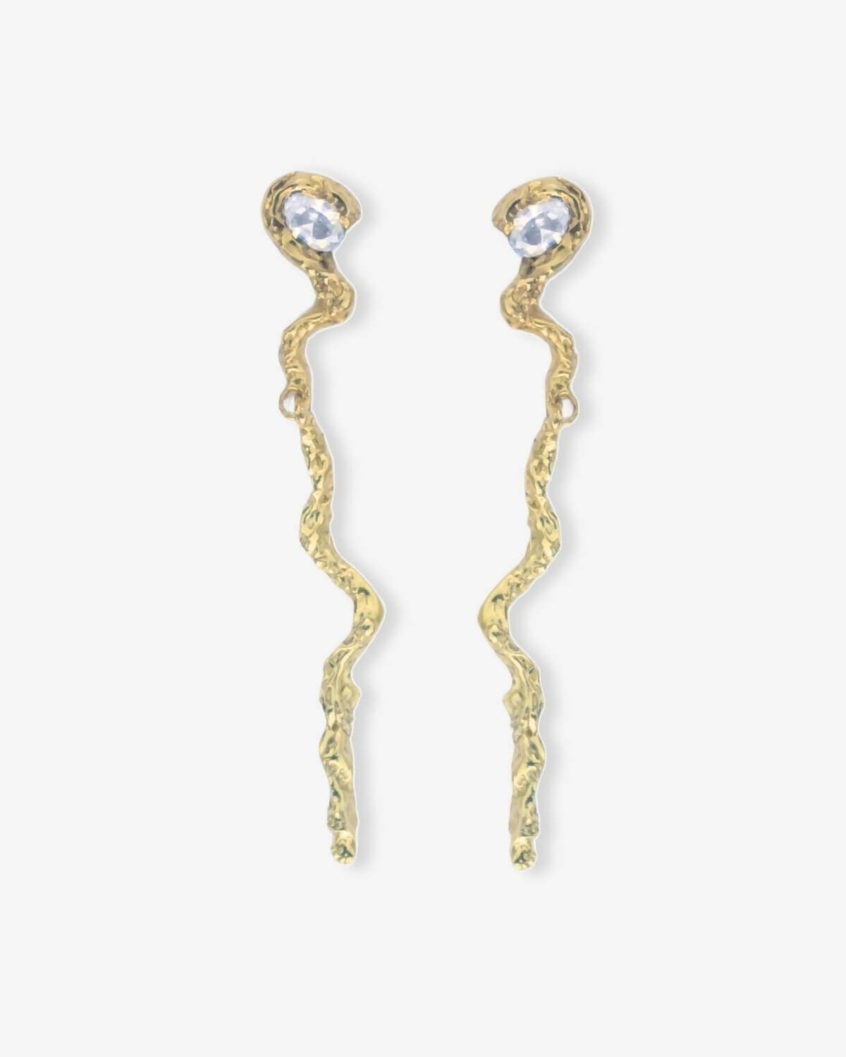 Earring made of 925 recycled silver silver plated in 18k gold composed of two bodies: the upper part holds a stone with a subtle gesture, while the lower one extends into a flowing silver line that adds movement and visual balance. Part of the mismatch series, allowing different pieces from the collection to be combined into unique compositions. Handmade in Barcelona, following the legacy of traditional jewelry, reinterpreted from a contemporary perspective. Each piece is handmade, which may result in small variations or natural imperfections that are part of its artisanal character