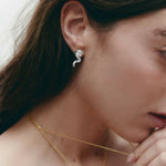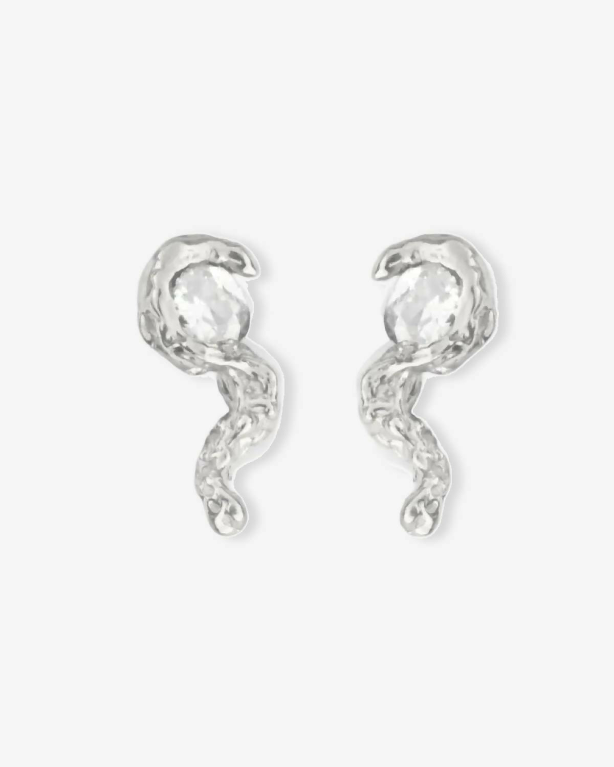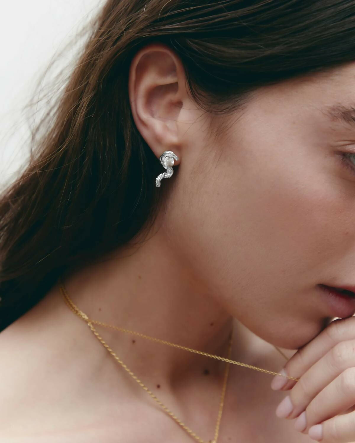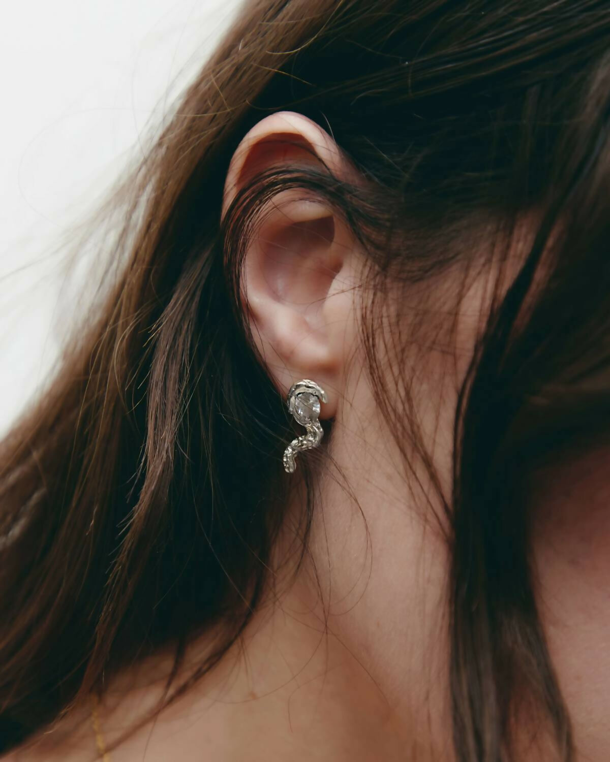 Earrings made of 925 recycled silver composed of two connected bodies: the upper part holds a stone, while the lower irregular silver form falls with organic movement. Their design allows them to be worn individually or combined with other pieces in the collection, creating asymmetrical compositions. Handmade in Barcelona, following the legacy of traditional jewelry, reinterpreted from a contemporary perspective. Each piece is handmade, which may result in small variations or natural imperfections that are part of its artisanal character.
