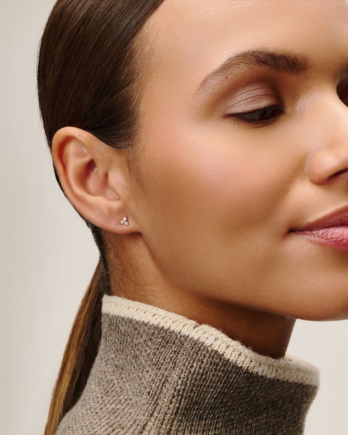 Three radiant diamond stones in perfect harmony – the Trinity stud embodies pure balance in miniature form. Surrounded by fine 14ct real gold plating, it blends modern design with timeless charm. A soft yet powerful trio of light, form, and glam.