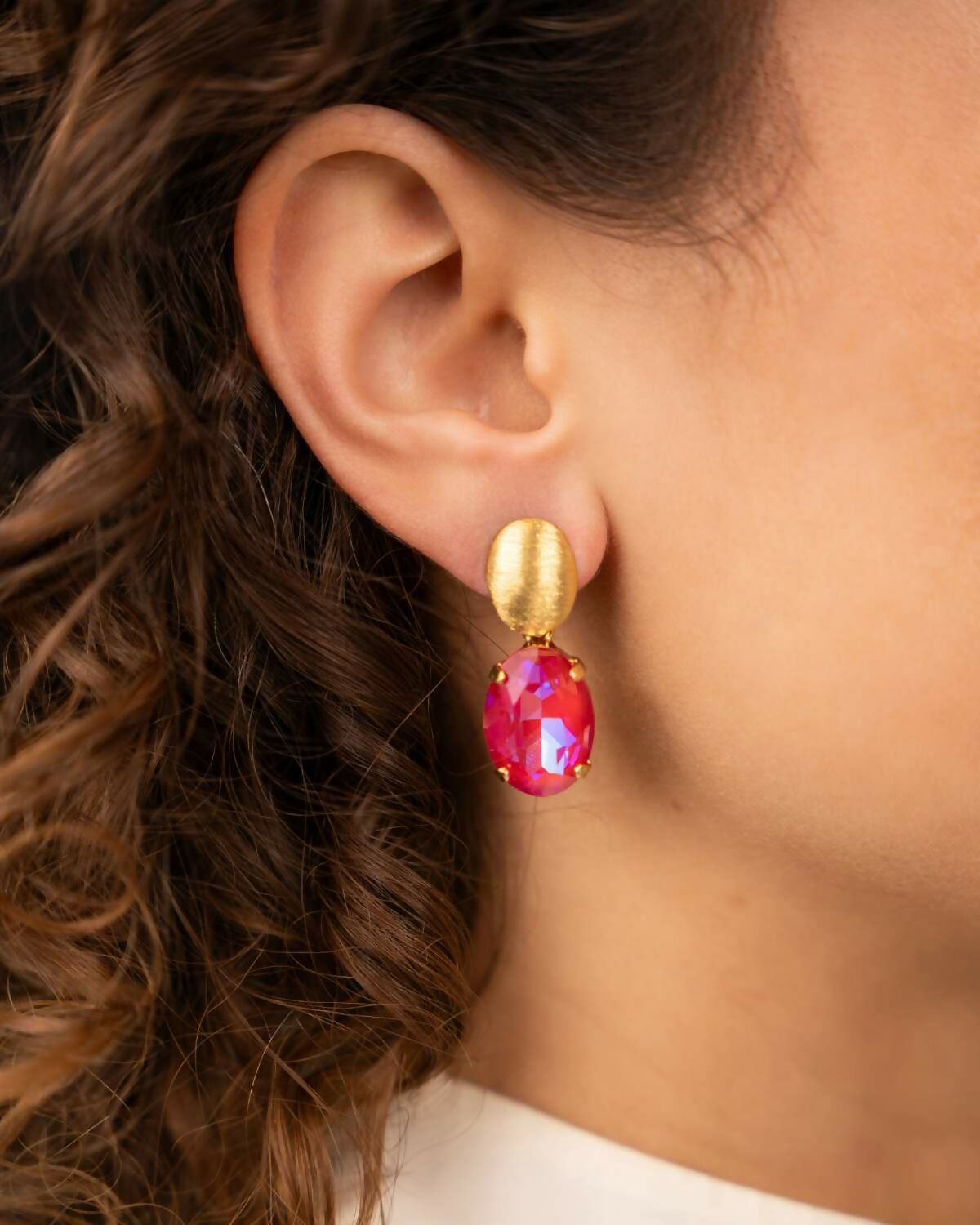 Erlebe einen Hauch von Lebendigkeit mit den 'Fuchsia Daan Oval Rhinestone Pendant Earrings' von LOTT. gioielli. Mit ihrer ovalen Form und den funkelnden Strass-Elementen in einem leuchtenden Fuchsia-Farbton versprühen diese wunderschönen Ohrringe einen verspielten und raffinierten Charme. Ihre schimmernden Details fangen das Licht auf eine subtile und elegante Weise ein und verleihen jedem Outfit einen Hauch von Glamour. Mit ihrem mittleren Gewicht sind diese Ohrringe angenehm zu tragen und eignen sich perfekt für den Alltag oder besondere Anlässe. Egal, ob Du sie zum Brunch mit Freunden oder zum Ausgehen trägst, sie werden mit Sicherheit die Aufmerksamkeit auf sich ziehen und deinen Stil auf ein neues Niveau heben. Kombiniere sie mit anderen Stücken aus unserer Kollektion für einen koordinierten und modischen Look. Bringe einen Hauch von Fröhlichkeit in deine Schmucksammlung mit den 'Fuchsia Oval Rhinestone Pendant Earrings' von LOTT. gioielli, entworfen von Daan. Ihr raffiniertes Design und die funkelnden Details machen sie zu einem unverzichtbaren Accessoire für jede moderne Frau. You deserve a LOTT.