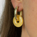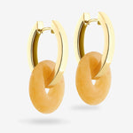 "The heart of our Mix and Match Collection: The hoops + Medium Calcite. Medium Calcite hoops are available as oval or round hoops. Your taste, your style decides which creation is the perfect choice for you. Do you love symmetrical and colored things? Then you can wear the beautiful calcite gemstone on both earrings. If you like asymmetrical and a bit conspicuous better, then we recommend wearing the gemstone on one earring and the freshwater pearl on the other. When it comes to pearls, you can choose between the Keshi Pearl and the Baroque Pearl. In comparison, the Keshi Pearl is softer and lighter, the Baroque Pearl heavier and more rounded in shape. Of course, you can also wear the hoops very clean without gemstones and pearls. These earrings give you great combination options - for every occasion and mood. The orange-yellow color of the calcite hoops can be combined particularly beautifully with warm pastel colors and cream-colored tones. Particularly simple outfits, such as turtlenecks and jeans, make the calcite hoops shine. The calcite gemstone is also a natural product. This means: Each gemstone has its own color expression. And for you, it means: every stone, every earring - unique."