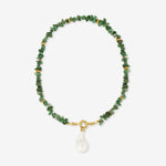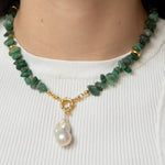 Statement chain with an impressive Baroque Pearl and green prase-flakes. This necklace is pure joy, like a summer day at the sea. The green prase-flakes are skillfully attached in a mirrored fashion and crowned by a breathtakingly beautiful Baroque Pearl. The necklace is easy to style, especially with light, summery fabrics like linen. It emphasizes bright colors and flatters your summer tan. Every gemstone is hand strung by us in our Hamburg Atelier. Of course the choice is yours between a statement with the Baroque Pearl or without for a simpler look.