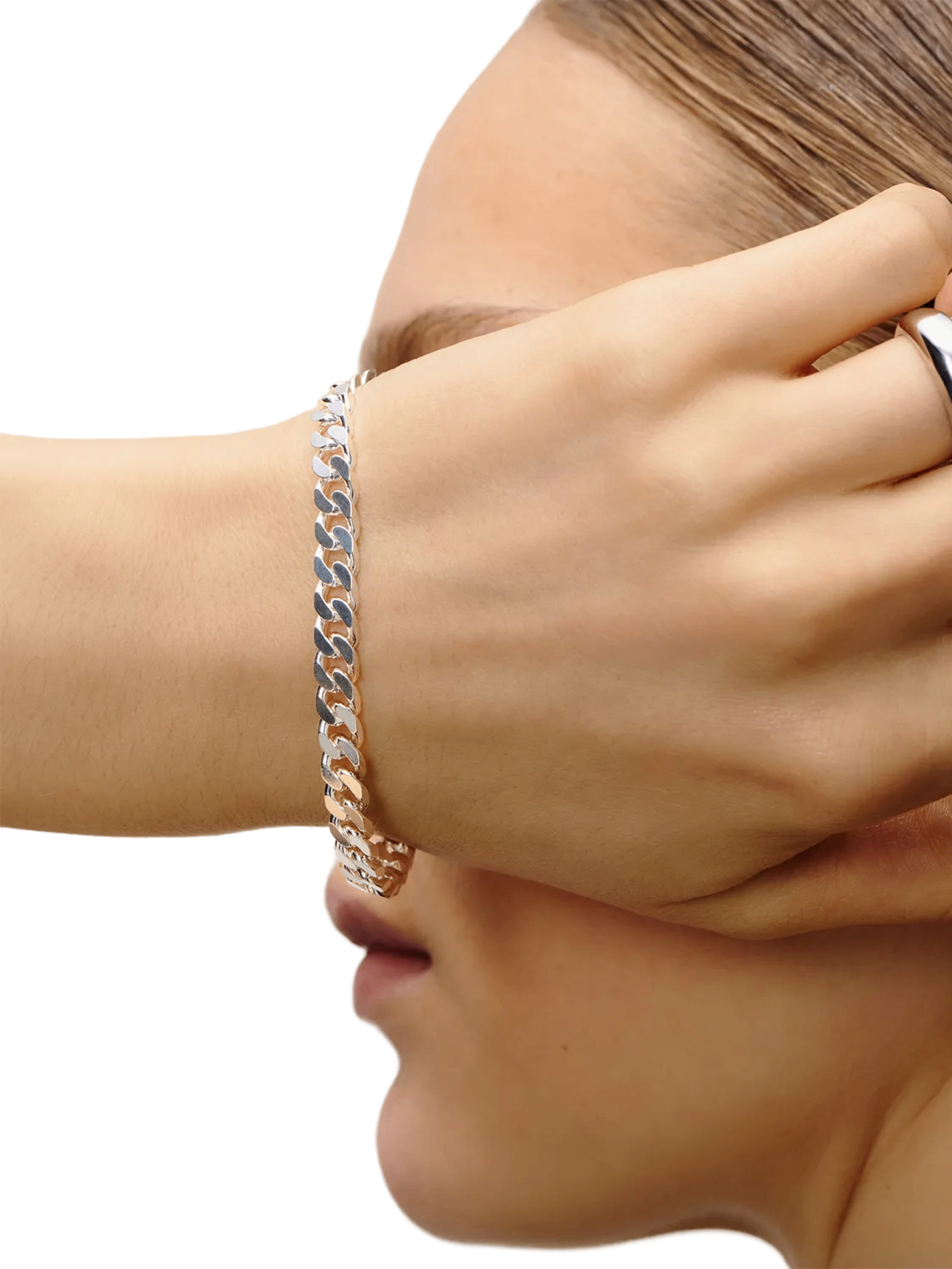 This elegant Pompidou bracelet proves that a wrist can also delight. The wide curb chain looks incredibly noble due to the high-quality 925 silver and is thus the perfect basis for trendy chain layering. Whether with other silver jewelry, feminine pearl bracelets, or cool leather accessories, this statement piece enhances any look.