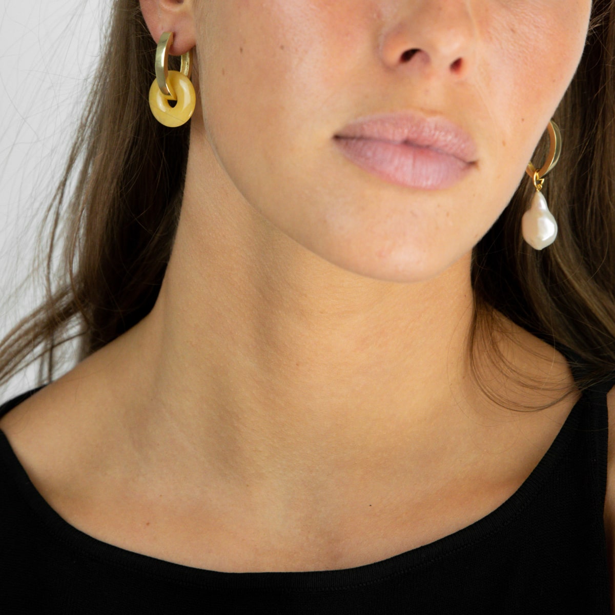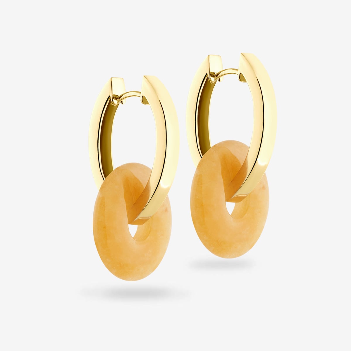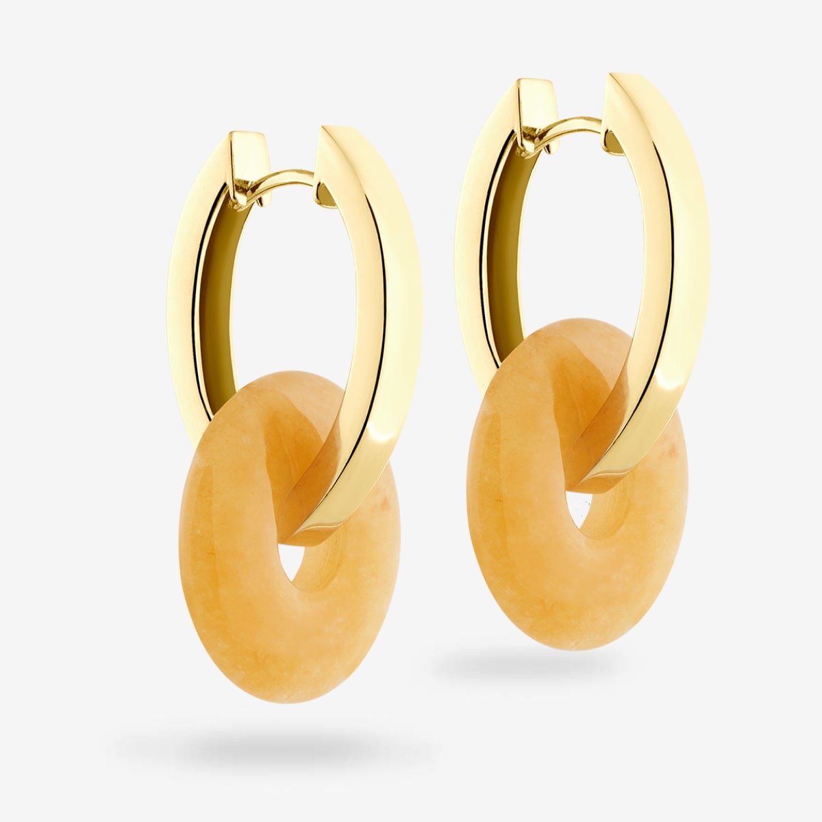 "The heart of our Mix and Match Collection: The hoops + Medium Calcite. Medium Calcite hoops are available as oval or round hoops. Your taste, your style decides which creation is the perfect choice for you. Do you love symmetrical and colored things? Then you can wear the beautiful calcite gemstone on both earrings. If you like asymmetrical and a bit conspicuous better, then we recommend wearing the gemstone on one earring and the freshwater pearl on the other. When it comes to pearls, you can choose between the Keshi Pearl and the Baroque Pearl. In comparison, the Keshi Pearl is softer and lighter, the Baroque Pearl heavier and more rounded in shape. Of course, you can also wear the hoops very clean without gemstones and pearls. These earrings give you great combination options - for every occasion and mood. The orange-yellow color of the calcite hoops can be combined particularly beautifully with warm pastel colors and cream-colored tones. Particularly simple outfits, such as turtlenecks and jeans, make the calcite hoops shine. The calcite gemstone is also a natural product. This means: Each gemstone has its own color expression. And for you, it means: every stone, every earring - unique."