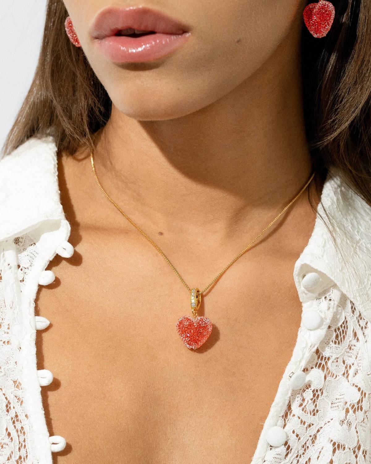 The Jelly Heart Rouge Pavé Pendant by Crystal Haze blends cheeky candy aesthetics with cool elegance. The red, crystal-textured heart glows under the light, while the pavé-set zirconia bail in sleek silver plating gives it a polished edge. A modern statement with playful energy – sparkling, fun, yet perfectly balanced.