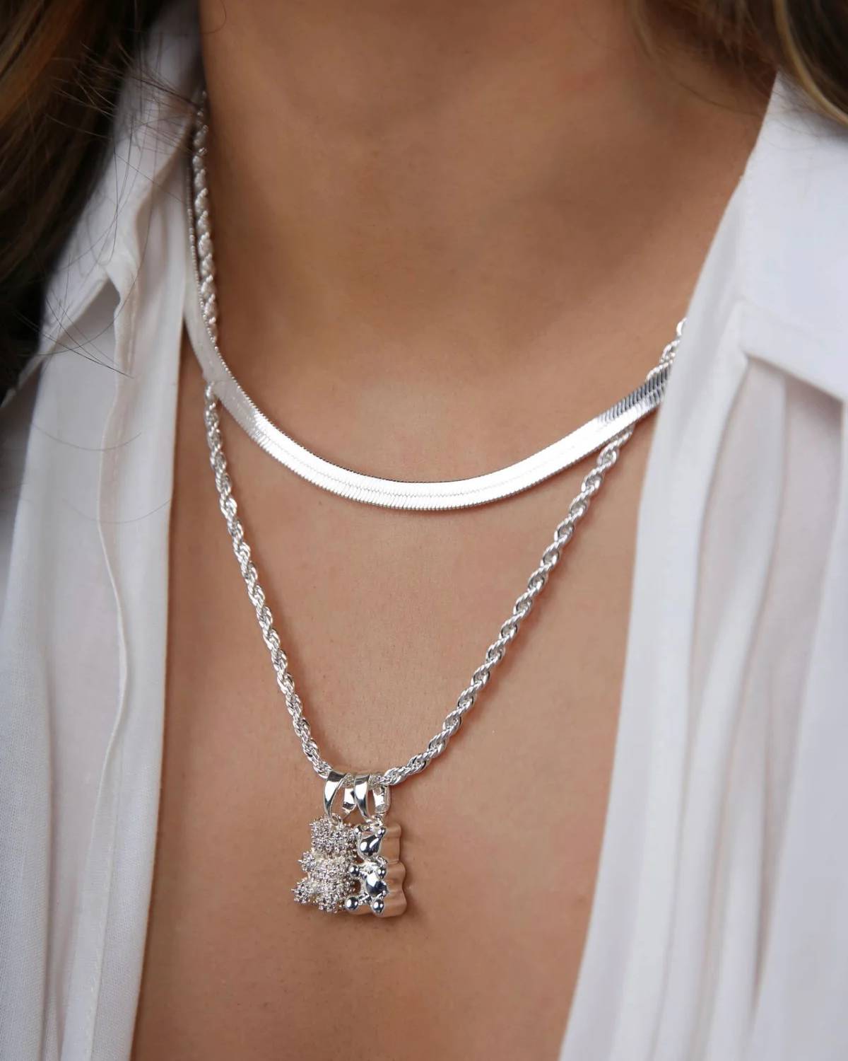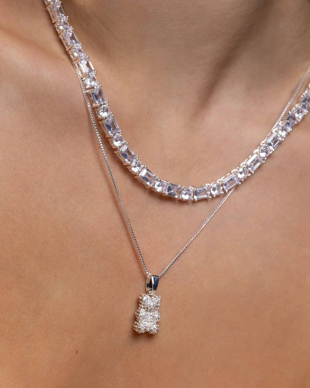 The Nostalgia Bear Pavé Pendant by Crystal Haze captures nostalgic energy with a modern glow. The signature bear pendant shimmers with zirconias, elegantly contrasted by sleek silver plating. A design suspended between retro and futuristic – playful, crisp, and subtly radiant with every move.
