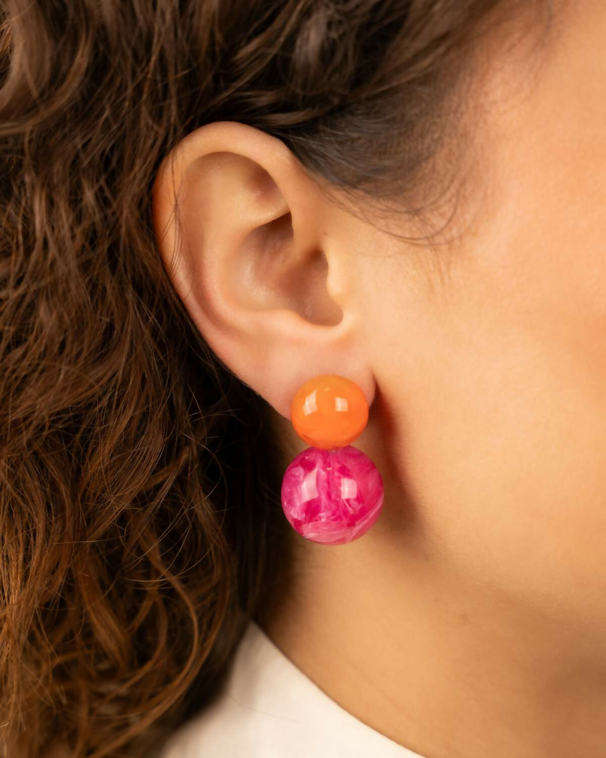 Diese wunderschönen Ohrringe sind ein Muss in deiner Schmucksammlung und eignen sich perfekt, um jeden Look mit einem Hauch von unaufdringlichem Luxus aufzuwerten. Diese einzigartigen Ohrringe bestehen aus zwei runden Kunststoffelementen, die sich untereinander befinden und ihnen einen raffinierten und eleganten Look verleihen. Mit ihrer leuchtenden fuchsia-farbenen und sommerlichen orangefarbenen Farbe sind sie eine auffällige Ergänzung zu jedem Outfit, und die Verwendung von hochwertigem Harz sorgt für einen luxuriösen Look, den Du jeden Tag tragen kannst. Lasse dich von der zeitlosen Schönheit der Orange Fuchsia Ohrrings verzaubern und verleihe deinem Stil mühelos einen Hauch von Glamour. Diese Ohrringe sind nicht nur ein Accessoire, sondern ein Statement für Stil und Raffinesse. Erlebe den Luxus und die Exklusivität von LOTT. gioielli und glänze mit diesen wunderschönen Ohrringen. You deserve a LOTT.