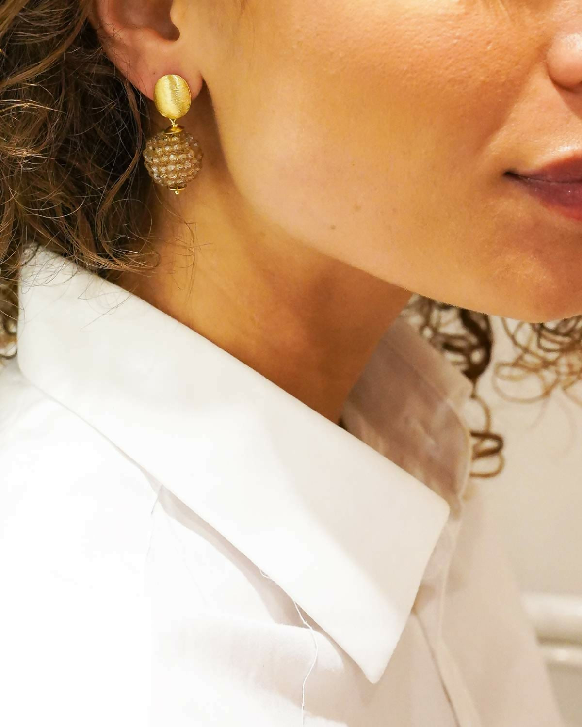 Ein dezenter Ohrring durch die Kombination der champagnerfarbenen Glasbeeren und einer gebürsteten Brosche