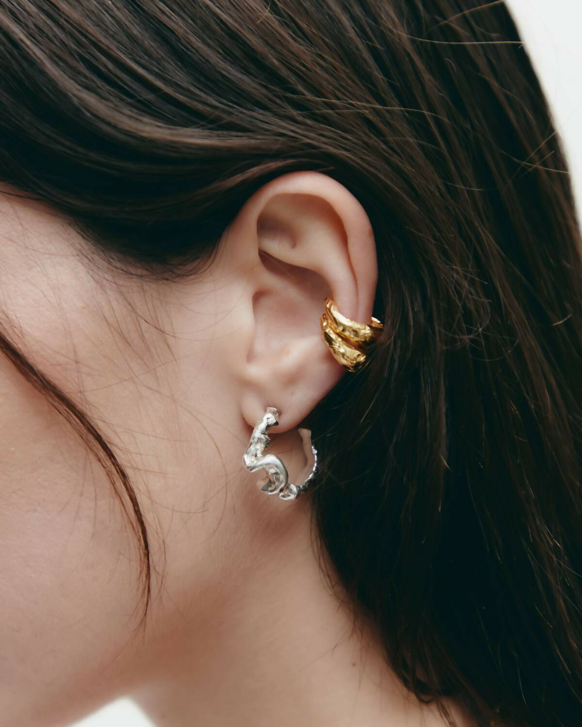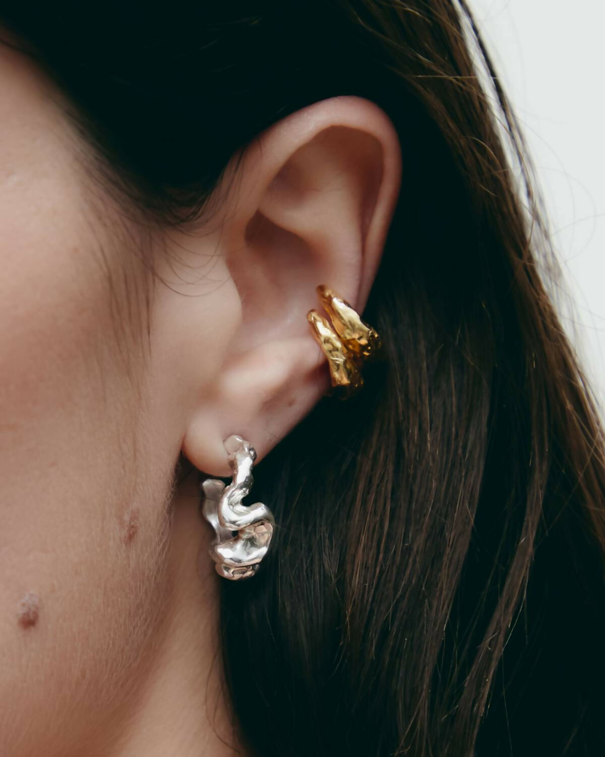 Earcuff made of 925 recycled silver plated in 18k gold composed of two sculptural bodies of different sizes joined together. Its design naturally embraces the ear without the need for piercing. An organic and contemporary piece that stands out for its artisanal character and sculptural form. Handmade in Barcelona, following the legacy of traditional jewelry, reinterpreted from a contemporary perspective. Each piece is handmade, which may result in small variations or natural imperfections that are part of its artisanal character.