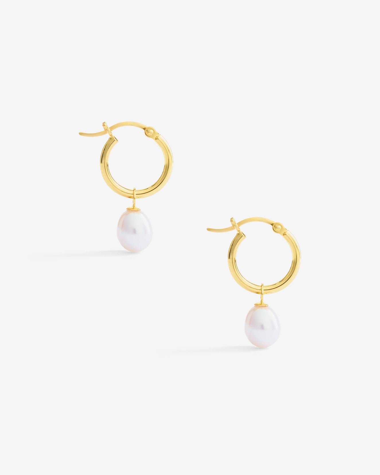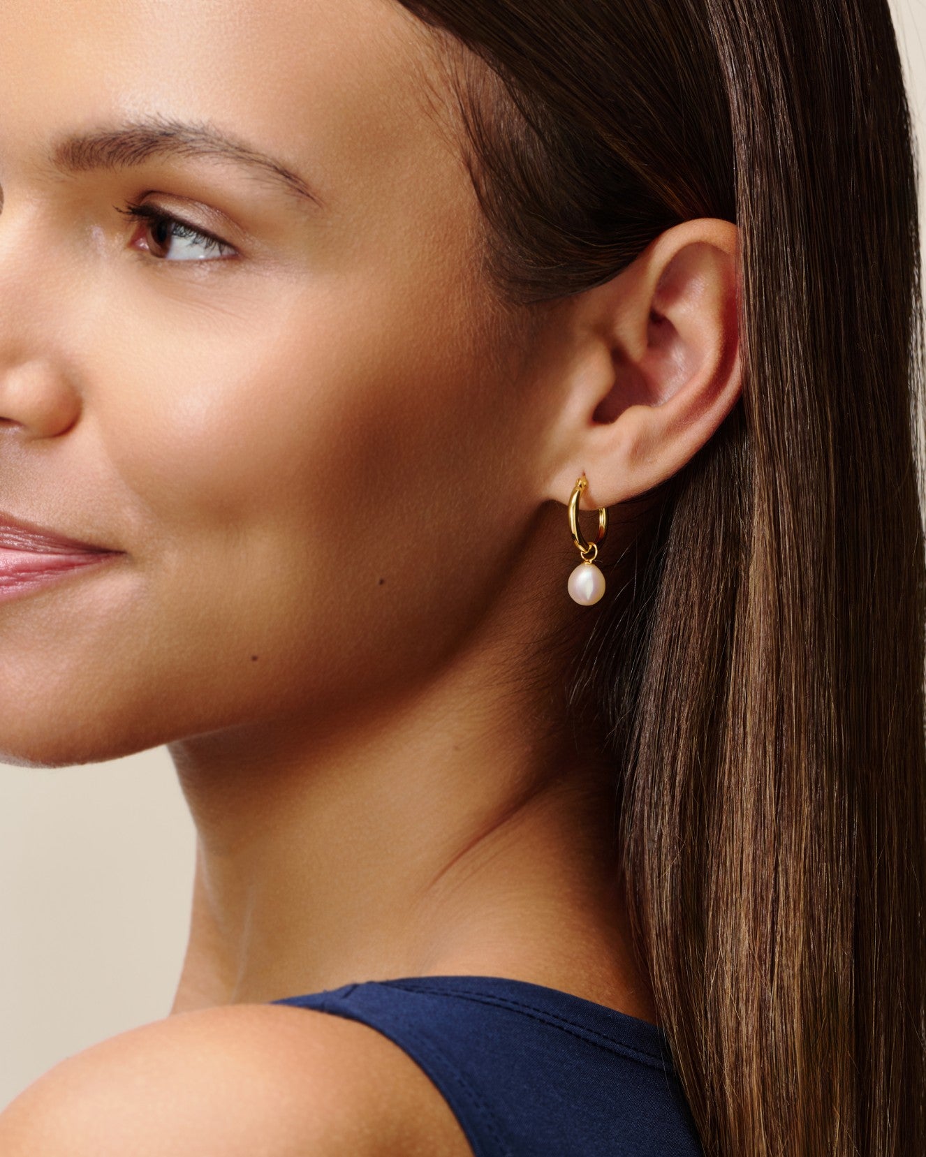 The highlight of your outfit! Add the perfect finish to any look with this enchanting mini hoop earrings made from gold-plated sterling silver. The oval freshwater pearl adds both class and elegance to these earrings. It emphasizes your femininity and flatters your beauty. Wear it with a ponytail or a pinned-up hairstyle to show it to its best effect.