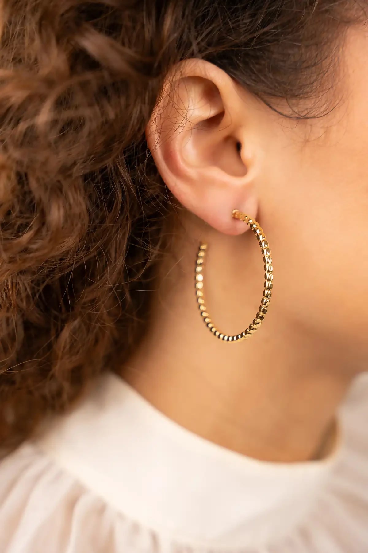 Classic hoops with intricate details belong in every jewelry collection. The New L earrings are exactly that. Made of gold-plated sterling silver, these hoops feature a fine texture that draws attention. Easy to integrate into a wide variety of looks!