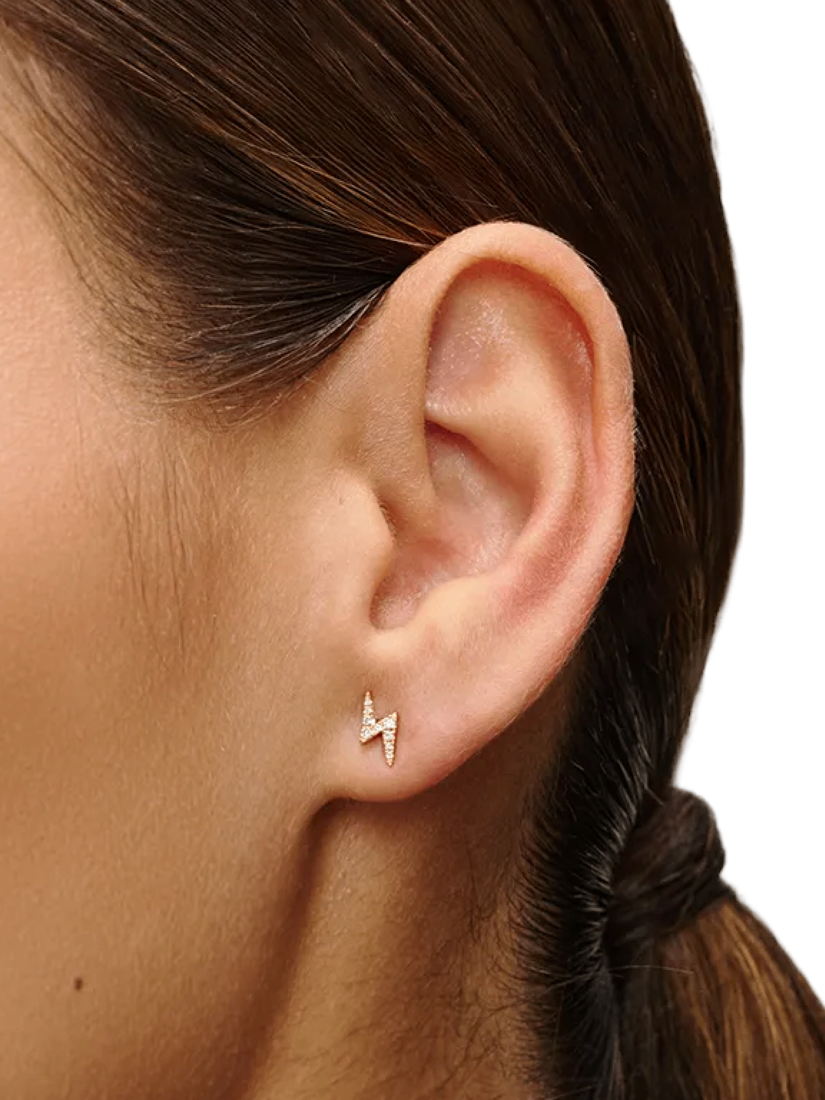 A spark of pure energy! The Lightning Bolt stud shines in 14ct real gold plating, accented with dazzling diamond stones. Its sharp, modern silhouette catches the light with every move – elegant, edgy, and with a touch of rock’n’roll. A power piece bursting with glam energy.