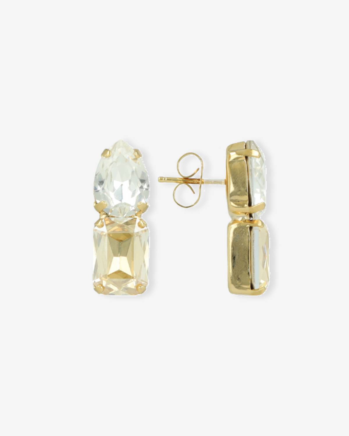 The Dani earrings by LOTT.gioielli charm with two bright, clear-cut crystals set in warm 18ct gold plating. Their minimal, modern design radiates understated glamour – perfect for lovers of effortless elegance.