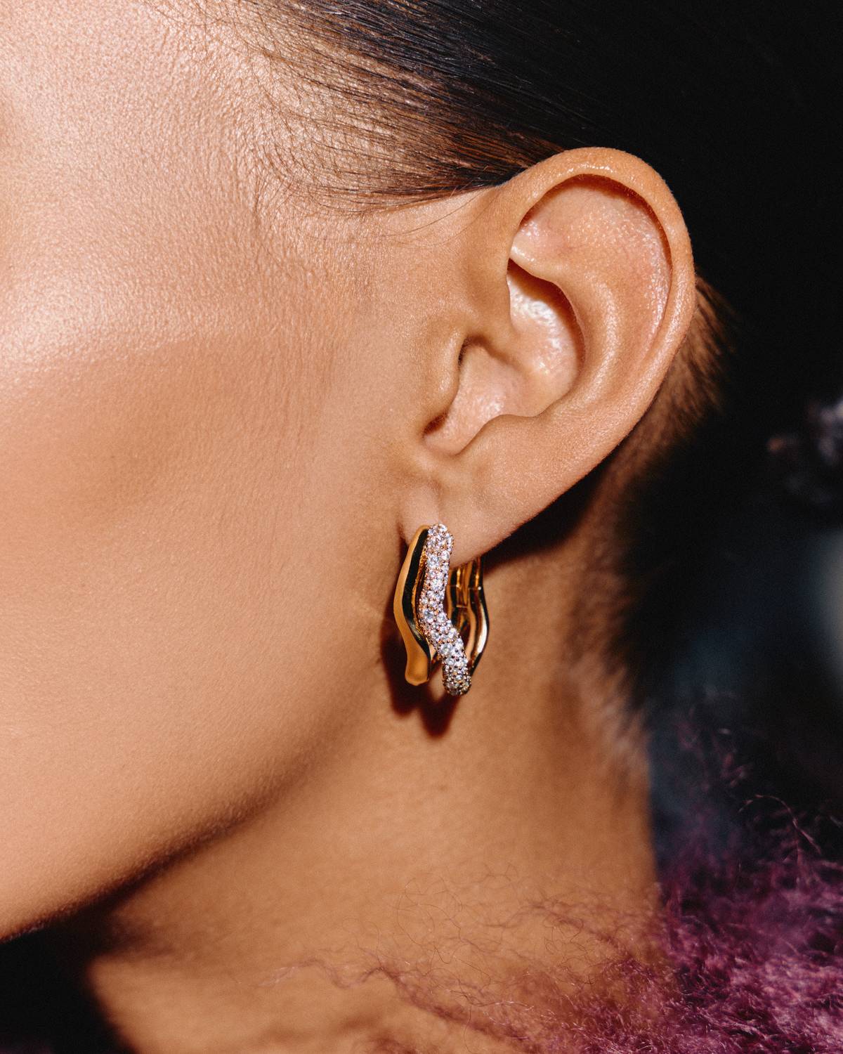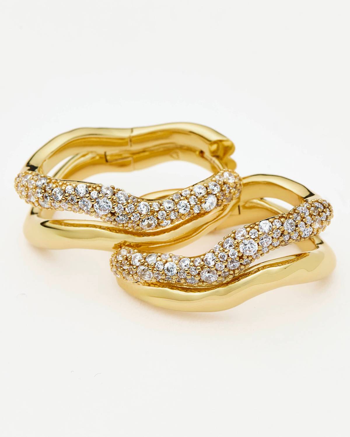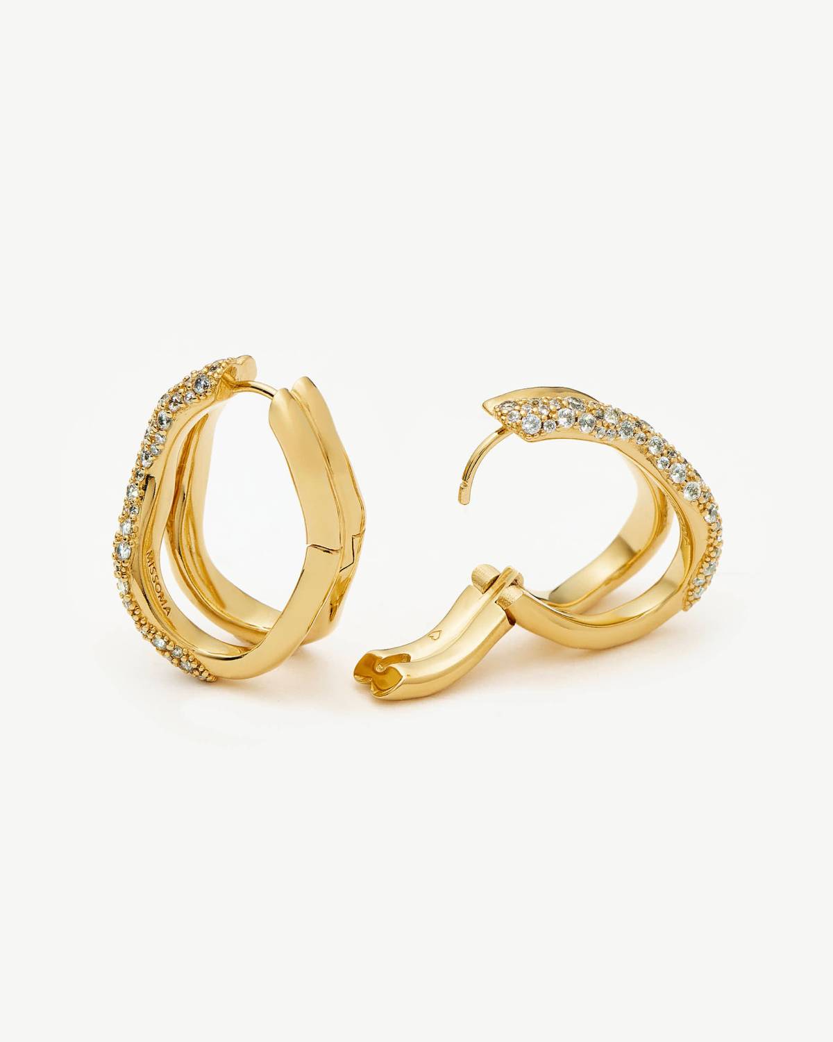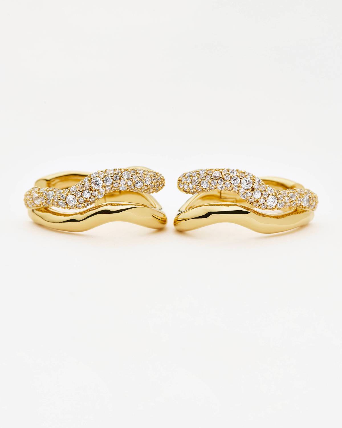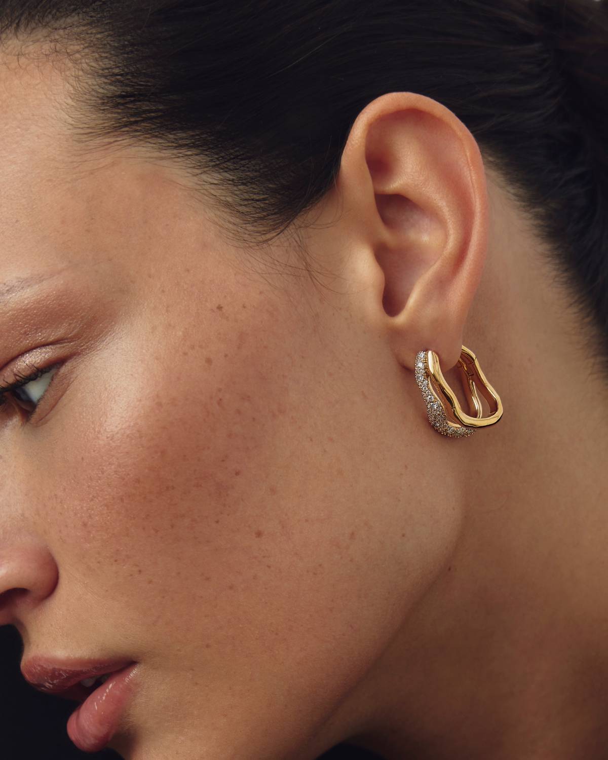 Molten Snow Double Medium Hoops unite two flowing wave bands in perfect harmony. Partly embellished with sparkling stones, they catch the light beautifully with every move. The 18kt gold-plated finish ensures a luxurious glow.