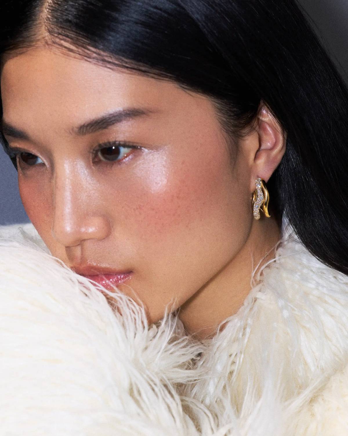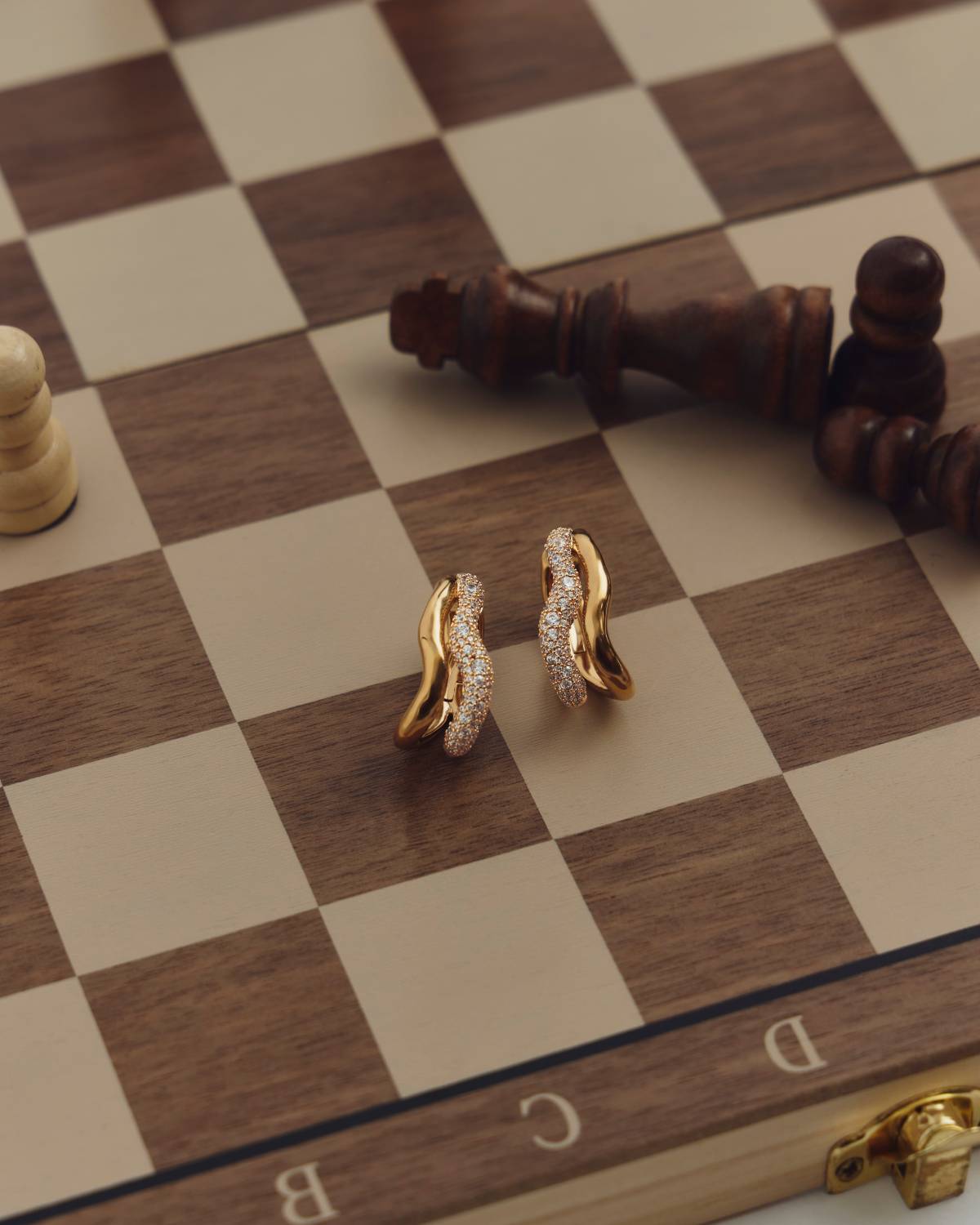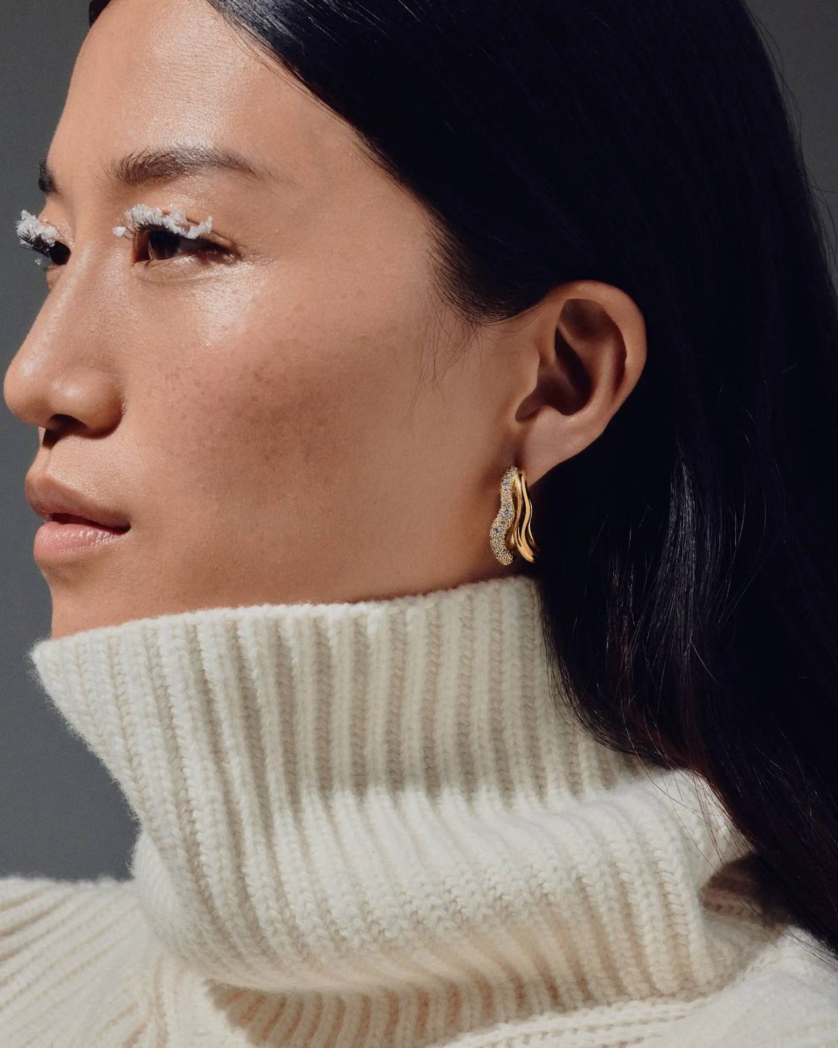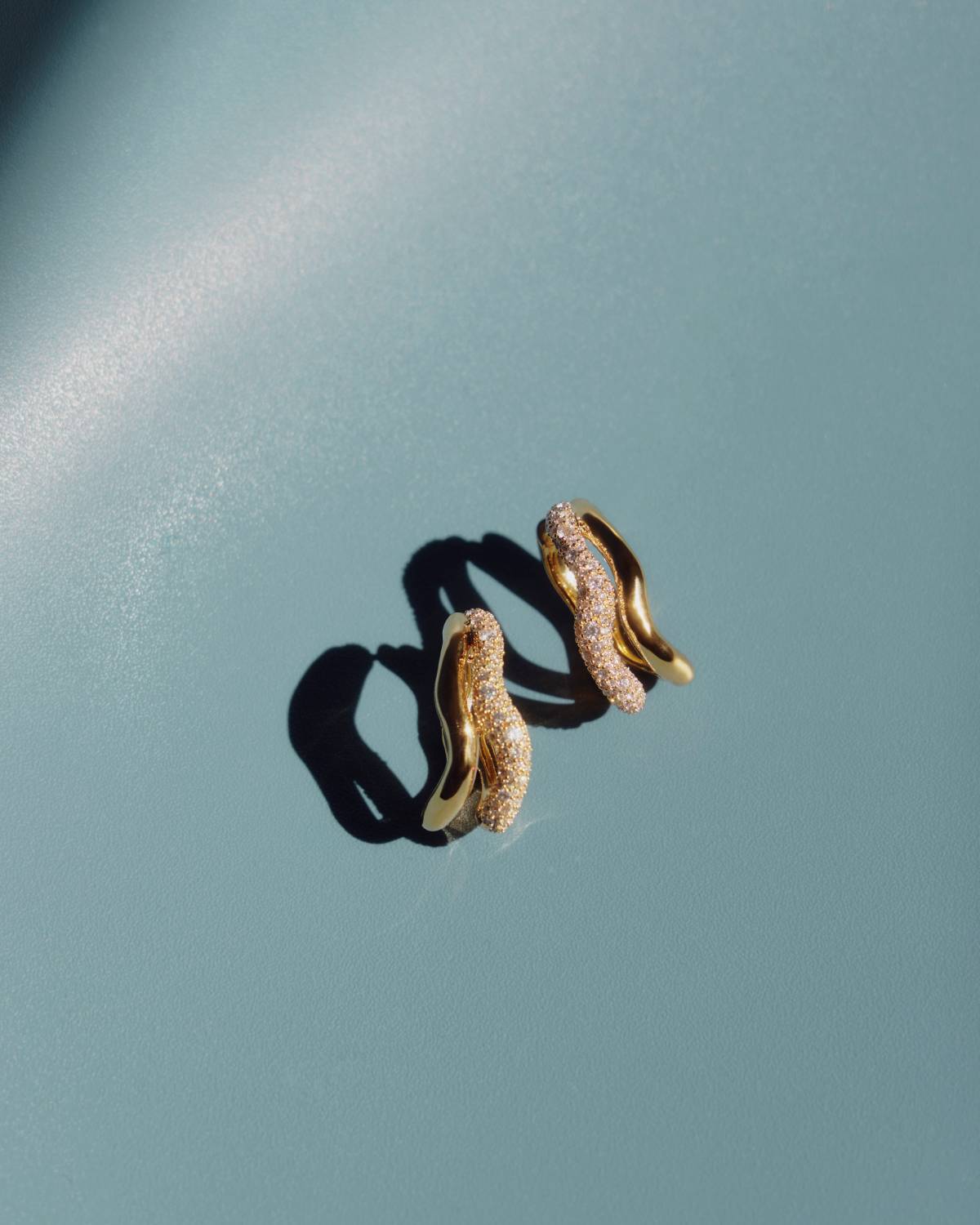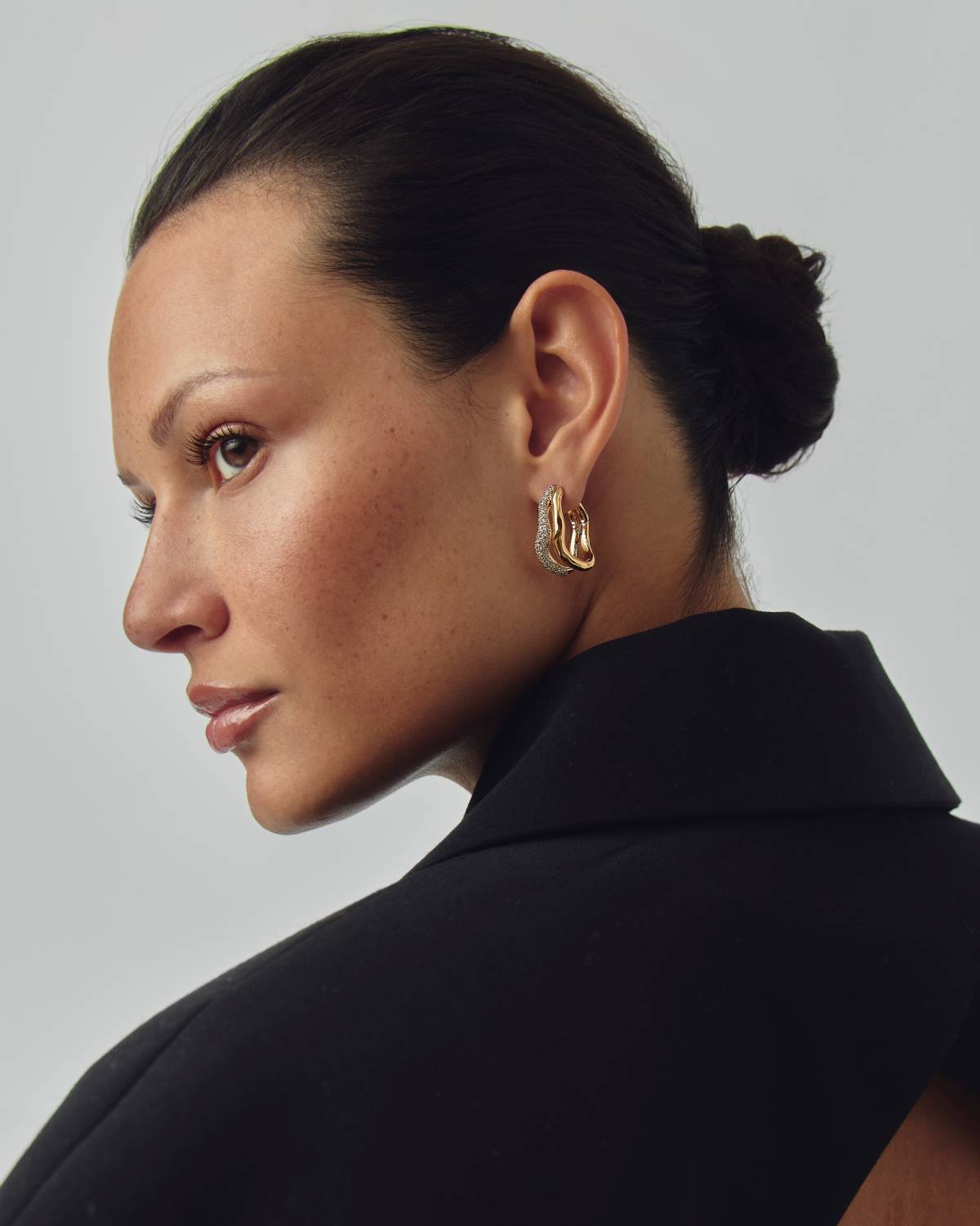 Molten Snow Double Medium Hoops unite two flowing wave bands in perfect harmony. Partly embellished with sparkling stones, they catch the light beautifully with every move. The 18kt gold-plated finish ensures a luxurious glow.