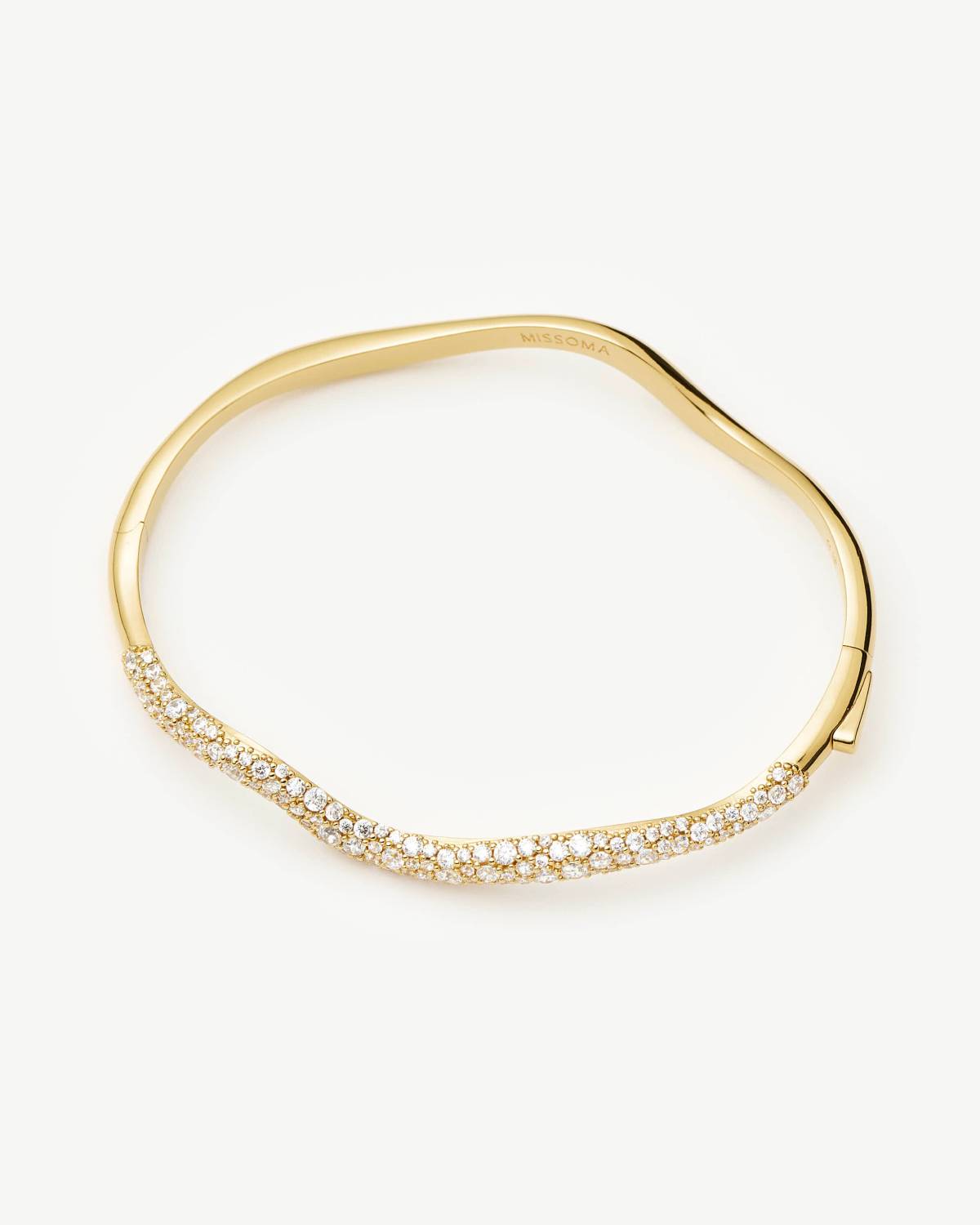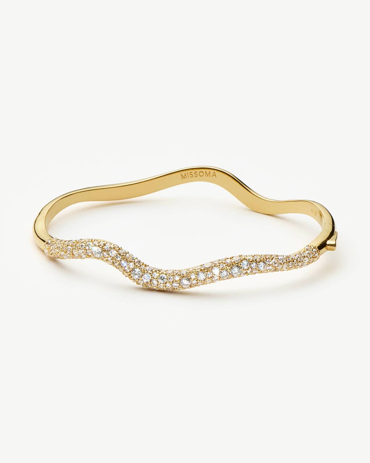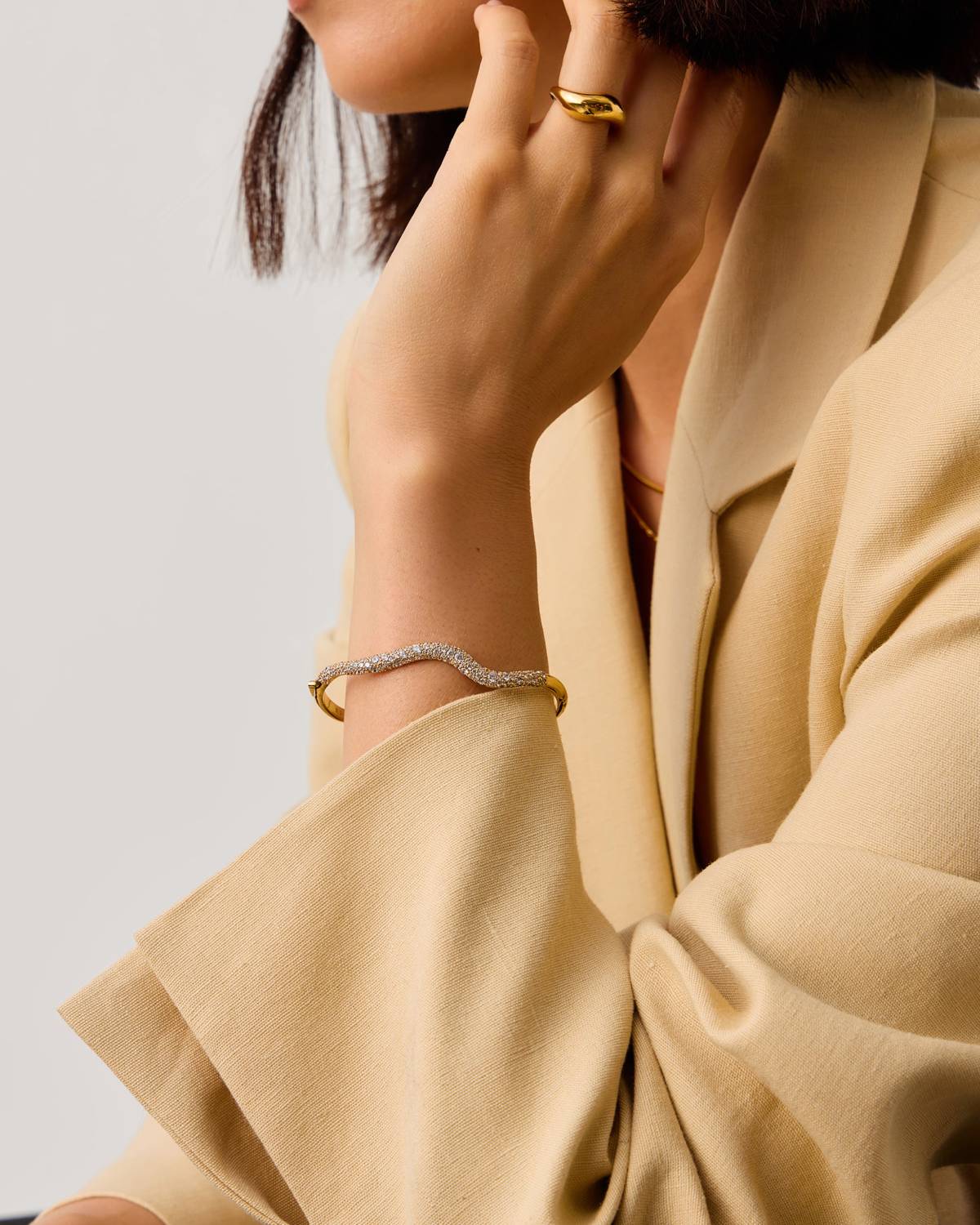 The Molten Snow Ripple Hinged Bangle adds sparkling elegance to your look. Its wavy, organic silhouette is adorned with shimmering details and finished in 18kt gold plating – a true showstopper full of movement and brilliance.