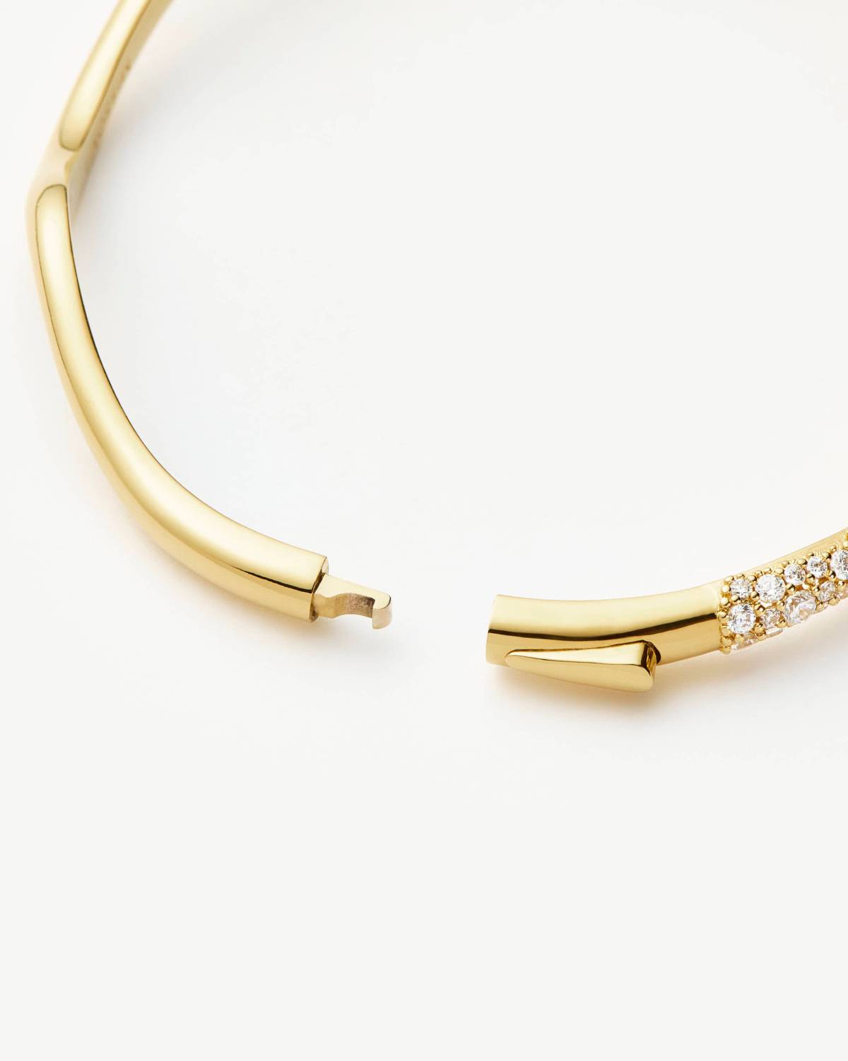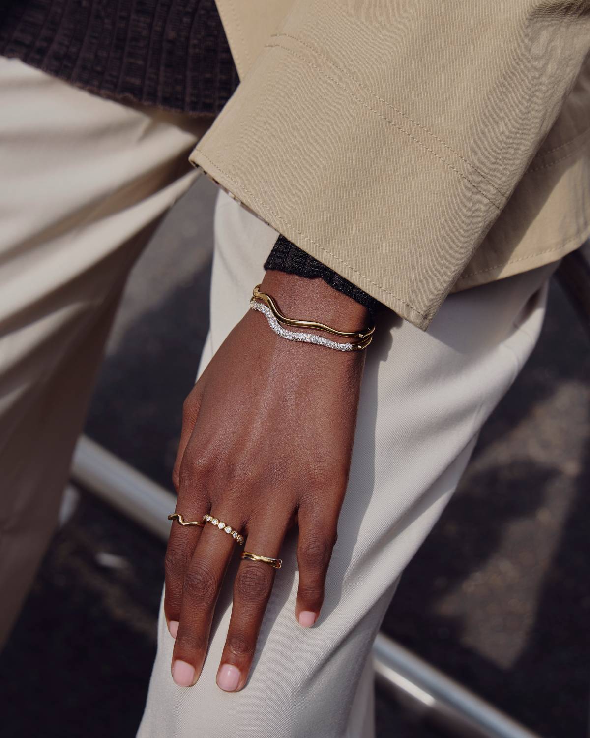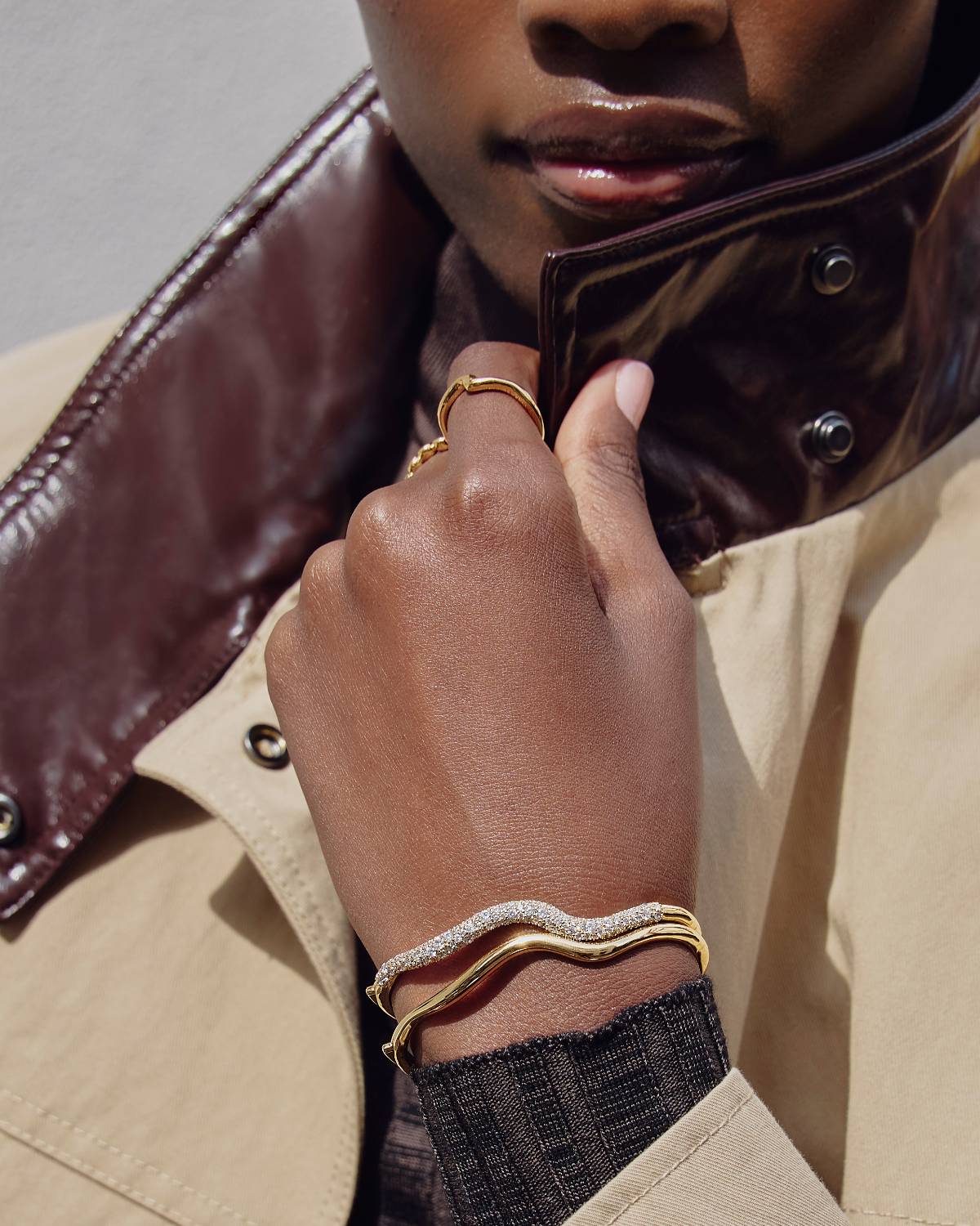 The Molten Snow Ripple Hinged Bangle adds sparkling elegance to your look. Its wavy, organic silhouette is adorned with shimmering details and finished in 18kt gold plating – a true showstopper full of movement and brilliance.