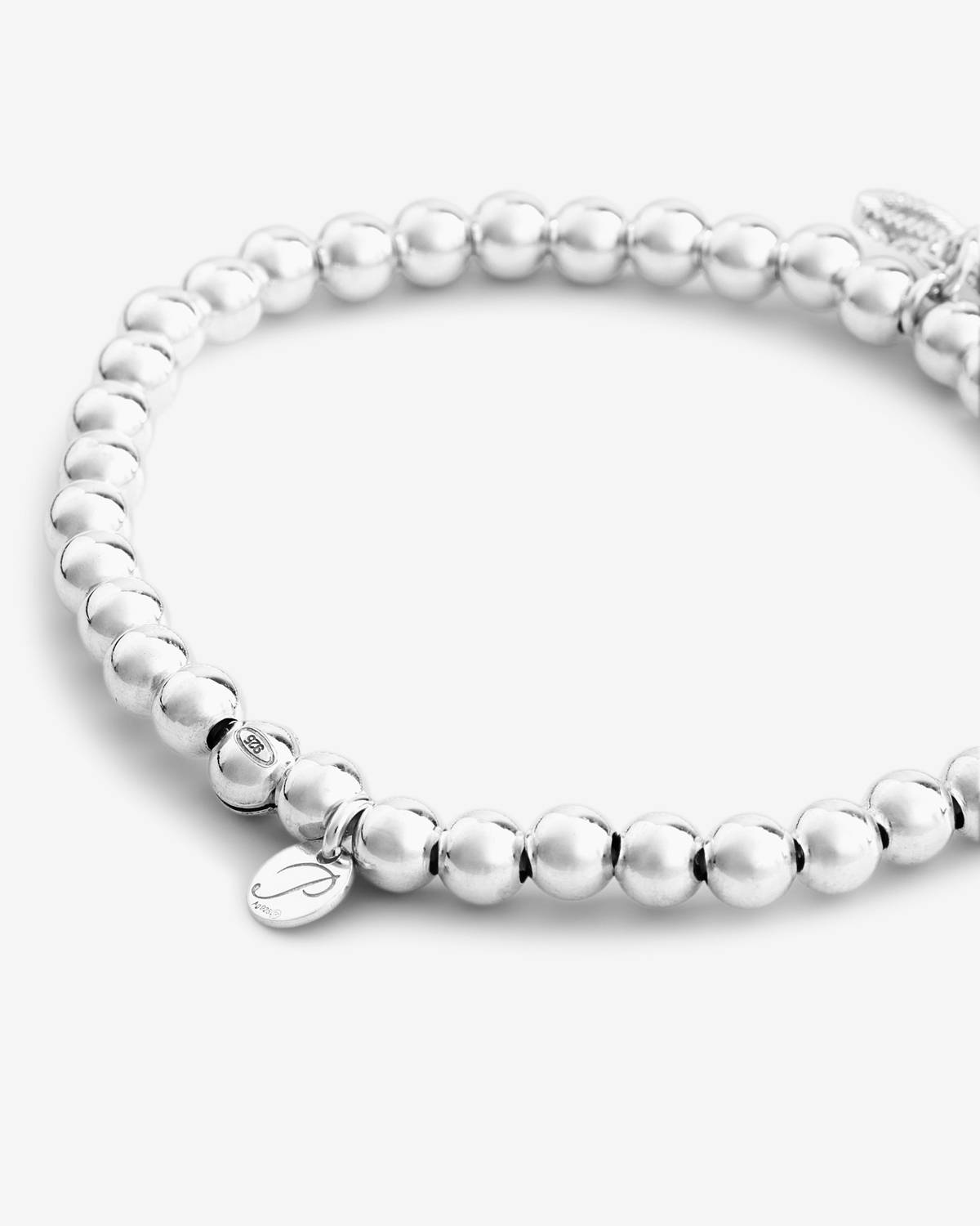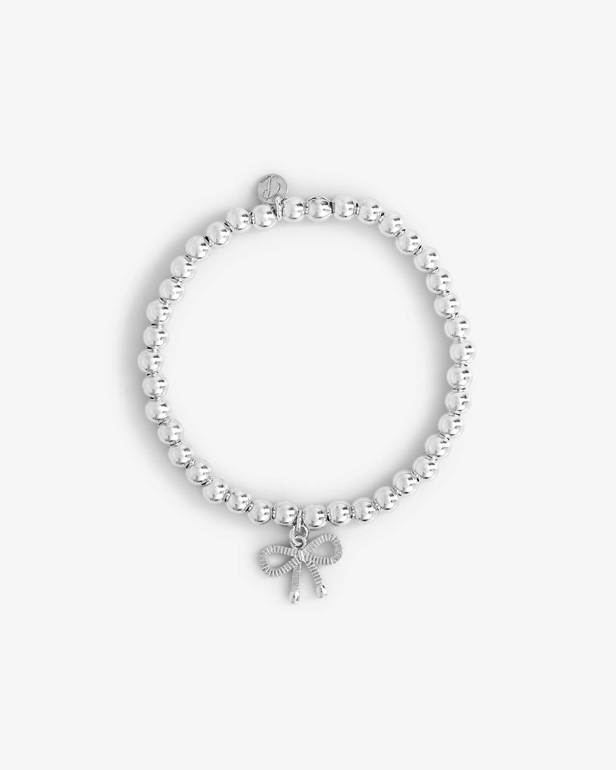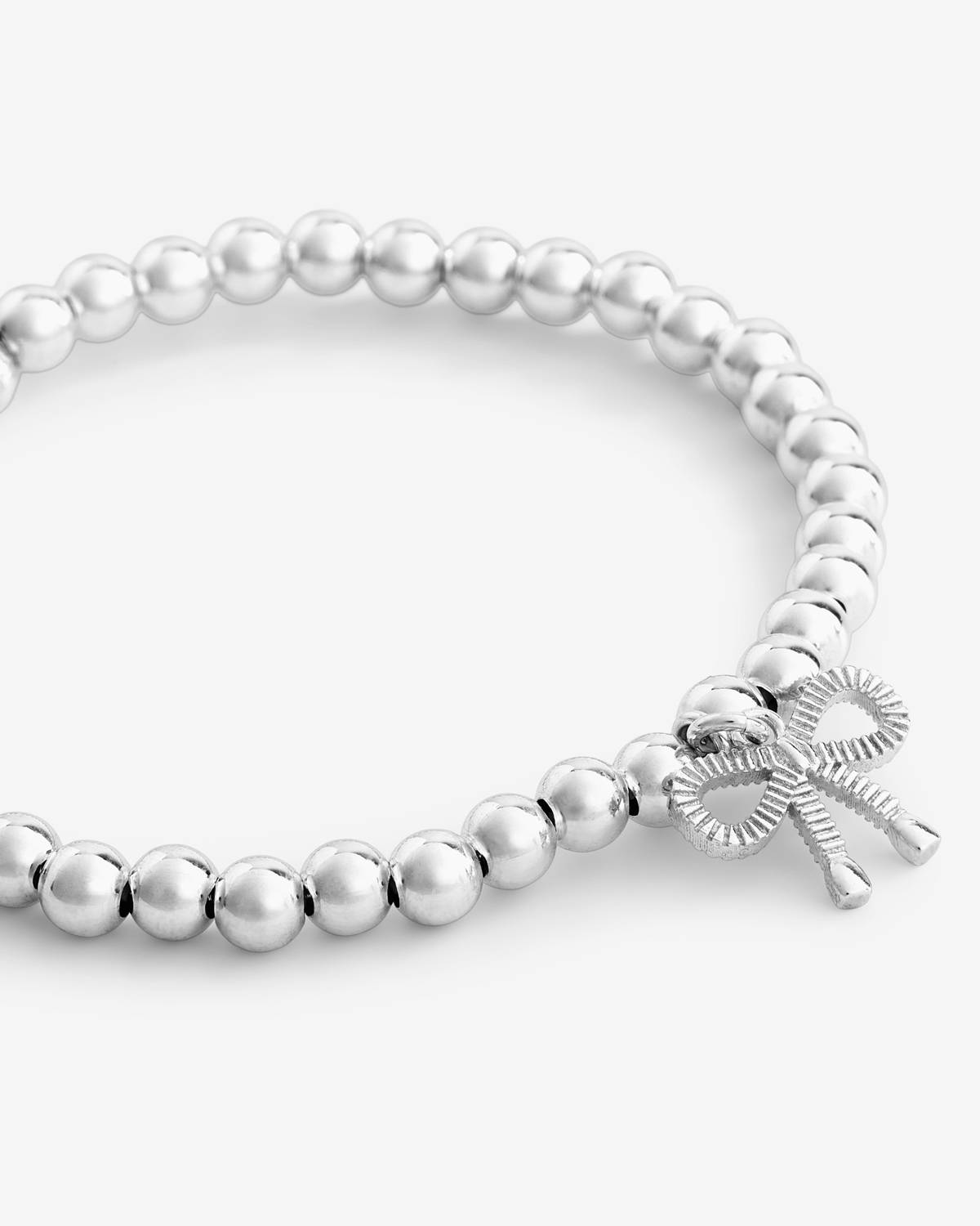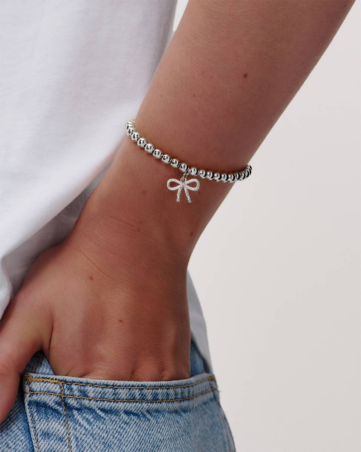 The Bow Bracelet in silver impresses with shiny beads and a subtle bow pendant. Its elastic structure provides comfort and fluidity – a refined design that unites shape and softness in perfect harmony.