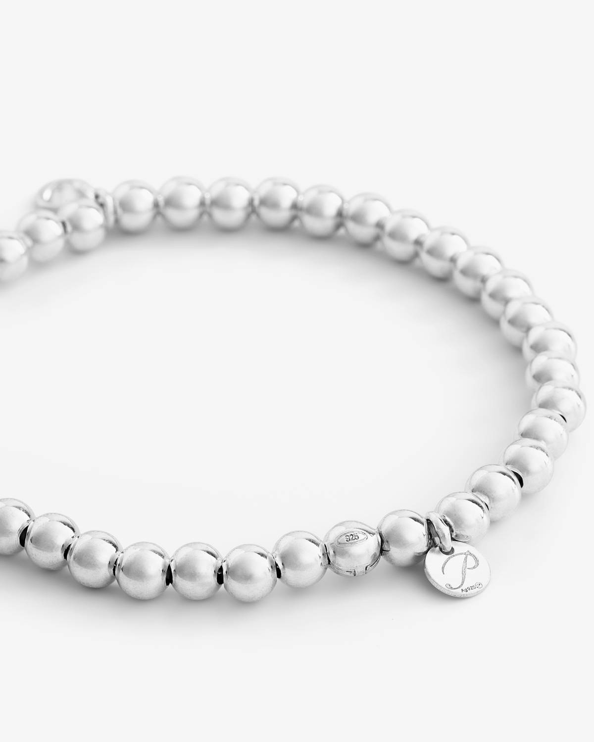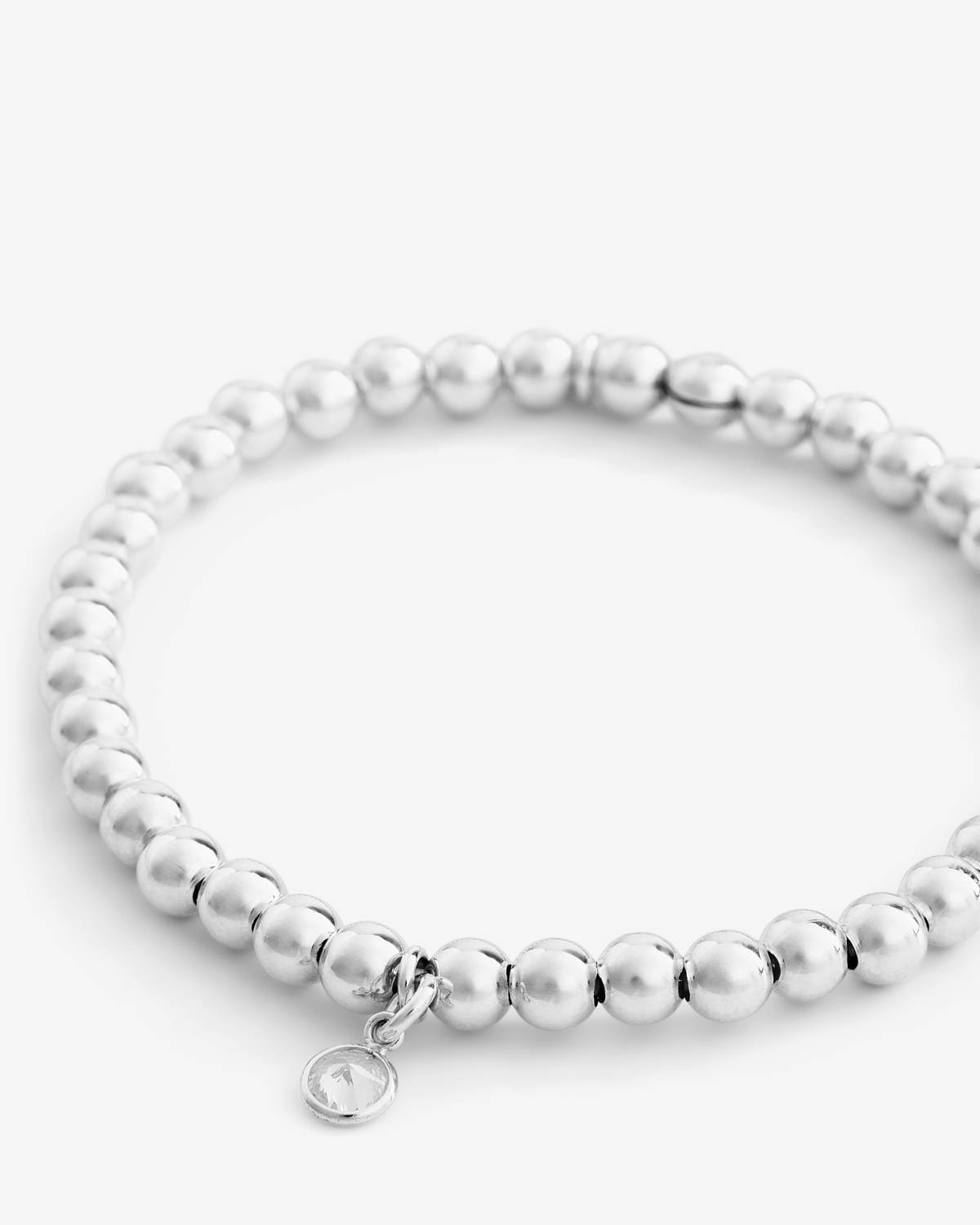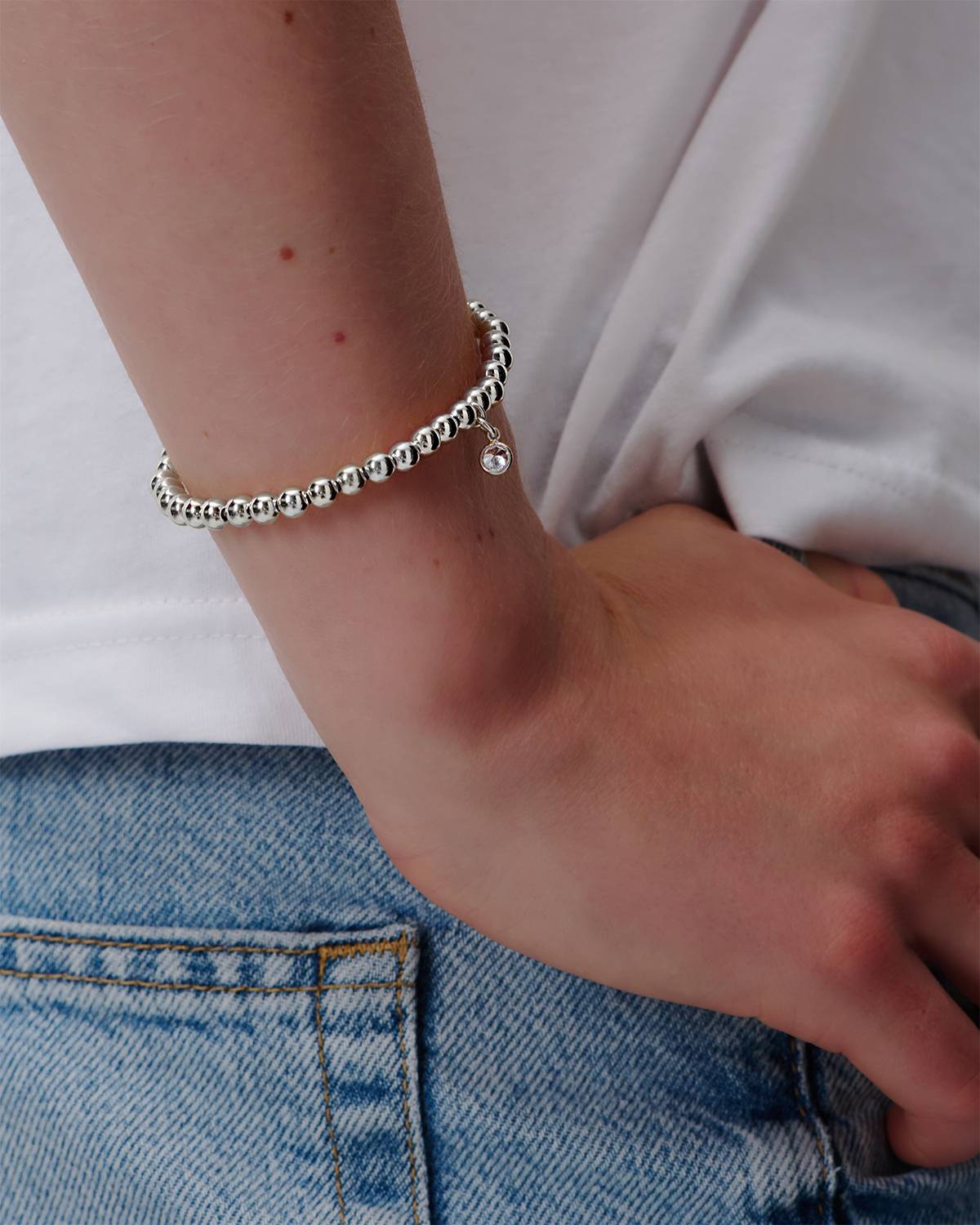 The Drop Bracelet in silver captivates with lustrous beads and a dainty drop charm. Elastic and easy to wear, it mirrors grace and simplicity – a modern, radiant piece that catches the light with every movement.