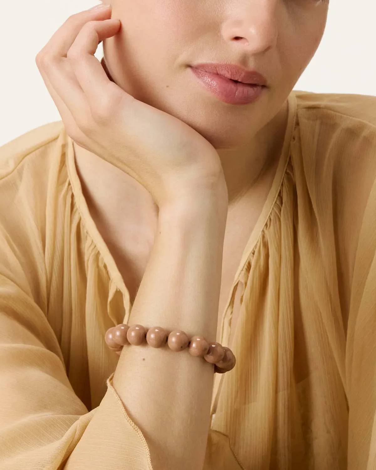 The Mini Beads Flex Bracelet Mocha Mouse, yellow-gold plated, plays with soft coffee and cocoa shades in round, matte mini beads. The even bead shape looks clean and modern, while the flexible band makes it super comfy for everyday wear. A yellow-gold plated brass detail adds a warm golden flash. Minimal, playful, and perfect for layering with other colors.