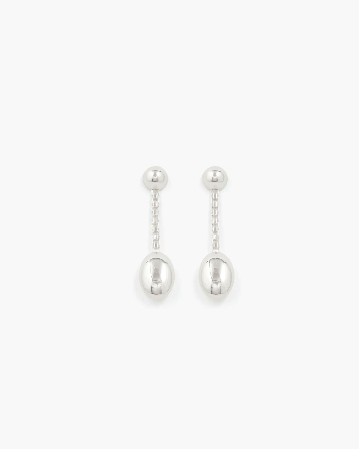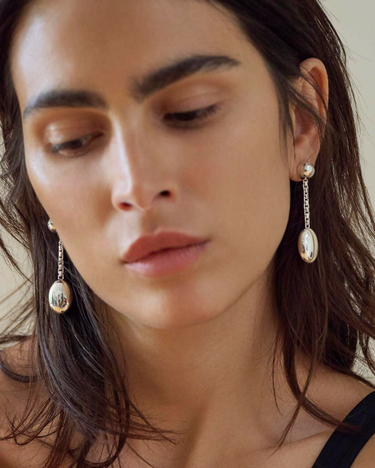 A bold pair of earrings that will draw attention from the moment you put them on. Assembled by a half sphere, custom chain and oval pendant, these earrings will move beautifully with your every maneuver.The earrings are crafted in 925 sterling silver, and the hollow shapes make them lightweight and comfortable to wear.