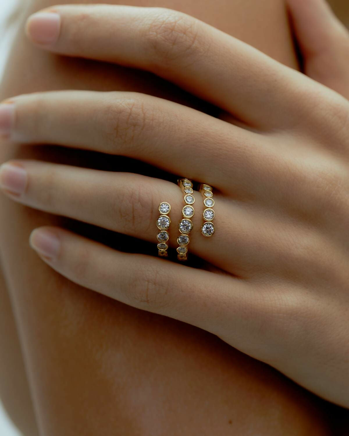 A spiral ring adorned with varying sparkly crystal white brilliant-cut CZ stones set in 925 sterling silver. Its spiral design offers a unique and elegant look, making it a perfect accessory for any occasion.