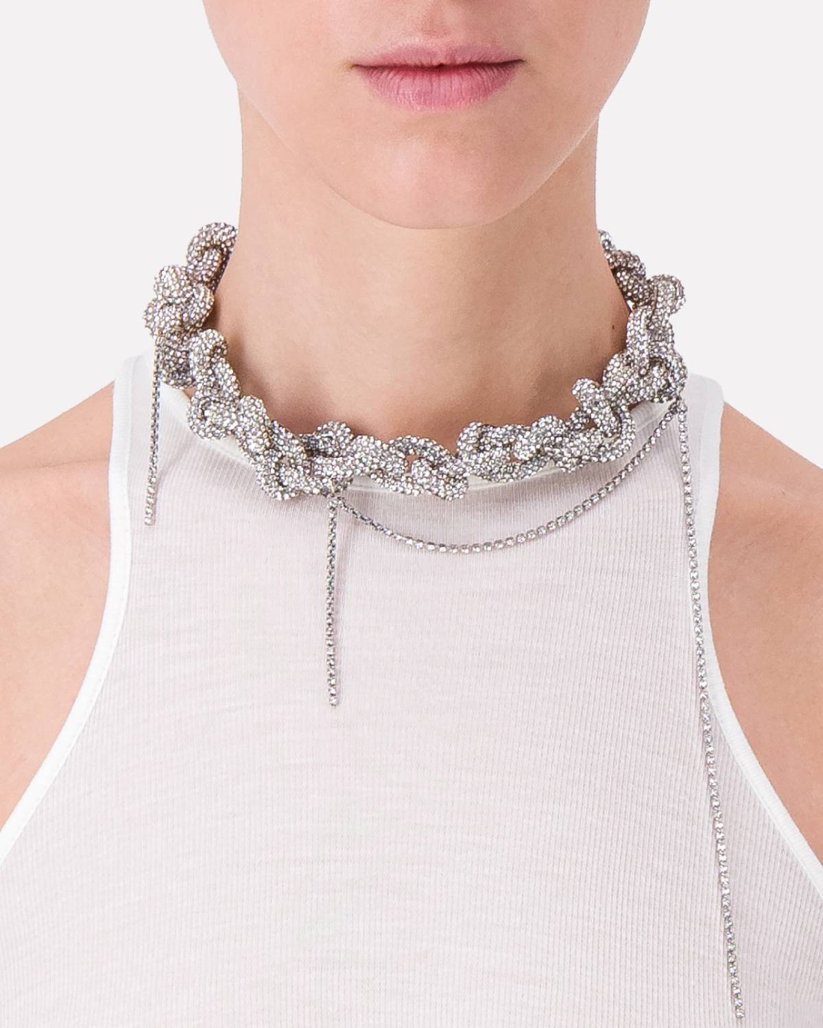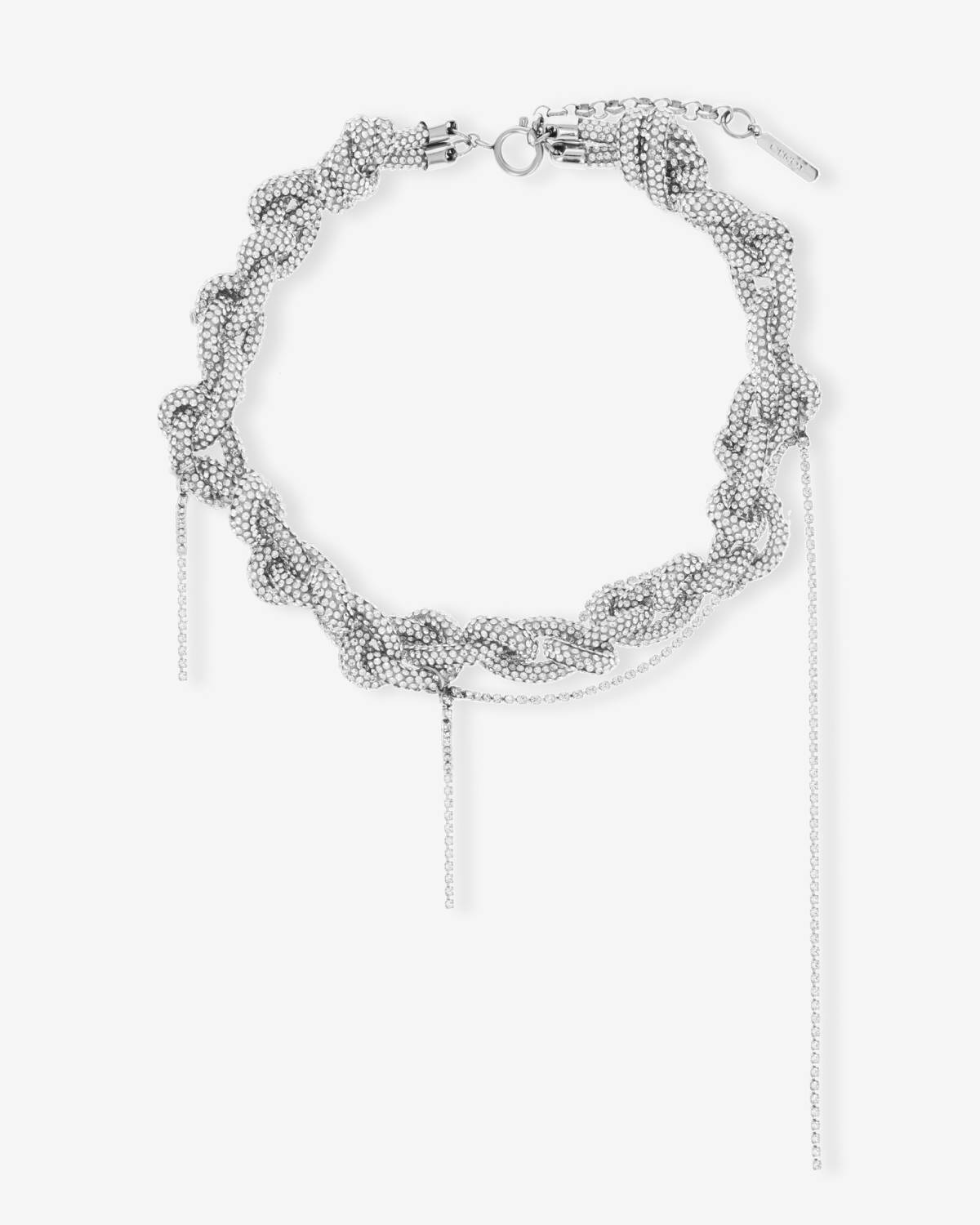 The Chrysta Choker by Justine Clenquet is a true statement piece crafted from palladium-plated brass. Bold, braided links meet delicate dangling chains – a striking mix of cool-girl energy and elegant edge.