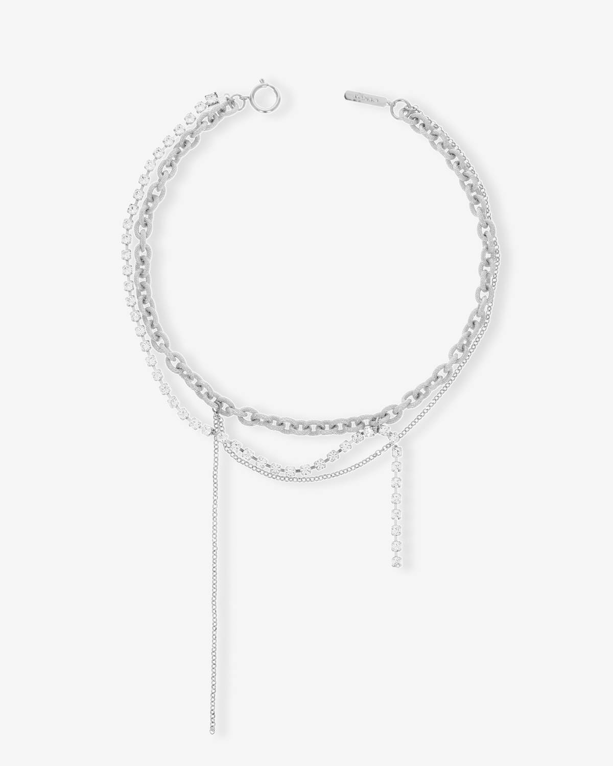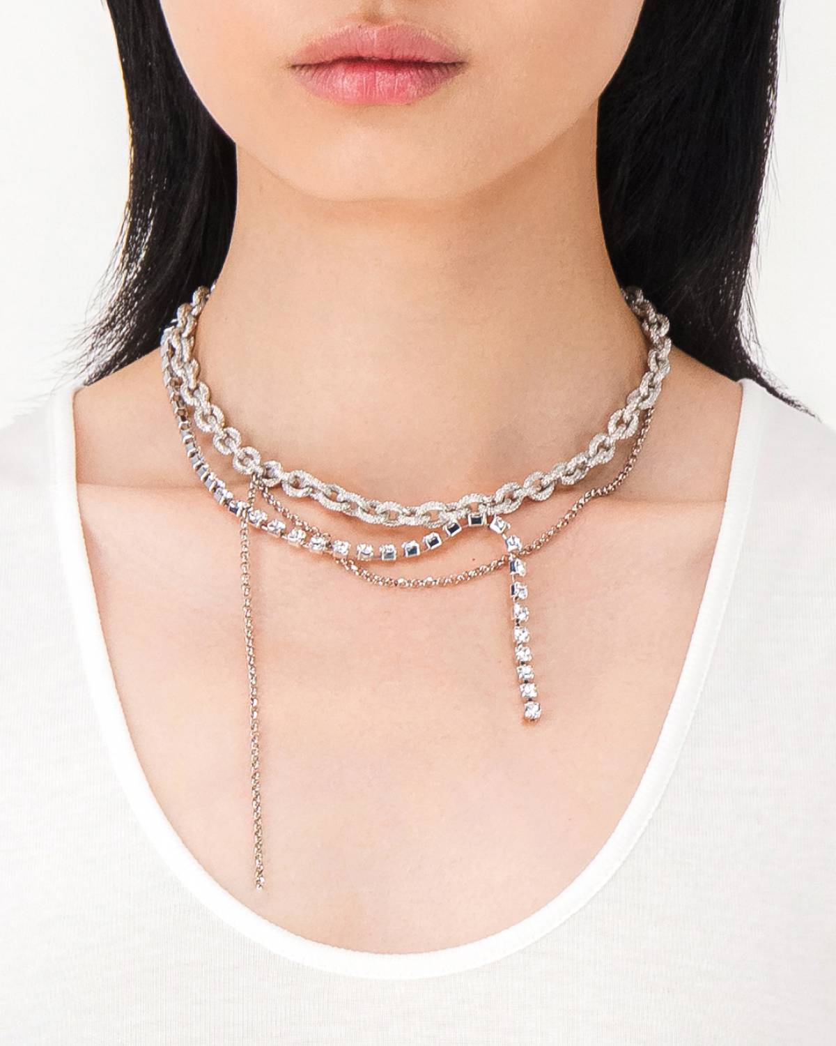 Chunky meets delicate: The Daisy Necklace by Justine Clenquet plays with contrasts. Multiple layers of chains – some bold, some fine – dance around your neck, all shimmering in sleek palladium.